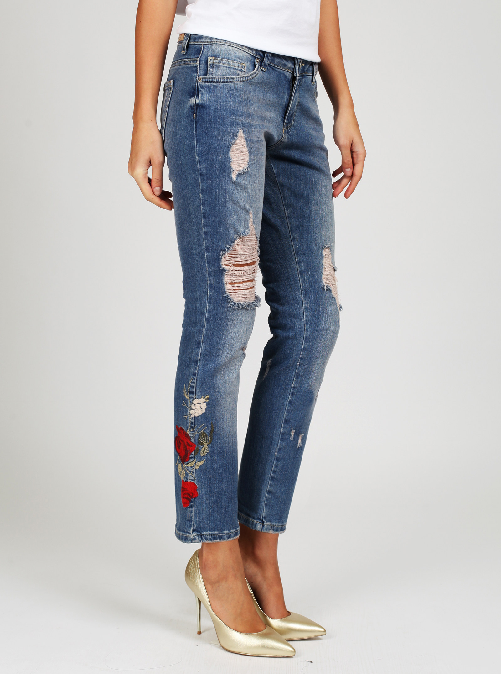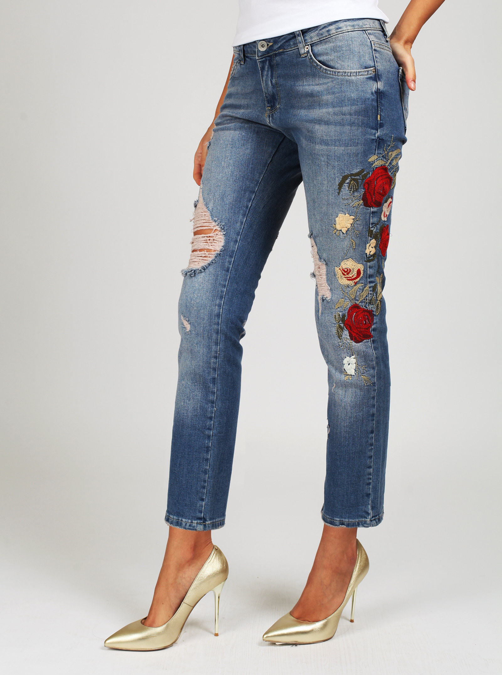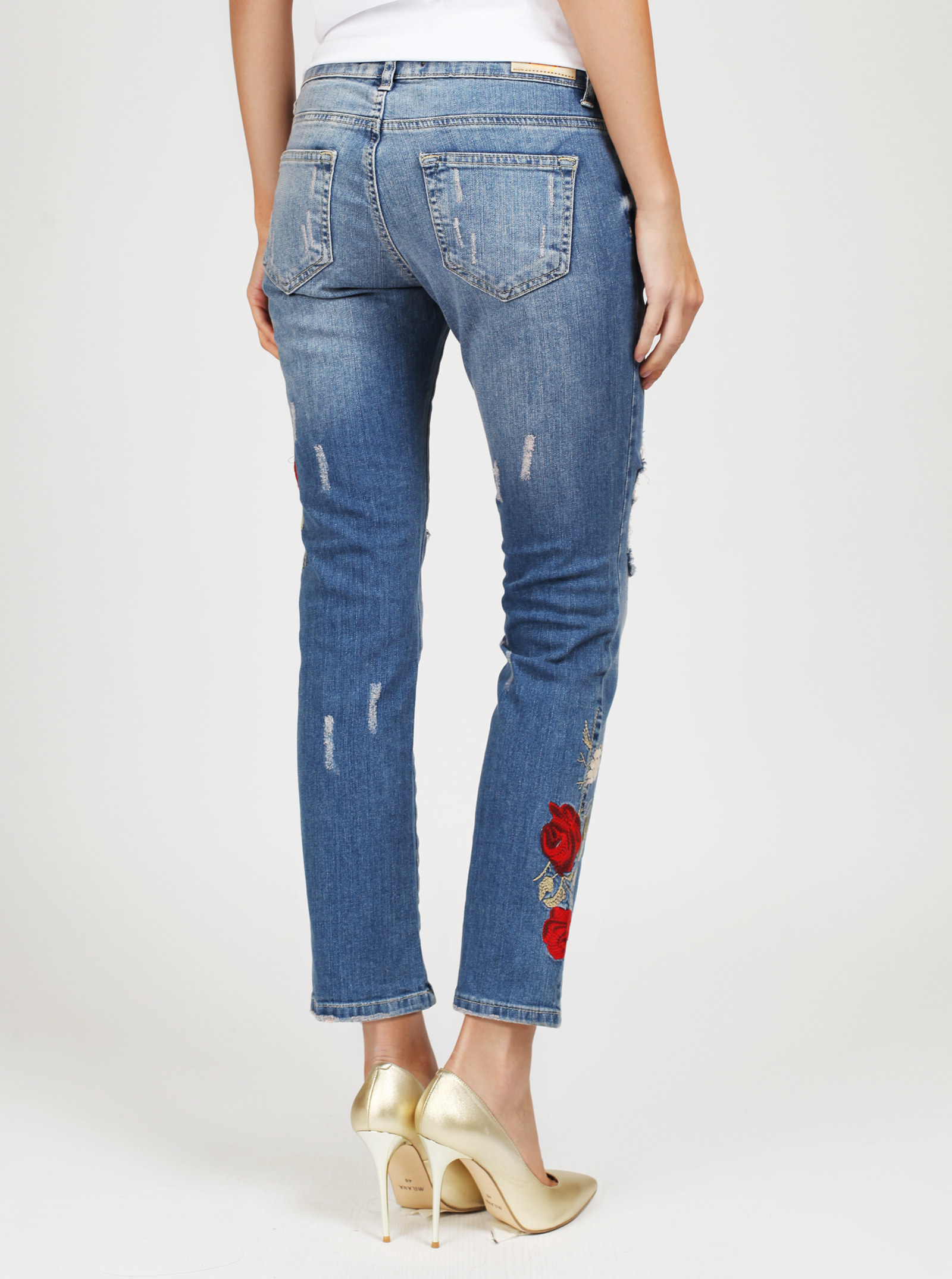 Фирменный фит LILY. Джинсы винтажного оттенка со средней посадкой полуприлегающего силуэта с трендовыми вышивками и дырами.