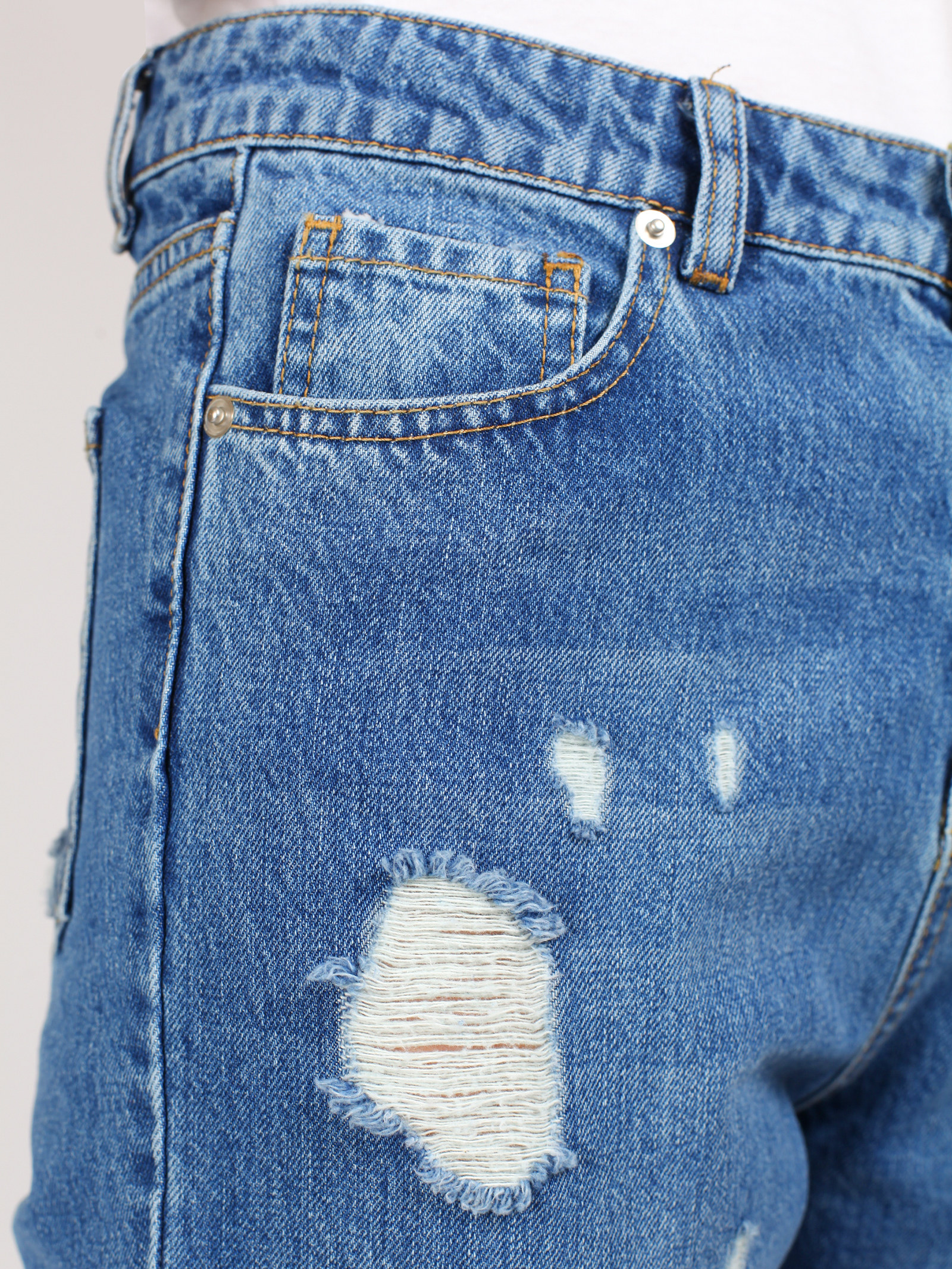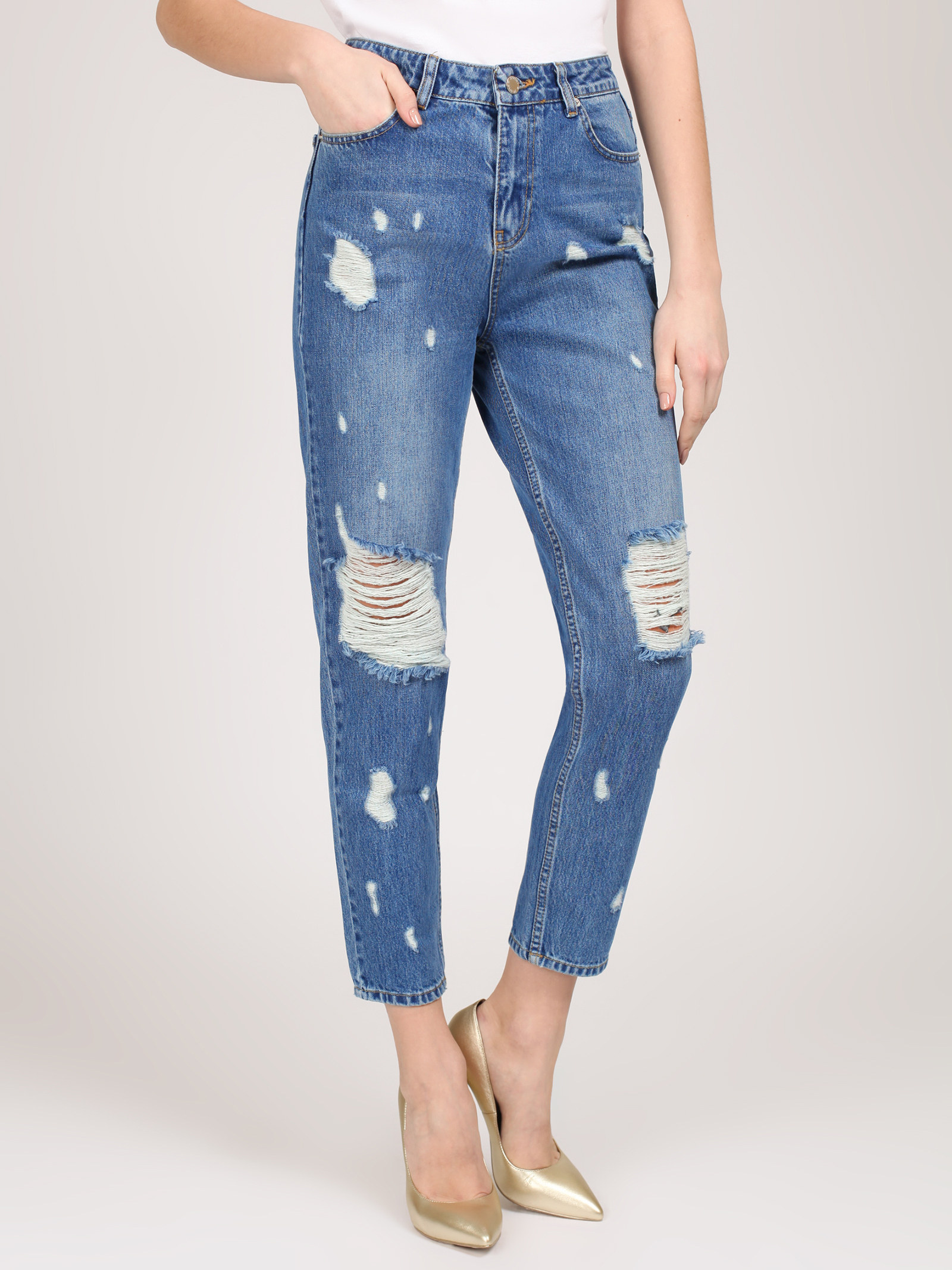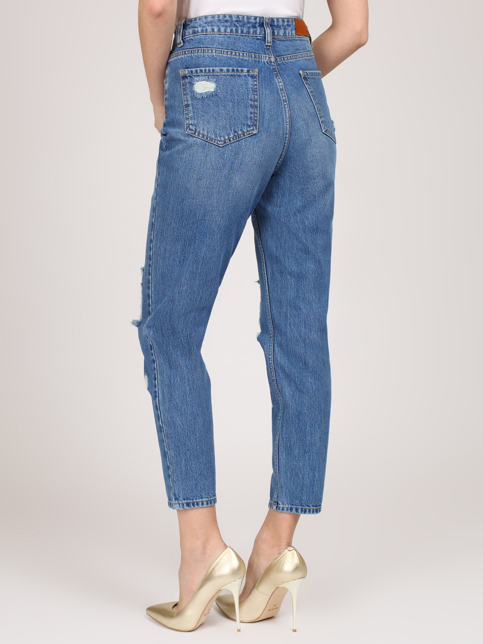 Фирменный фит MARY. Джинсы модного силуэта Mom с высокой посадкой и трендовыми потертостями и дырами. Выполнены из хлопка.