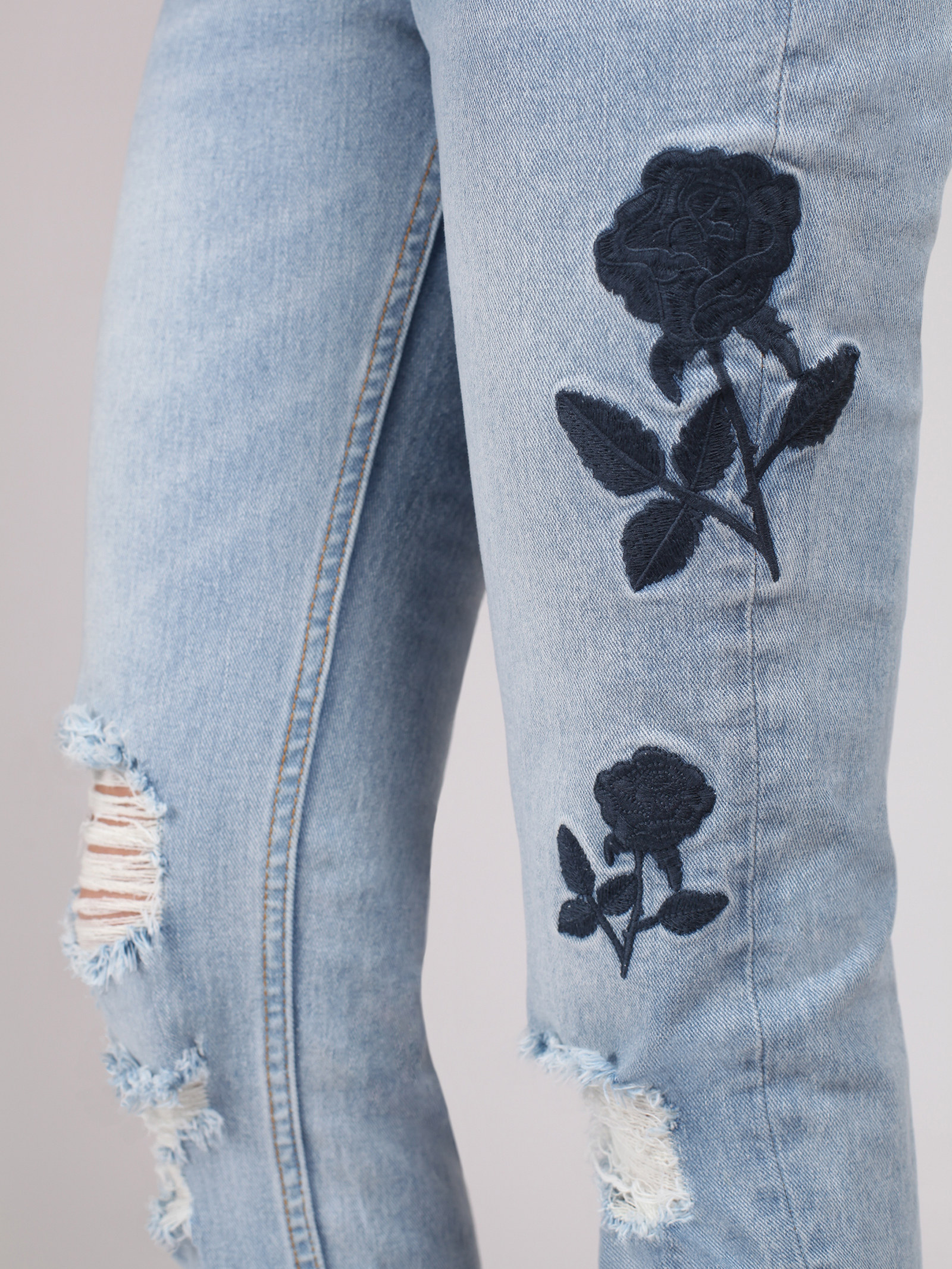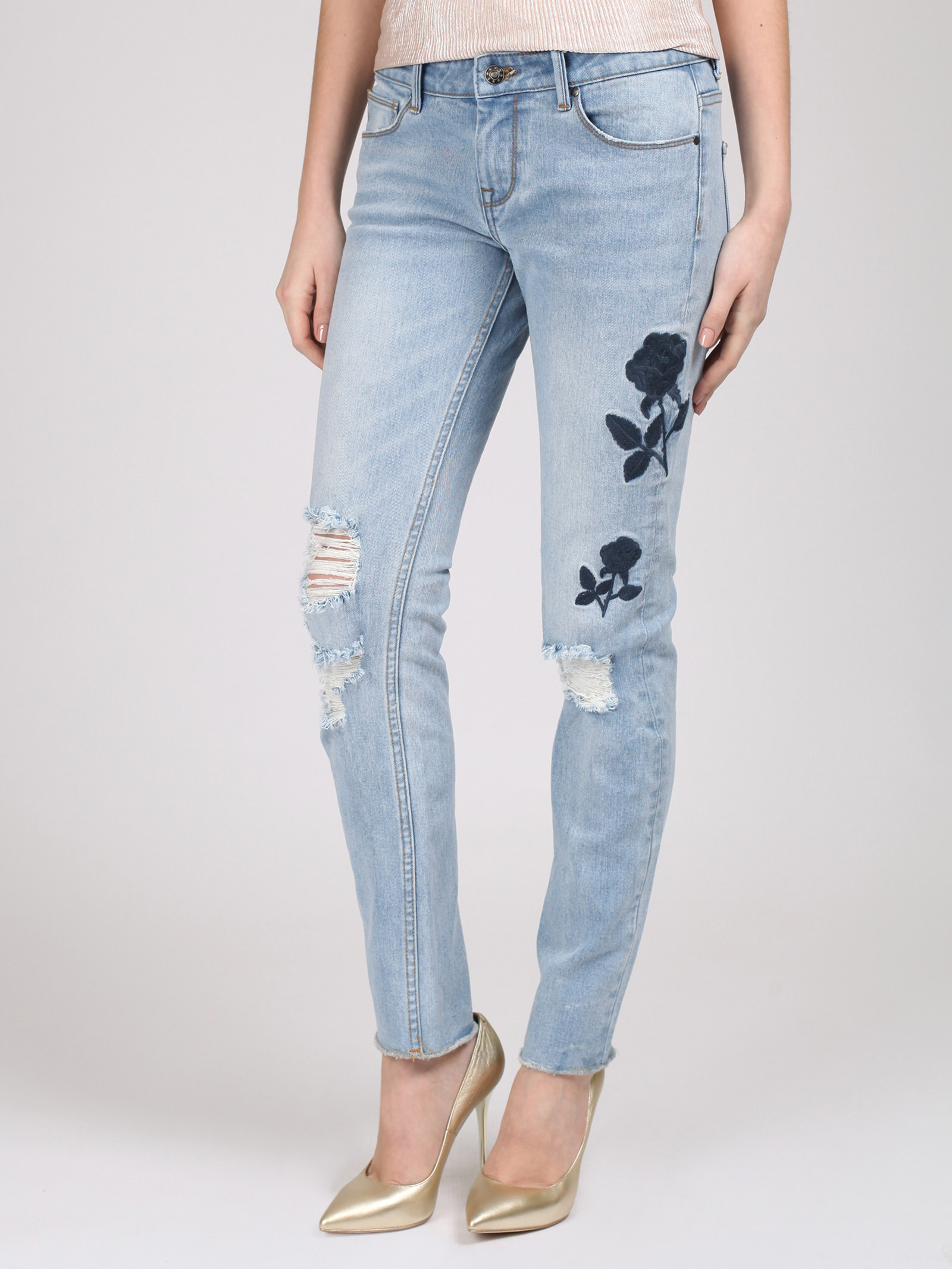 Фирменный фит SCARLET. Джинсы облегающего силуэта с трендовой вышивкой. Подчеркивают фигуру, слегка расширяясь книзу. Модель выполнена из ткани с эластаном.