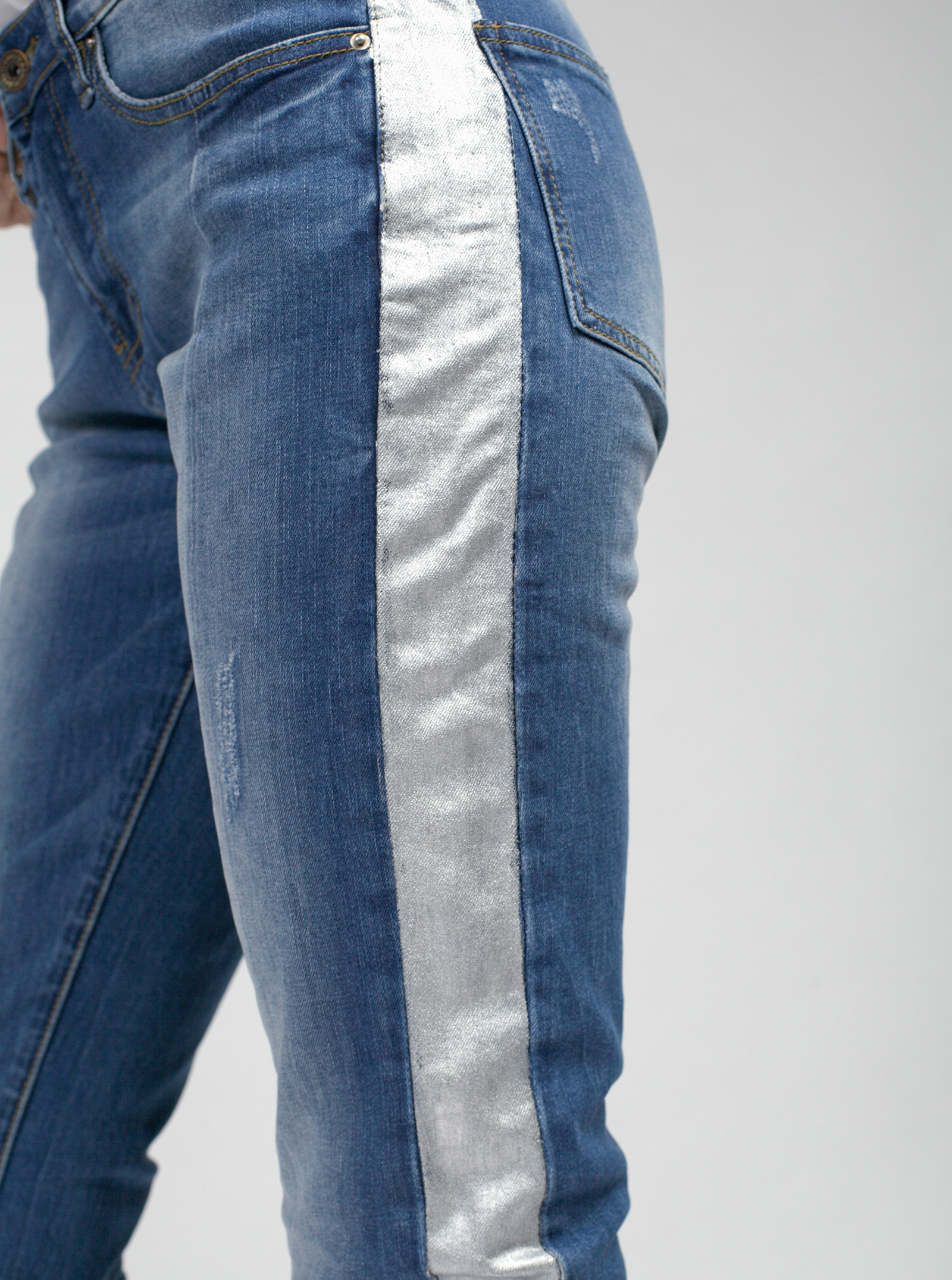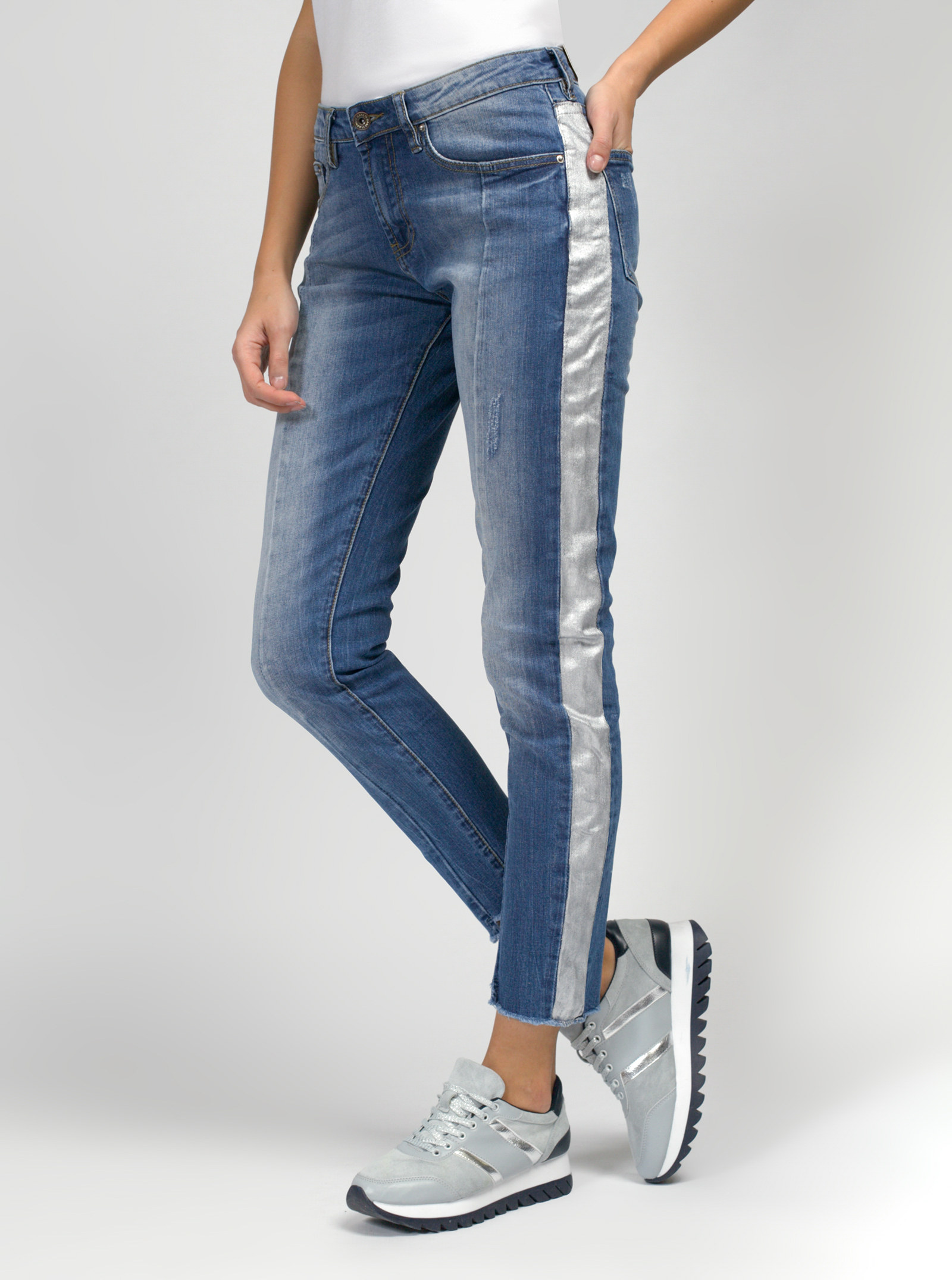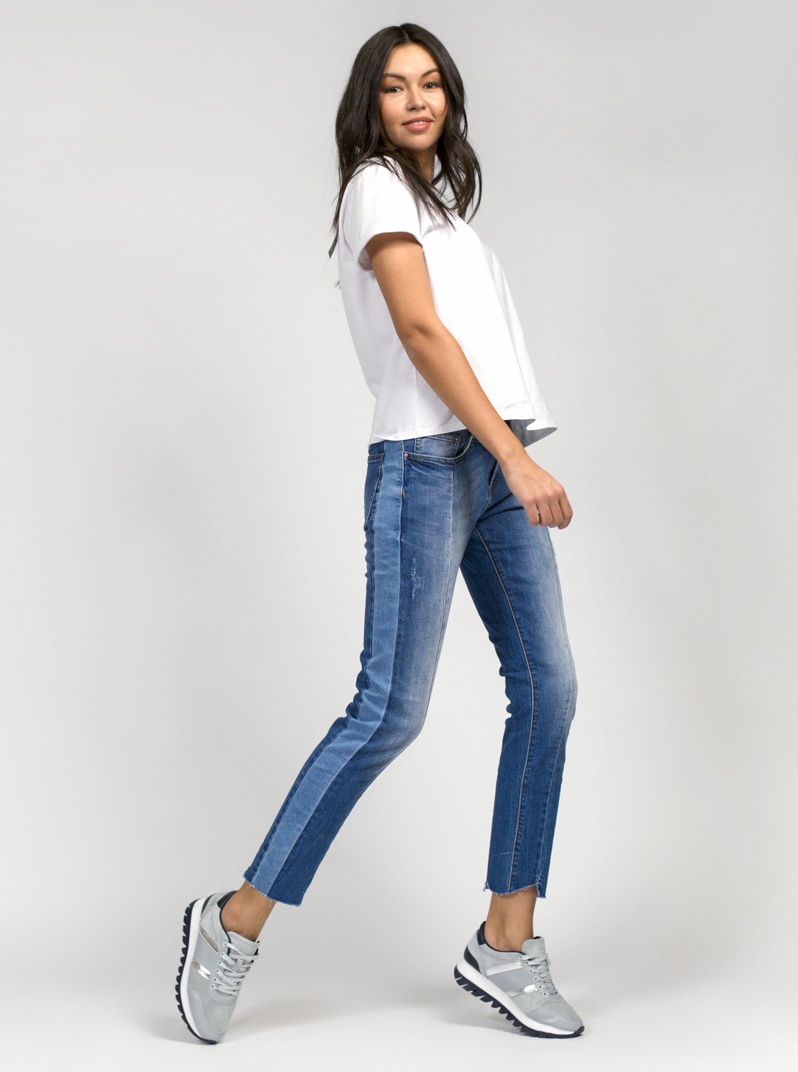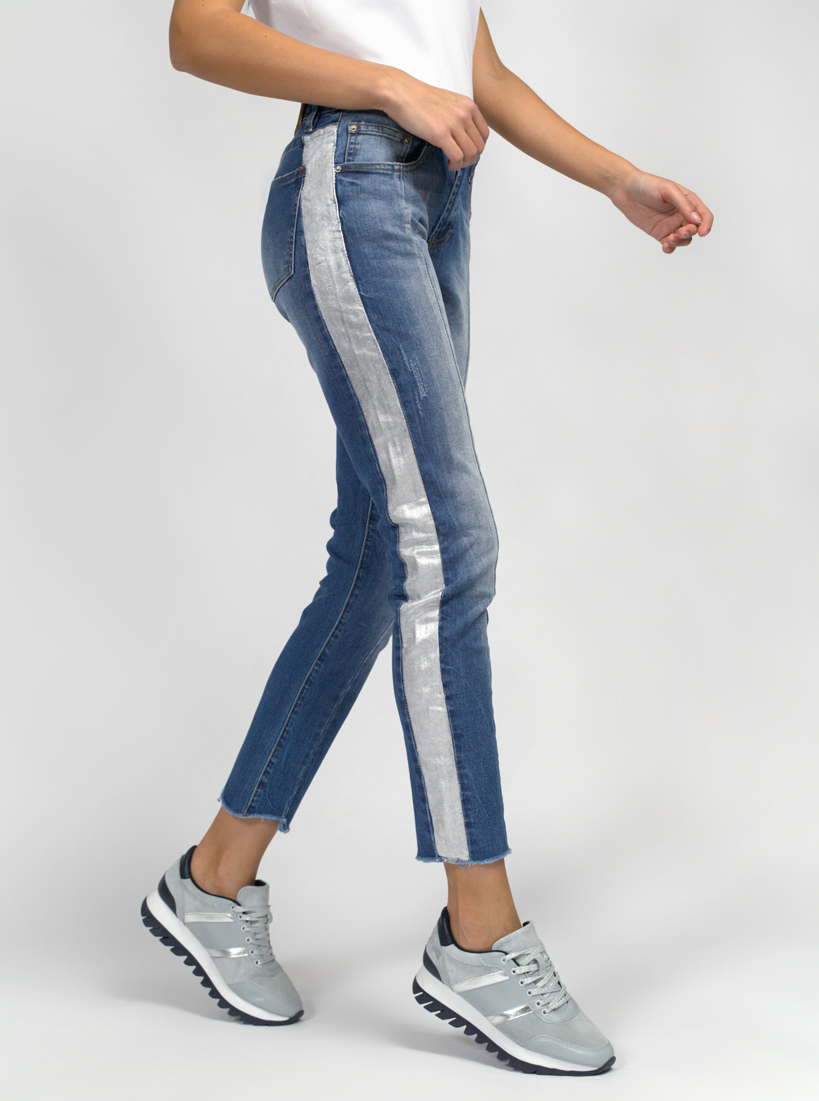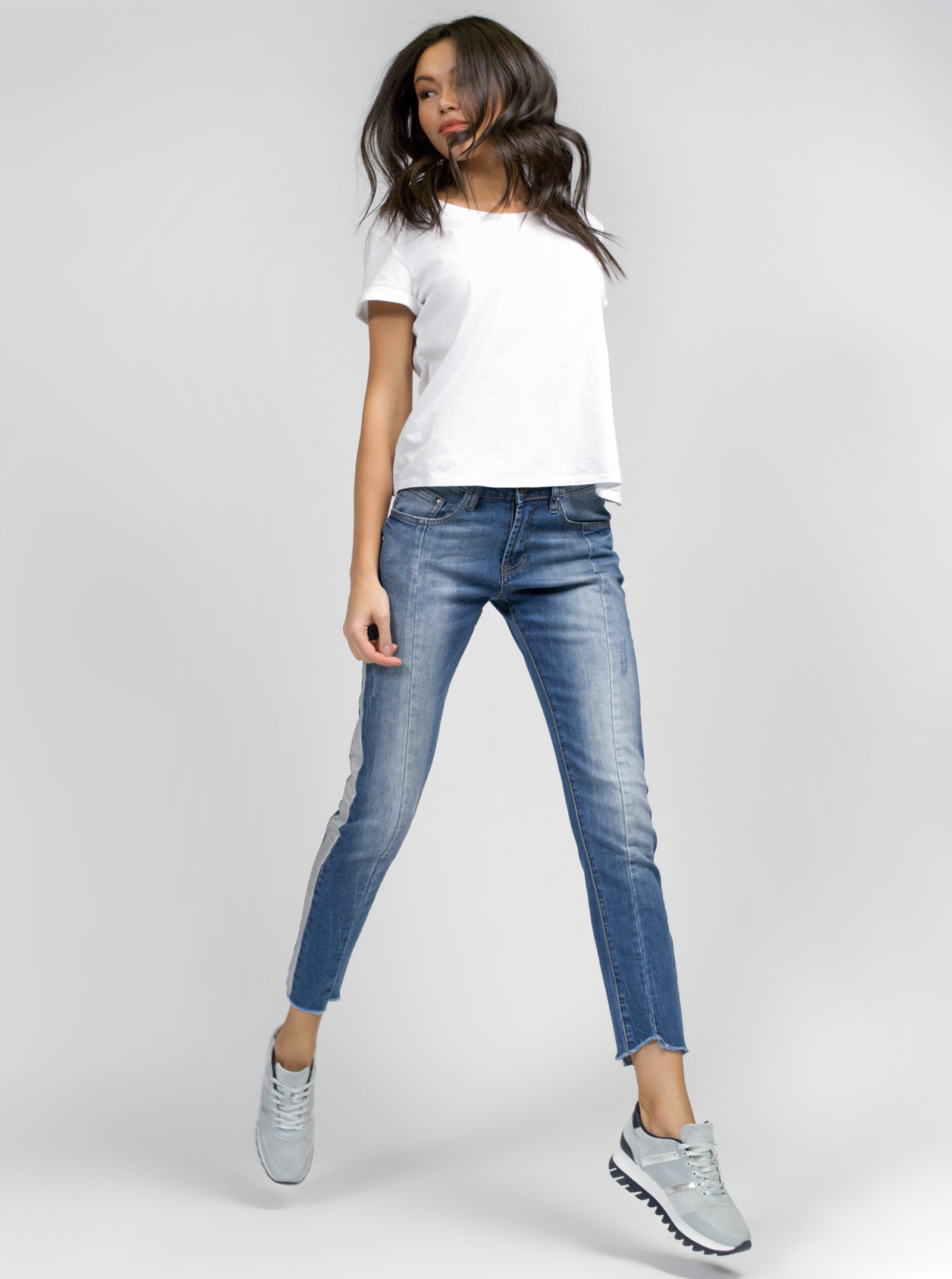 Фирменный фит CINDY. Джинсы-сигареты полуприлегающего силуэта со средней посадкой. По бокам модные вставки-лампасы. Выполнены из хлопка с эластаном.