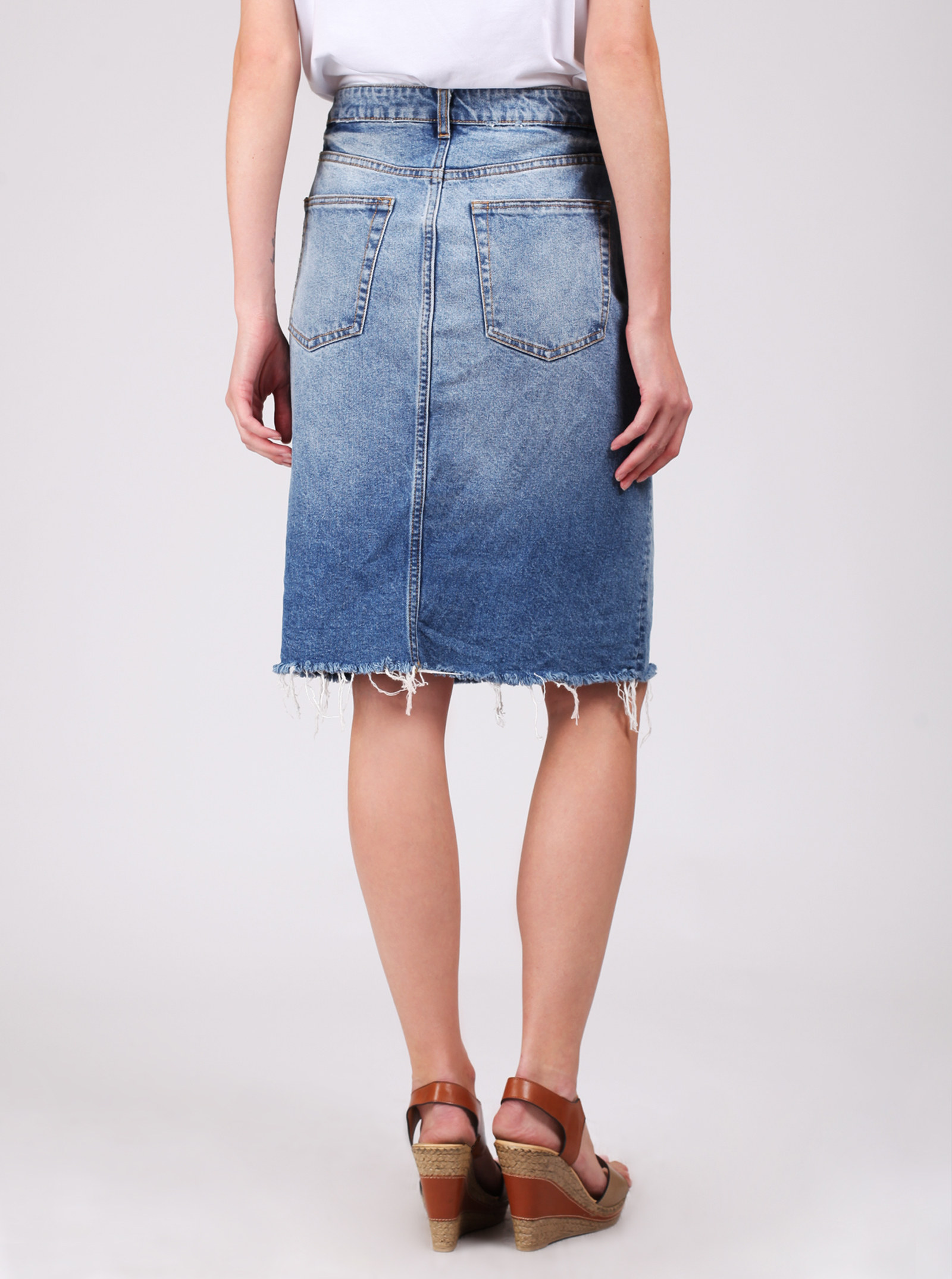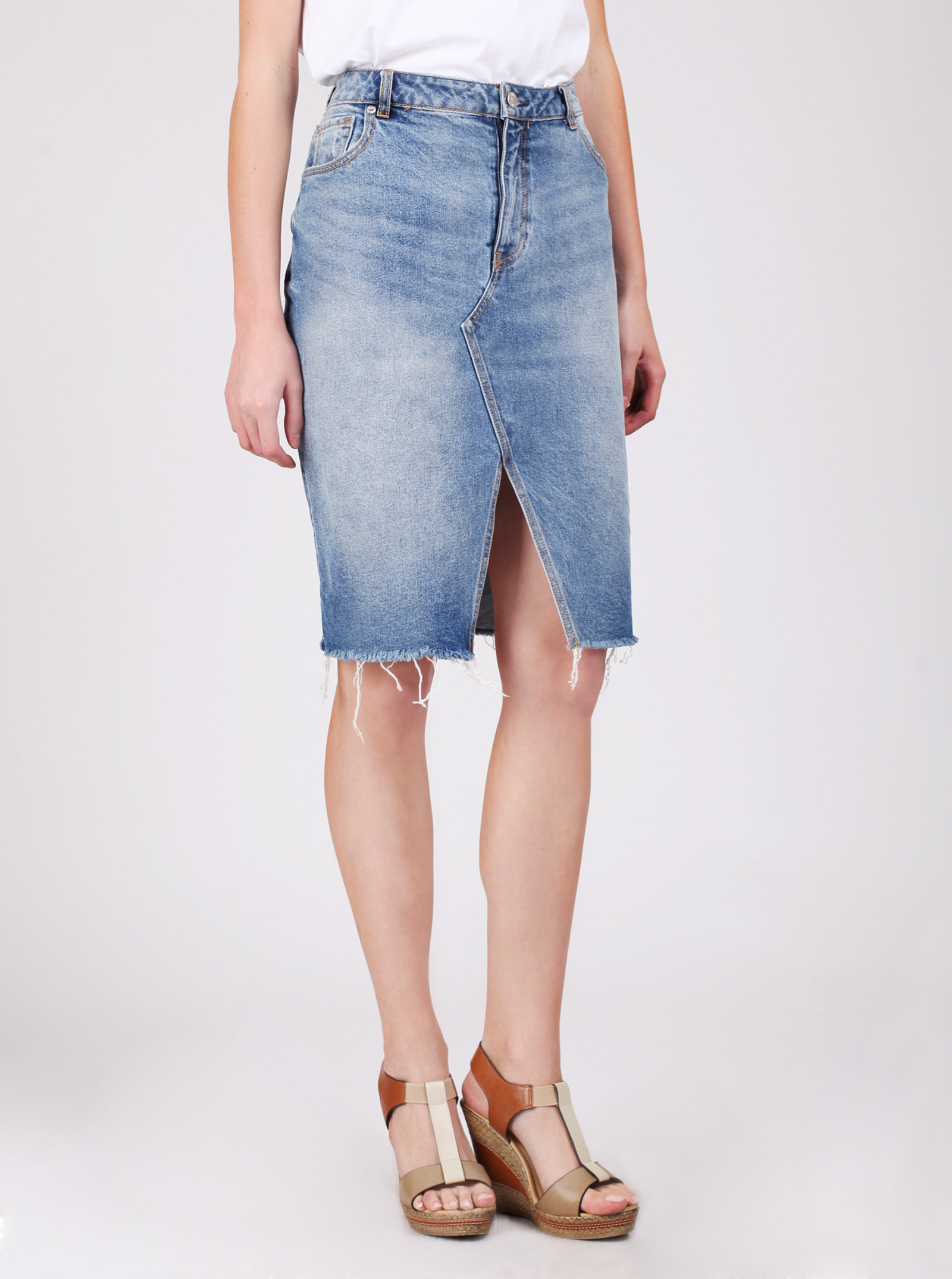 Юбка-трапеция с высокой посадкой и разрезом спереди. Модель выполнена из хлопковой ткани.