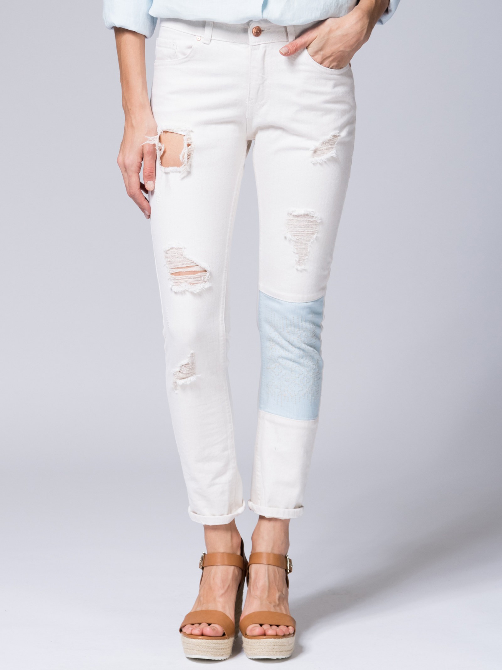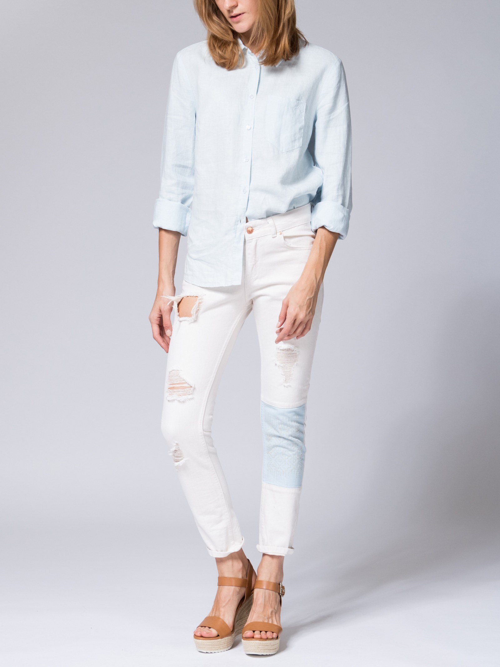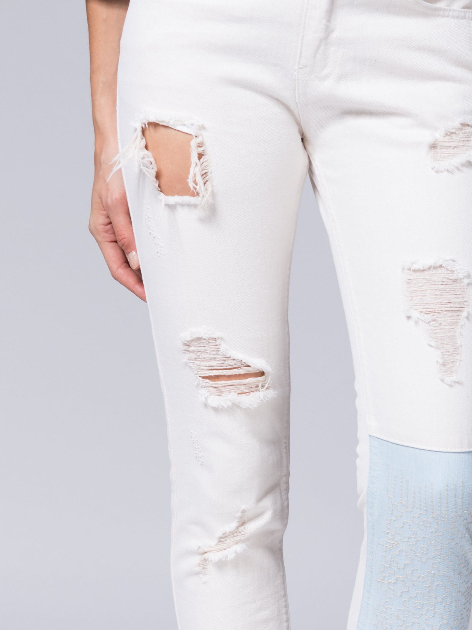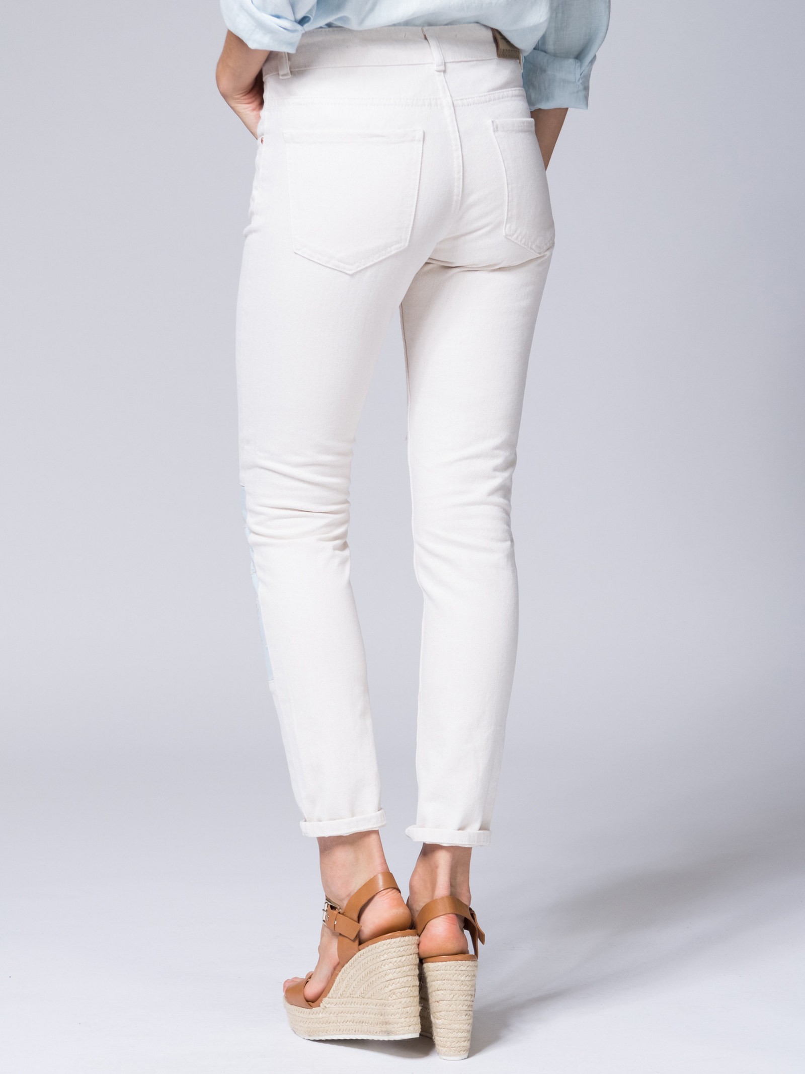 Джинсы со средней посадкой, облегание по бедрам и ногам.