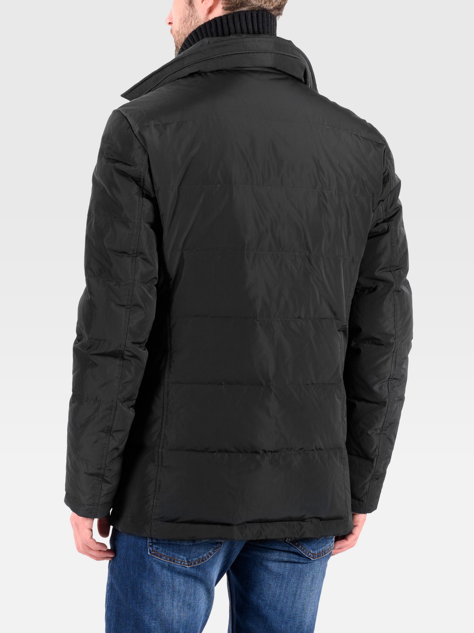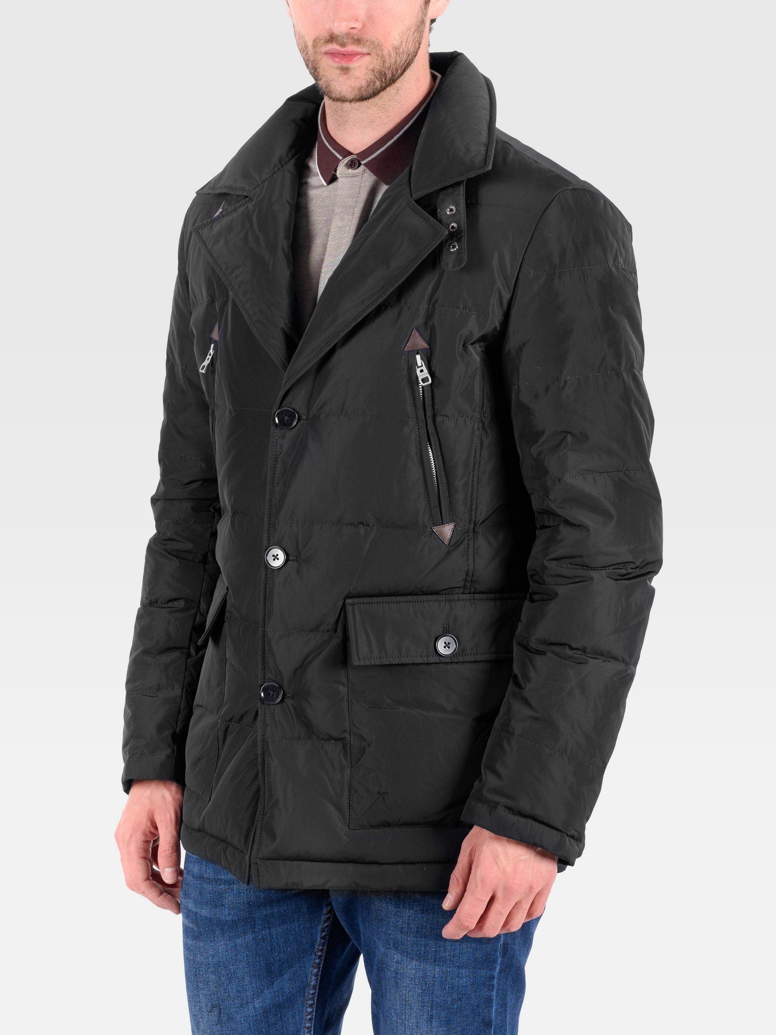 Мужская стеганная куртка на пуху, прямого силуэта. Куртка с английским воротником и съемным пластроном с трикотажным воротником-стойкой крупной вязки. Выполнена куртка из качественного материала. Застегивается на пуговицы, пластрон на молнии. Впереди имеются прорезные нагрудные карманы на молниях и нижние накладные карманы с клапанами на пуговицах. На подкладке располагаются внутренние карманы. Куртка представлена в двух актуальных цветах.