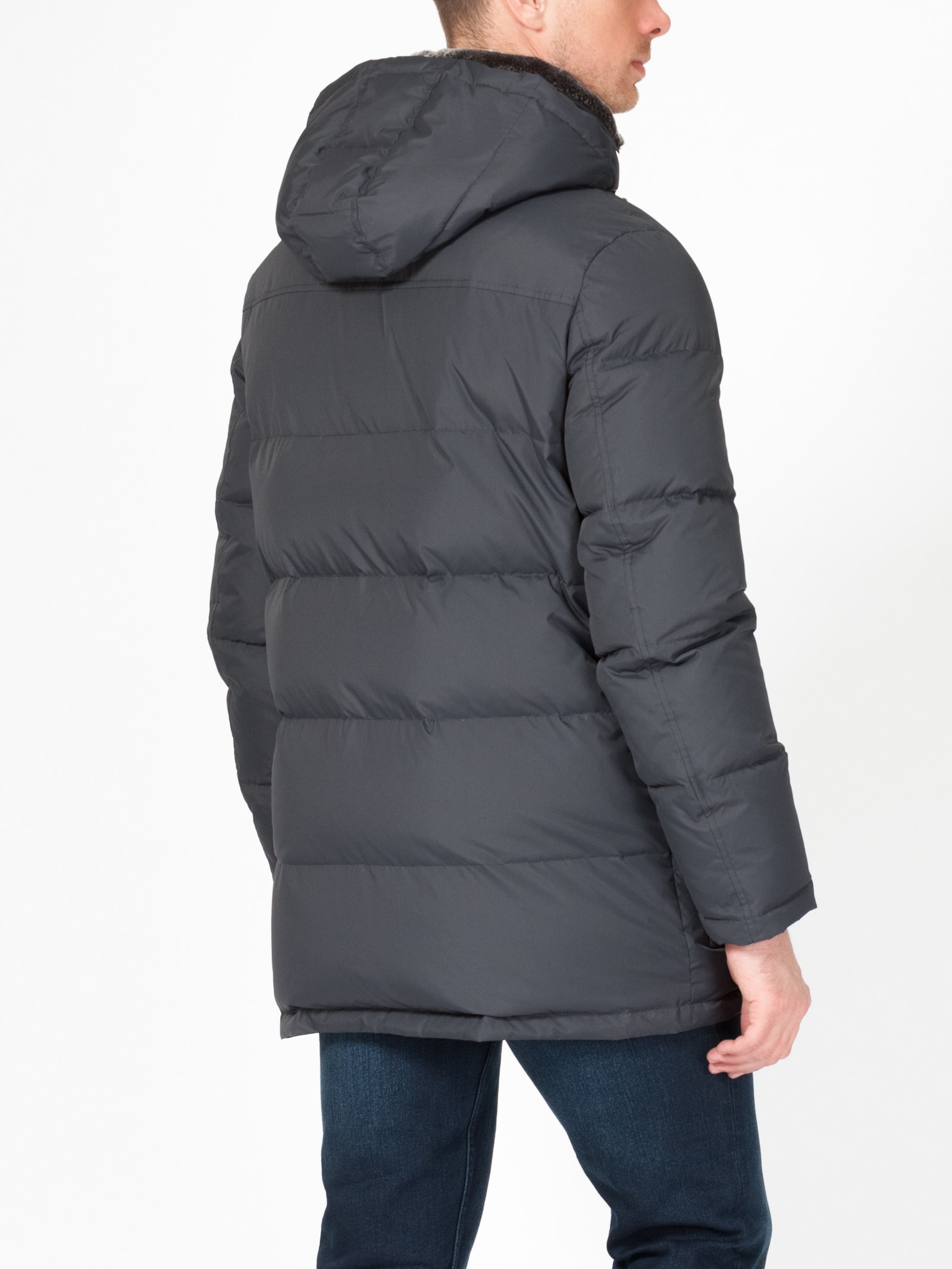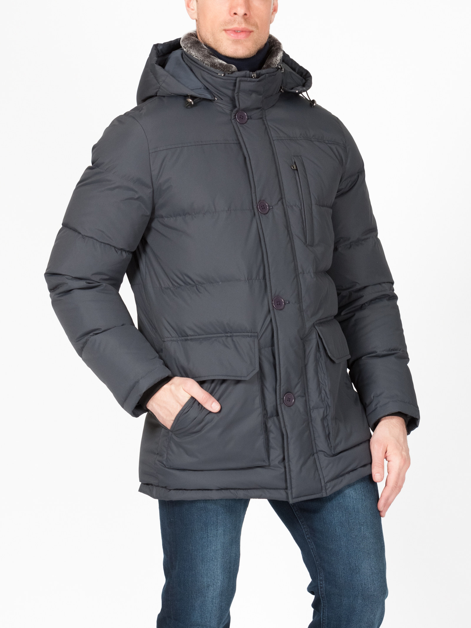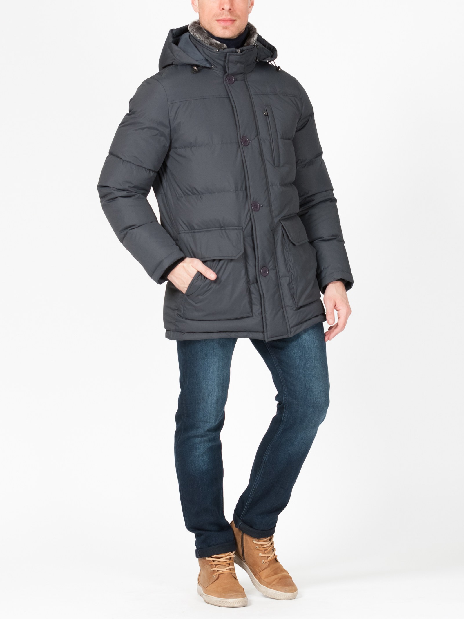 Мужская удлиненная стеганная куртка на пуху, прямого силуэта. Куртка со съемным капюшоном, воротником-стойкой и съемным воротником из искусственного меха. Выполнена из качественного материала. Застегивается на молнию, пуговицы и кнопки. Впереди имеется прорезной нагрудный карман на молнии и нижние накладные карманы с клапанами на кнопках. На рукавах внутренние эластичные манжеты. На подкладке располагаются внутренние карманы. Куртка представлена в двух актуальных цветах.