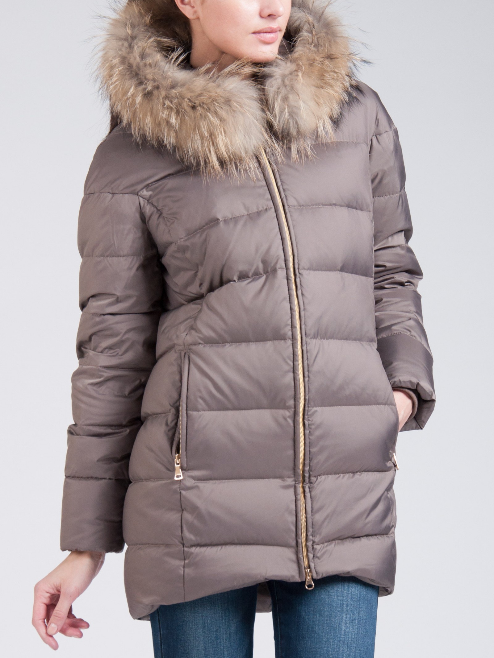 Женское стеганное пальто на пуху, модного О-образного силуэта с несъемным капюшоном и объемной съемной оторочкой из натурального меха енота. Низ пальто неровный- впереди немного короче, чем сзади. Пальто выполнено из качественного материала, застегивается на молнию. Впереди имеются вместительные карманы в швах на молниях. На рукавах внутренние эластичные манжеты. Фурнитура металлическая блестящая, молнии также покрашены в цвет металла. Пальто представлено в трех актуальных цветах