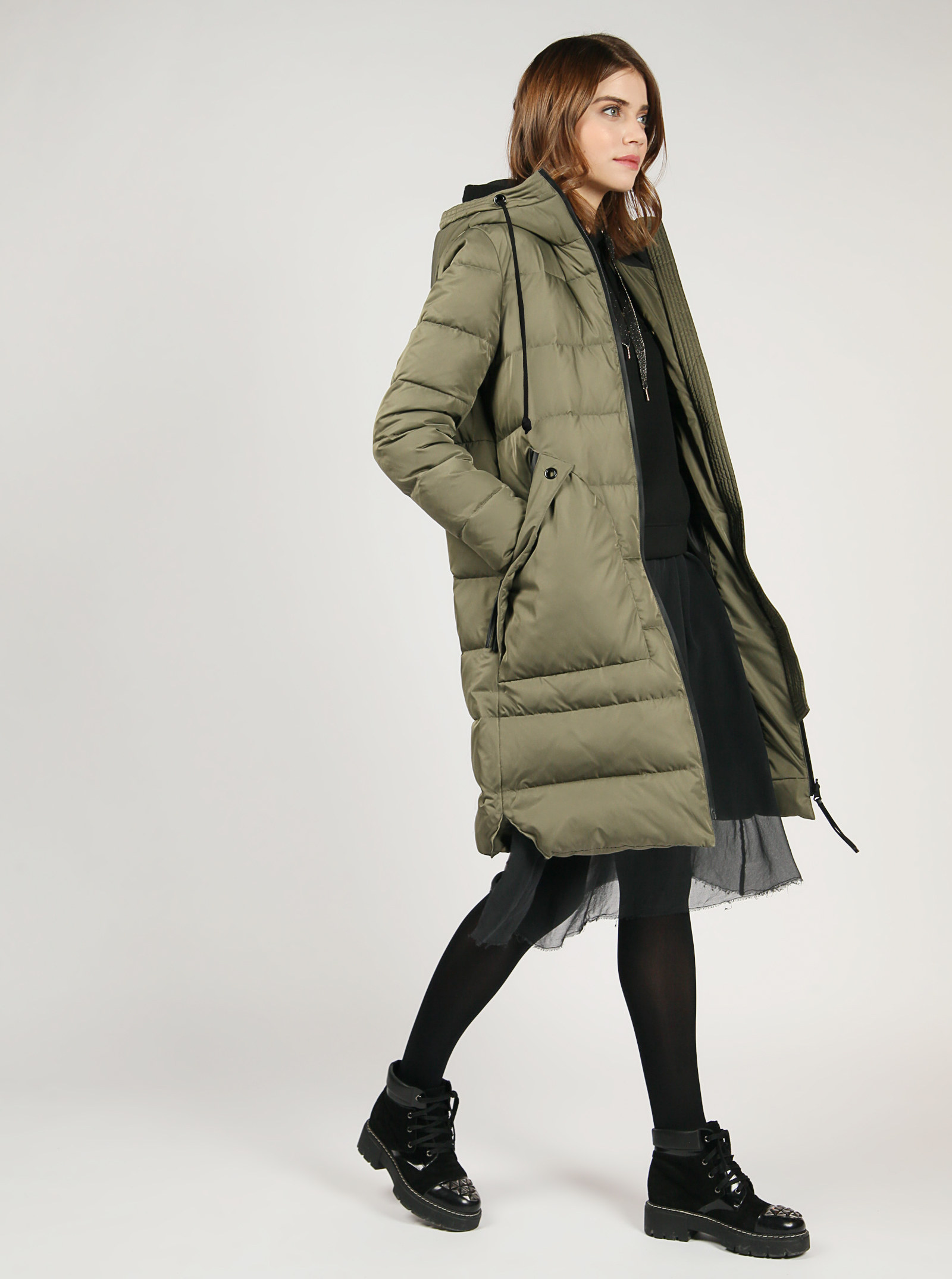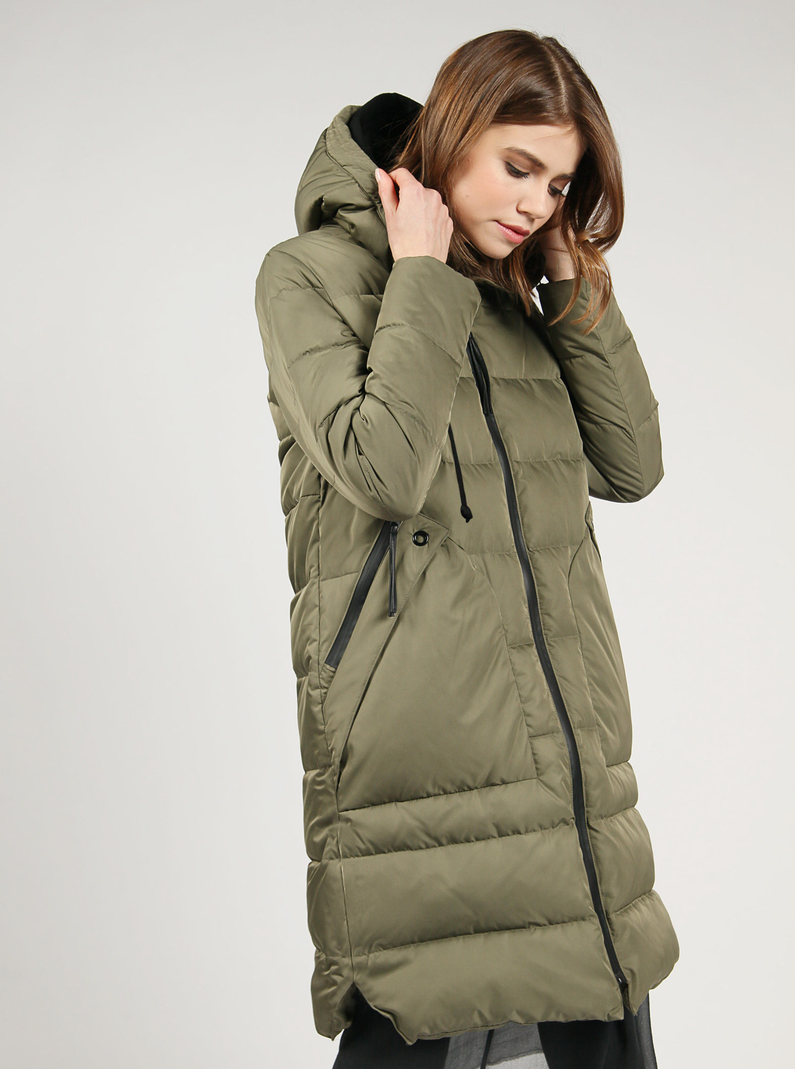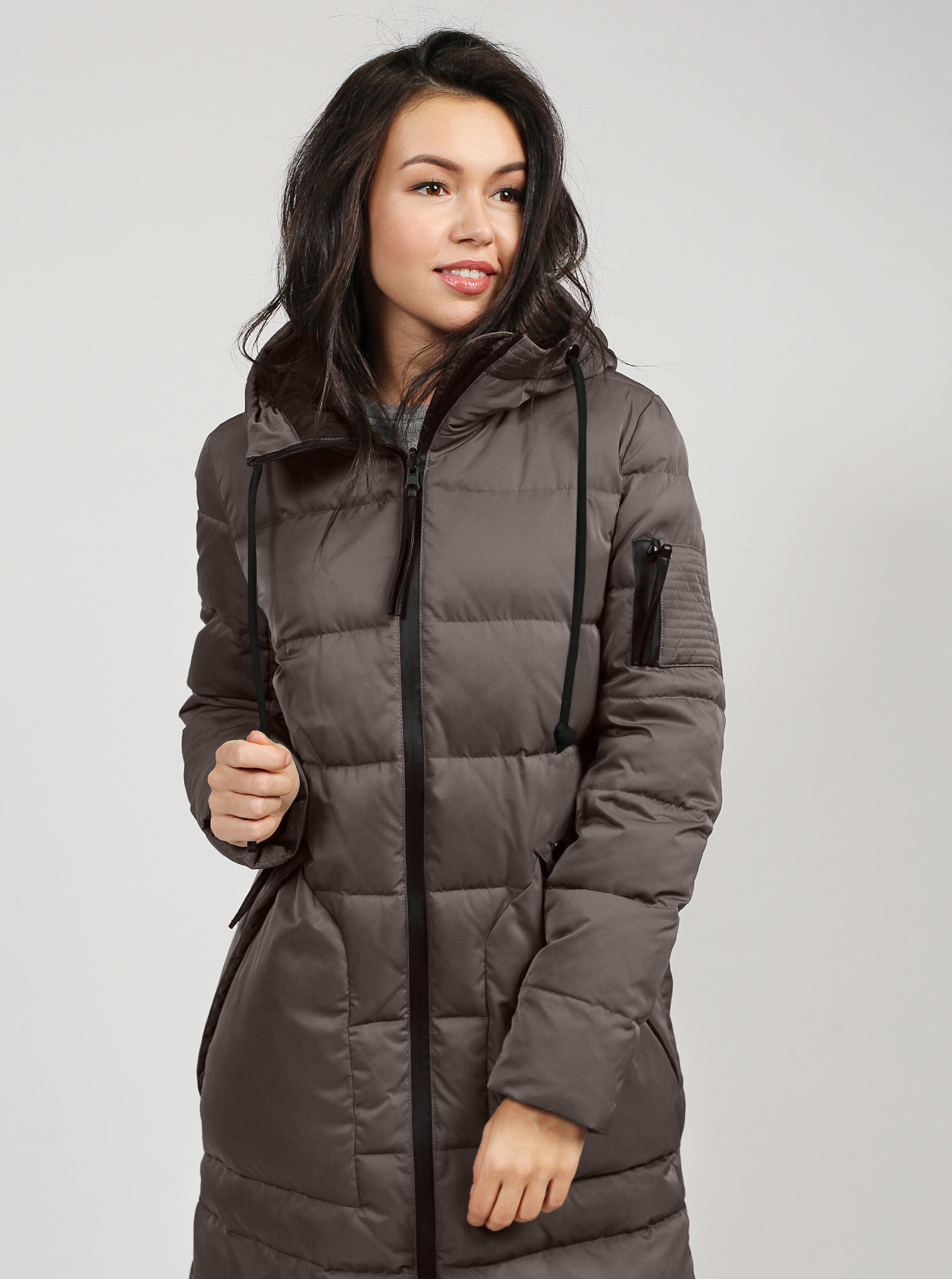 Стильная стеганая куртка прямого силуэта, длина чуть ниже колена. Изделие набито высококачественным биопухом. Водонепроницаемые контрастные молнии тренд этого сезона. Большие удобные карманы декорированы отстроченной планкой и люверсами. В поддержку карманам на капюшоне тоже есть отстроченная деталь, кулиска и шнур. Подкладка Pongee черного цвета в тон контрастной фурнитуры.