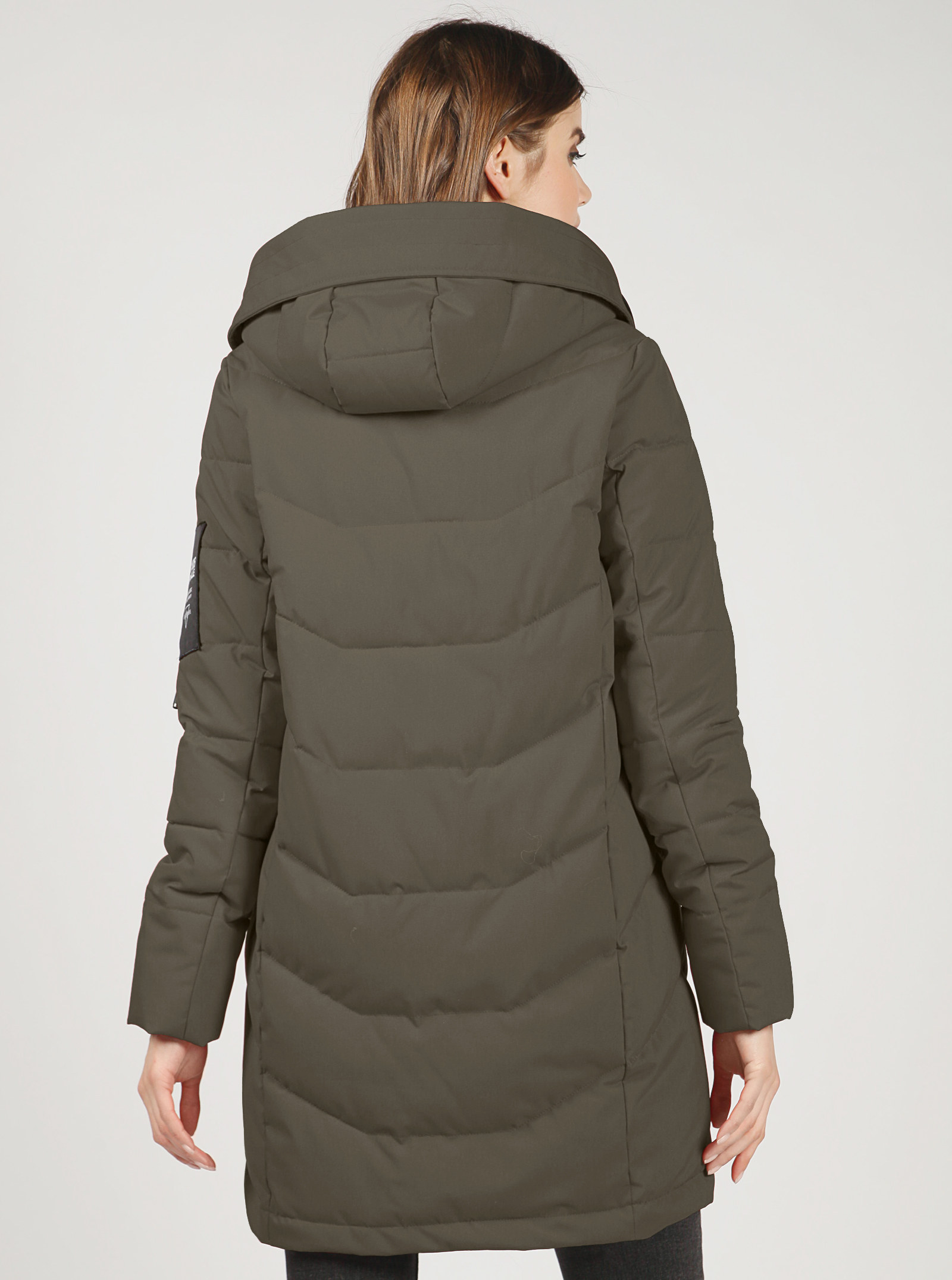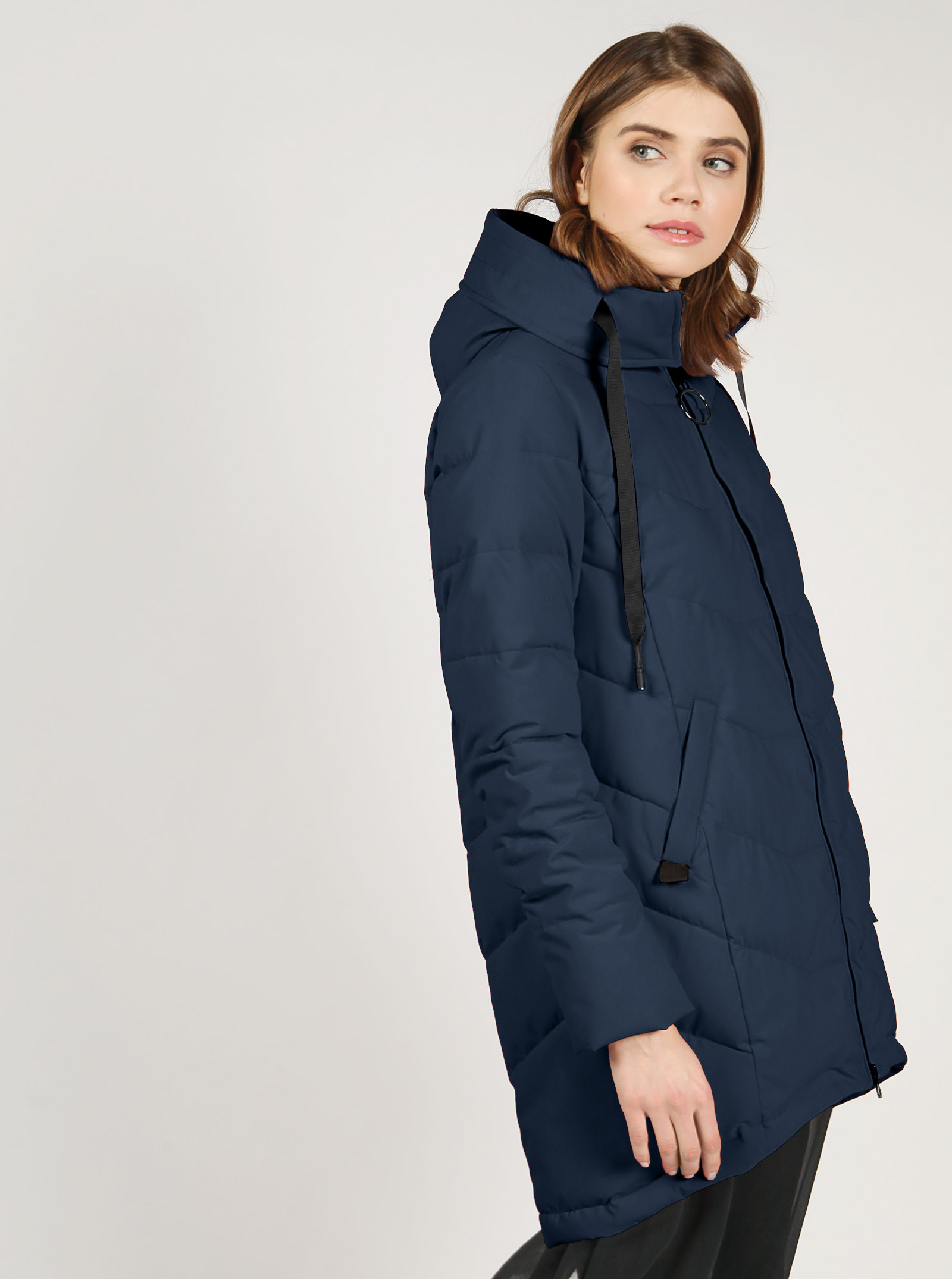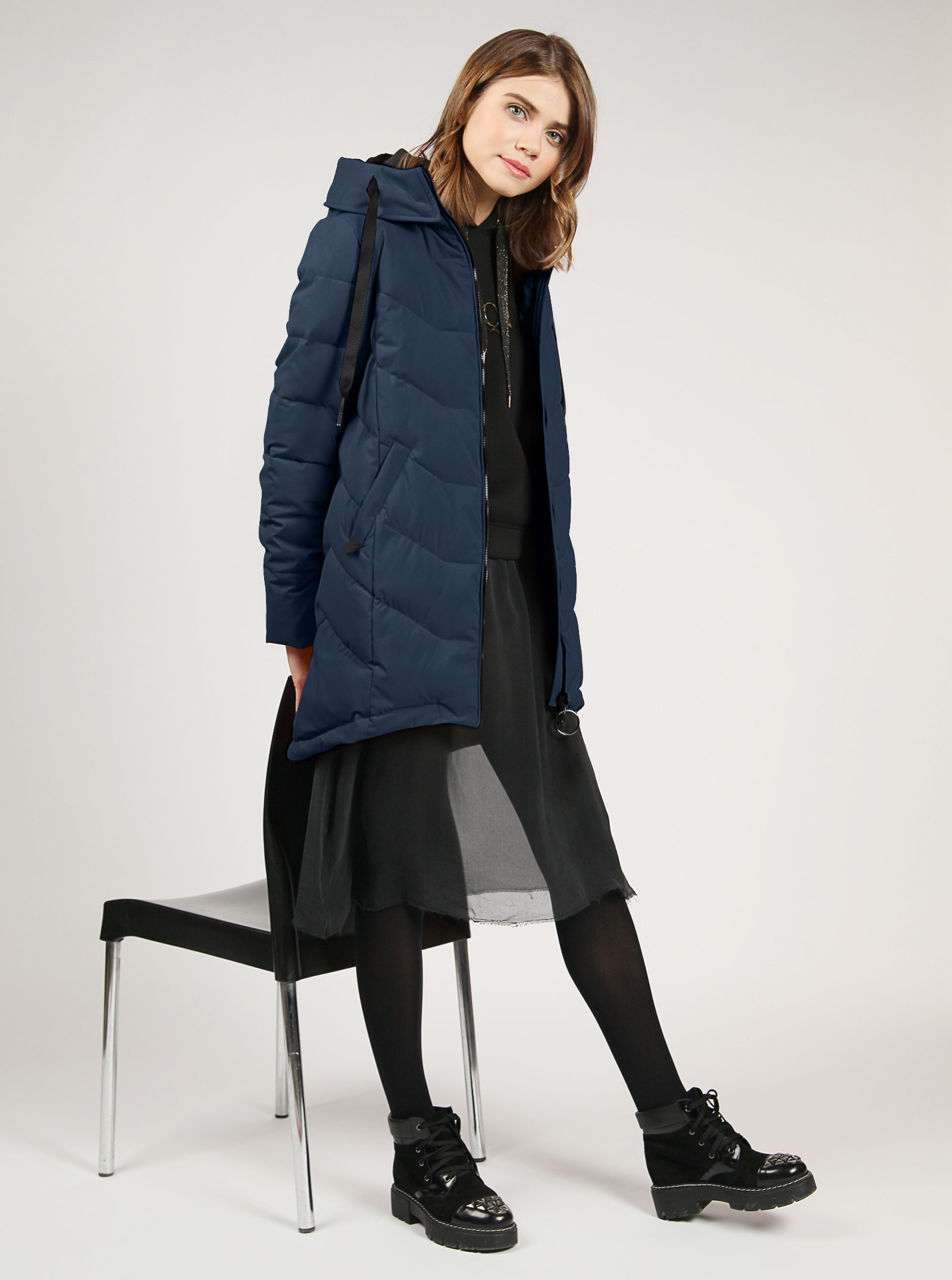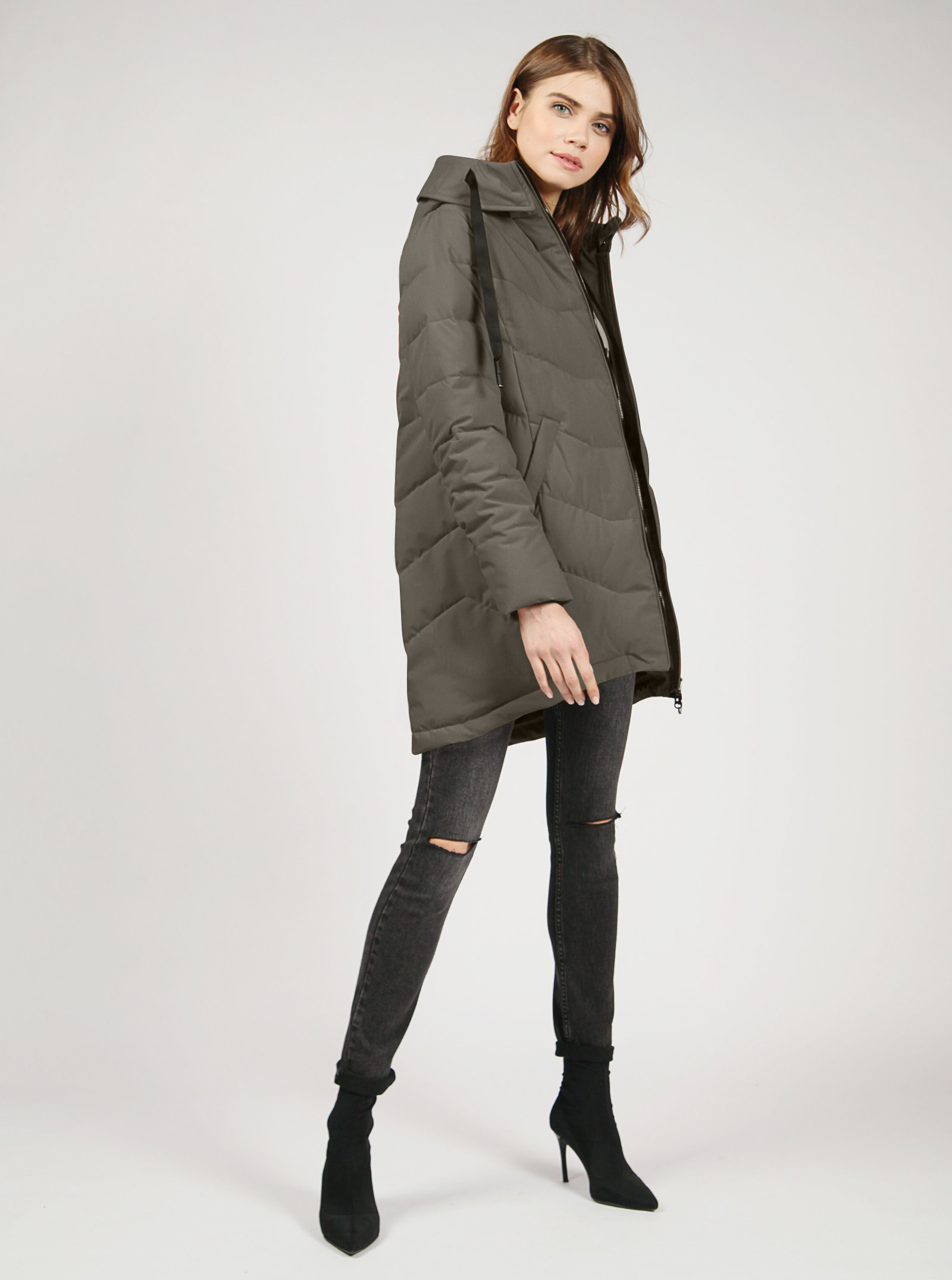 Стеганый пуховик прямого силуэта, длина до колен О-образным низом. Интересная стежка визуально стройнит фигуру. Застежка на молнию, внутри предусмотрена ветрозащитная планка. Контрастная фурнитура и подкладка выигрышно подчеркивает современный дизайн модели. Изделие выполнено из плотной матовой ткани с ветро и водоотталкивающим покрытием.