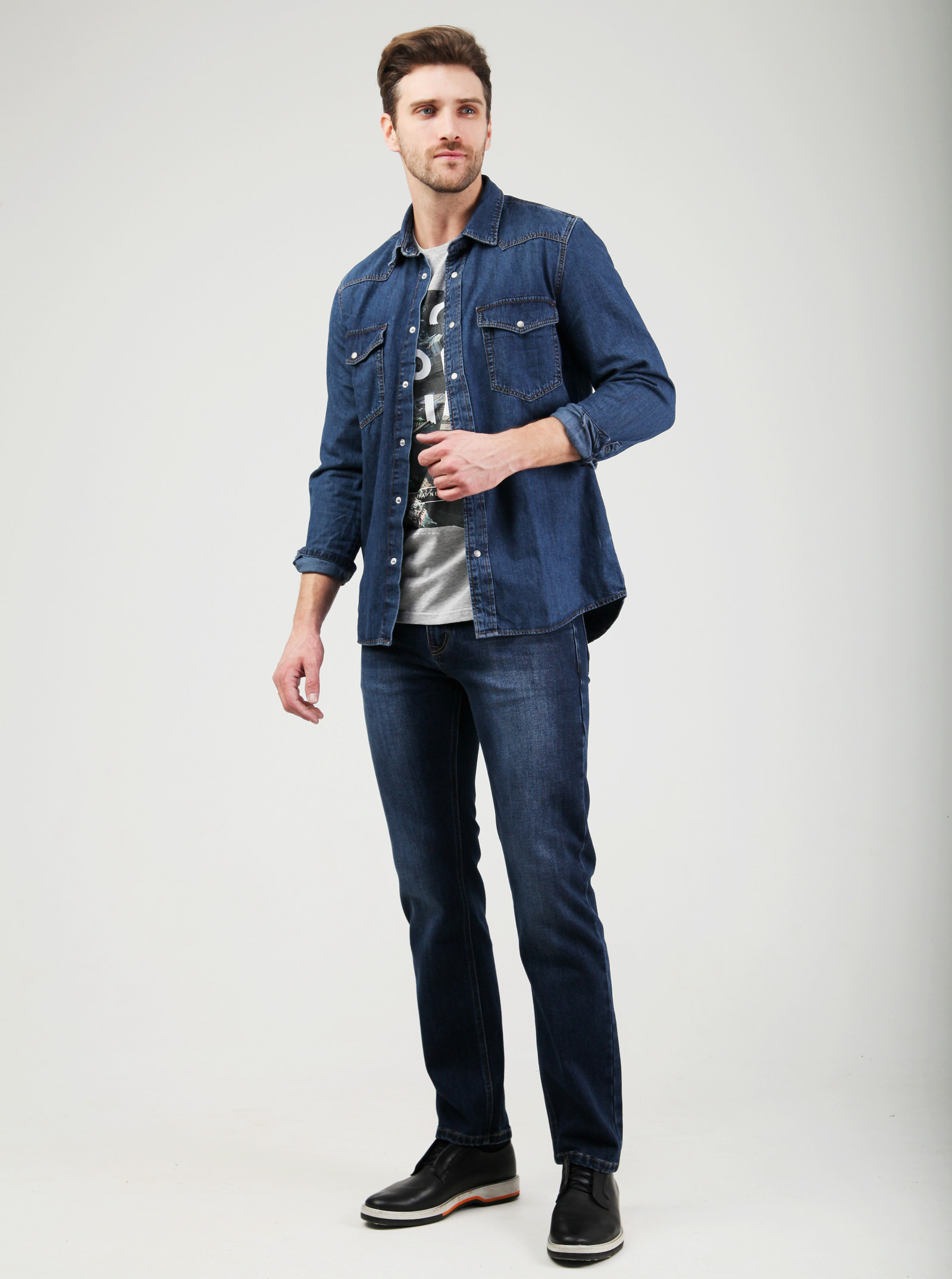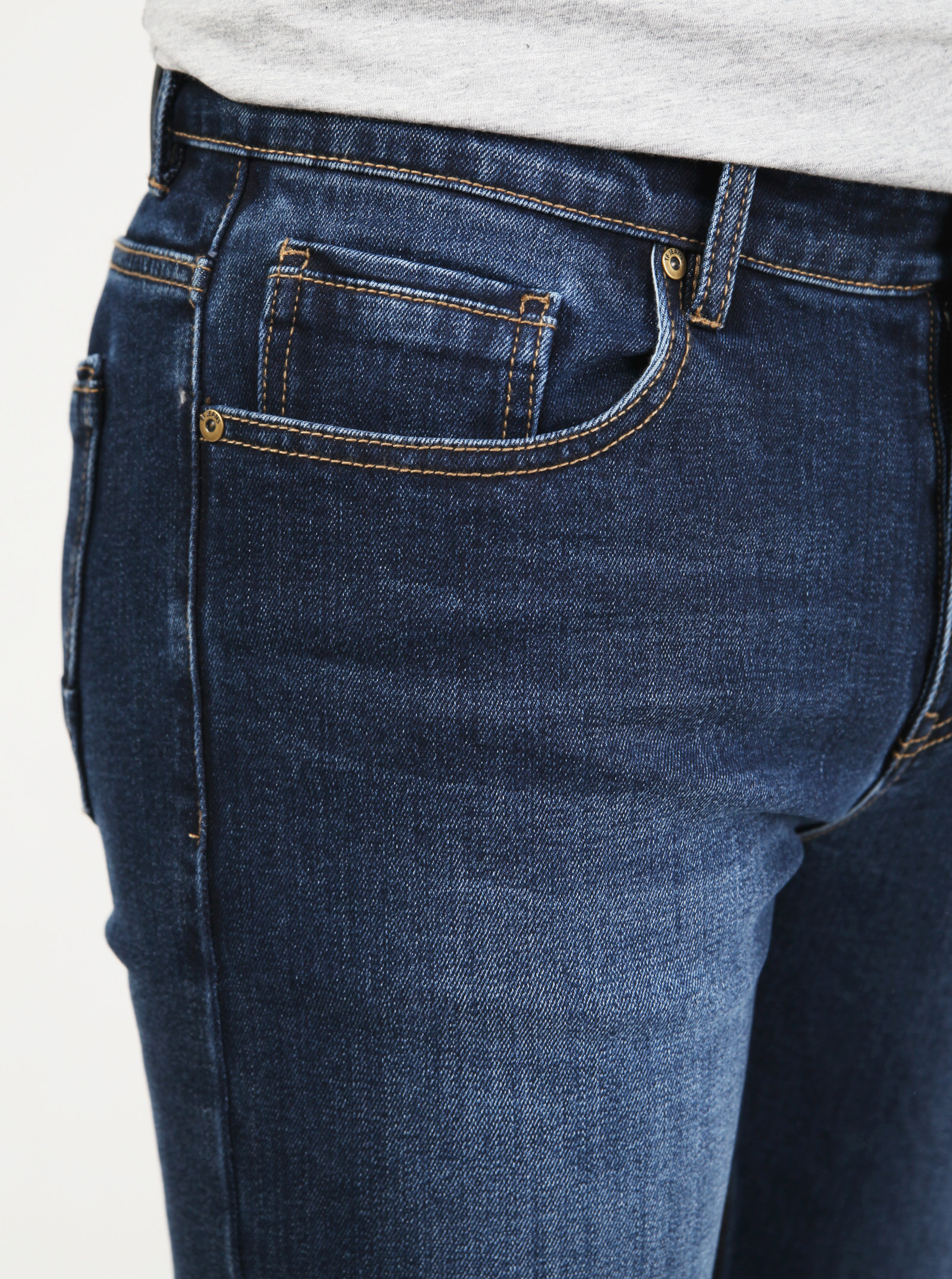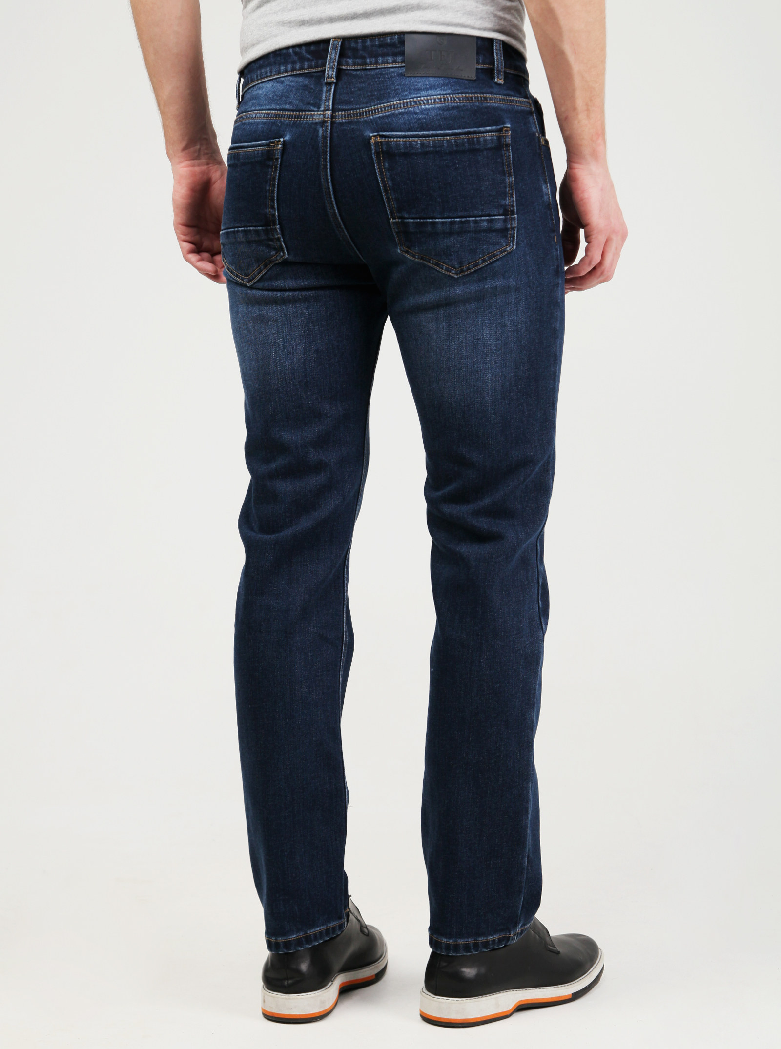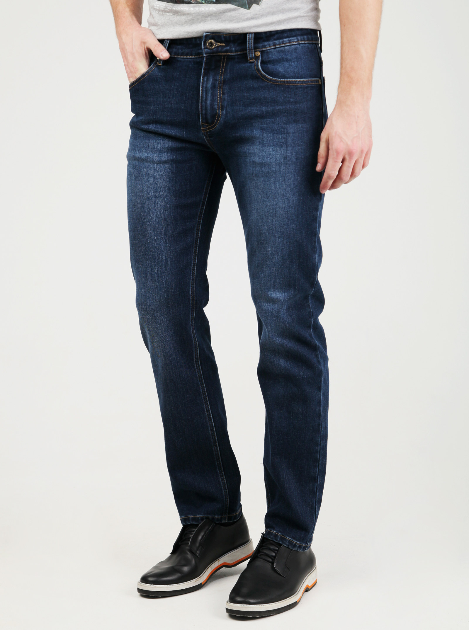 Фирменный фит RYAN. Утепленные джинсы с начесом изнутри, со слегка зауженными книзу штанинами и легкими потертостями спереди и сзади. Модель выполнена из стрейчевого хлопка.