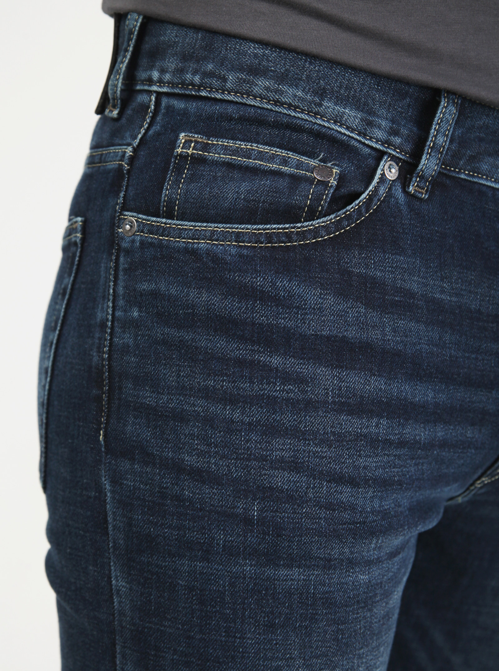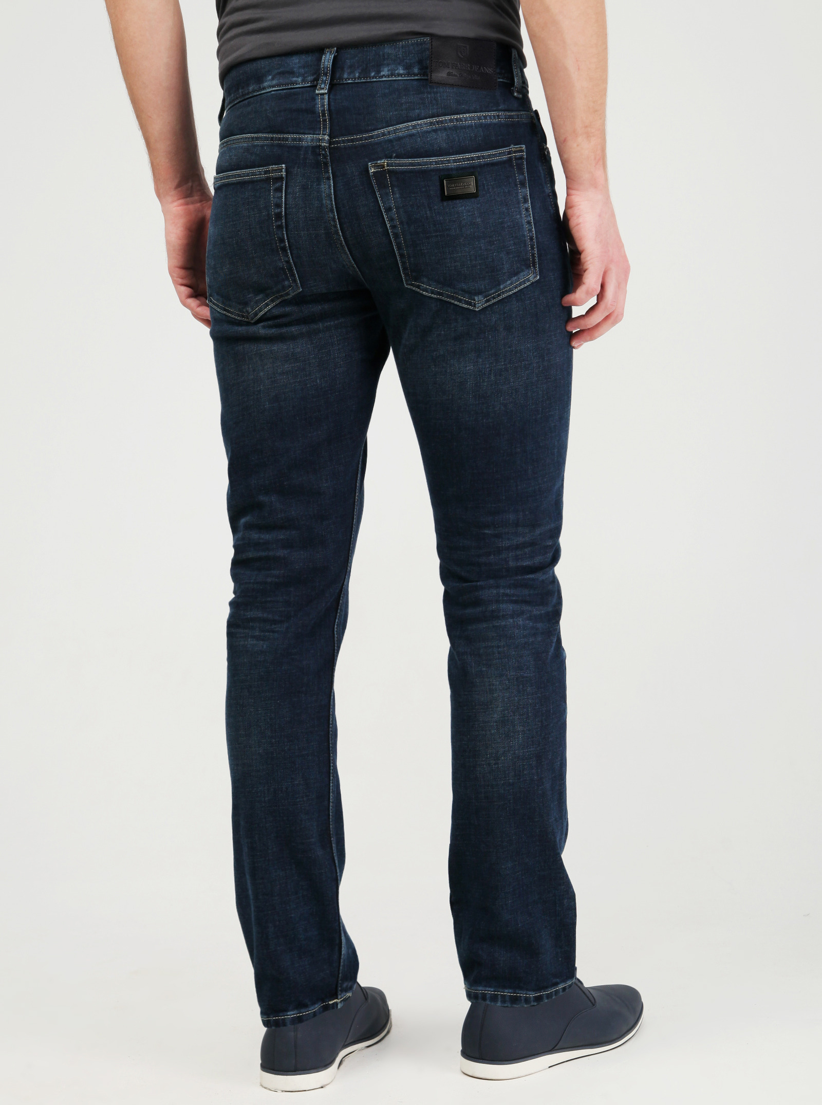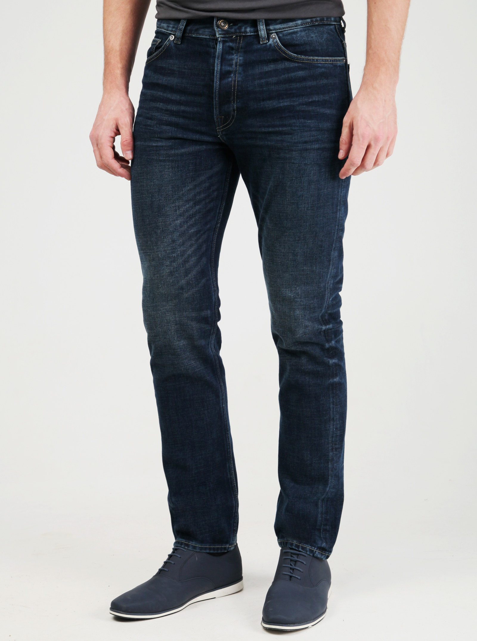 Фирменный фит RYAN. Полуприлегающие джинсы синего цвета с винтажным оттенком, слегка зауженные книзу. Модель выполнена из хлопка с эластаном.