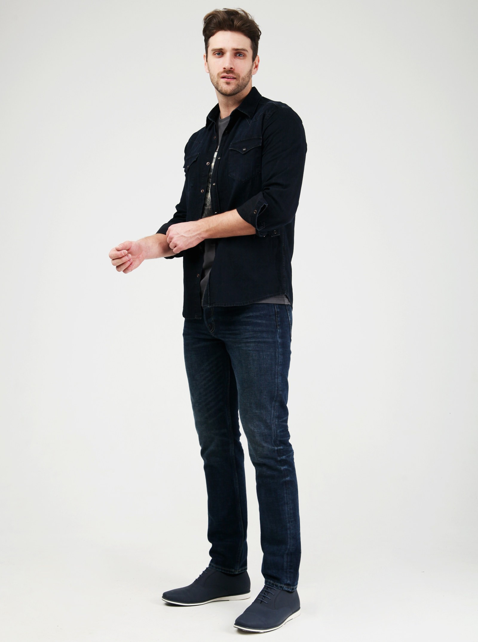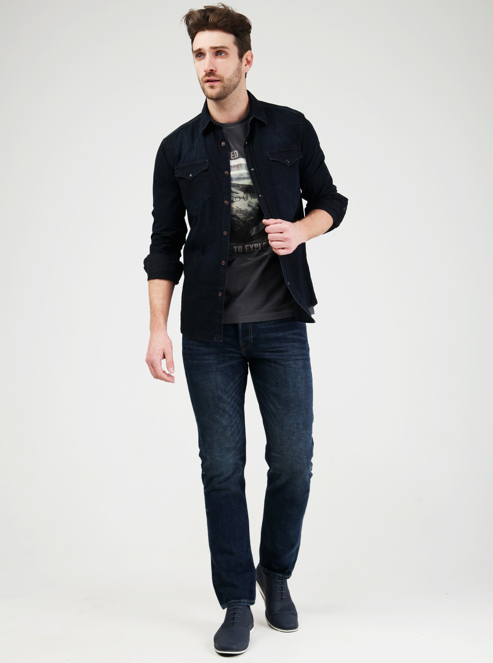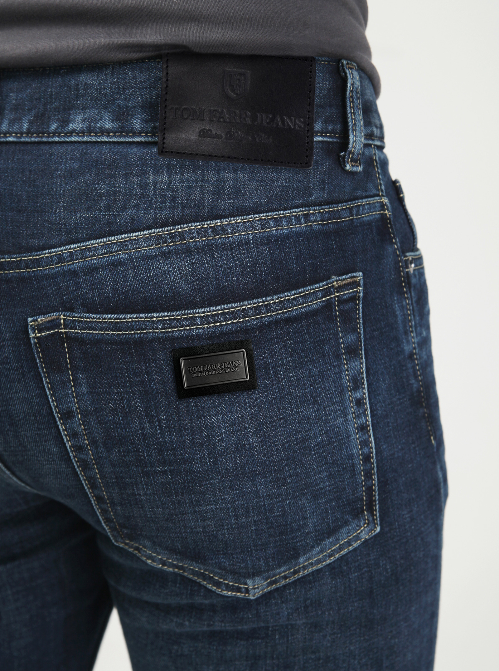 Фирменный фит RYAN. Полуприлегающие джинсы синего цвета с винтажным оттенком, слегка зауженные книзу. Модель выполнена из хлопка с эластаном.