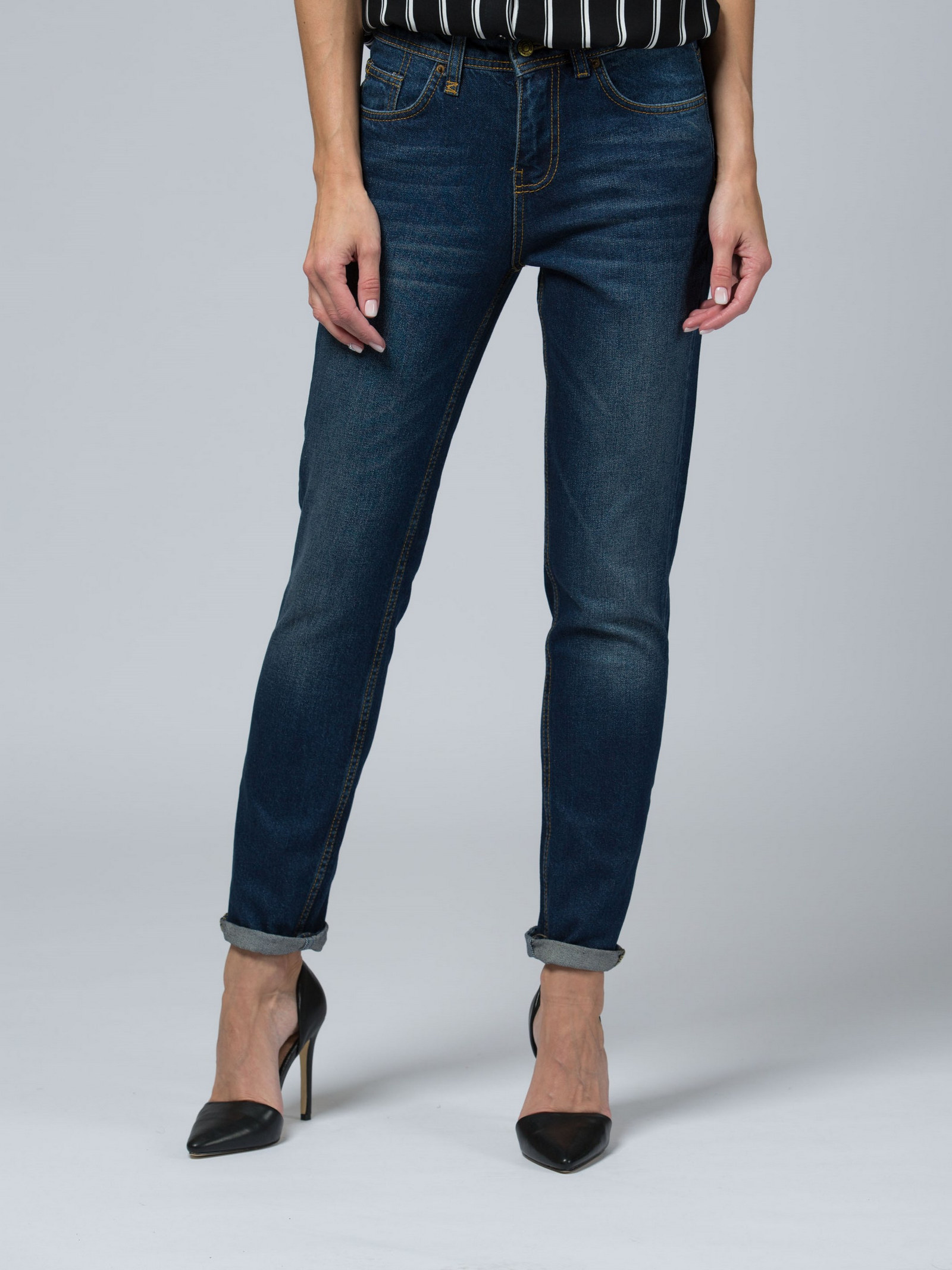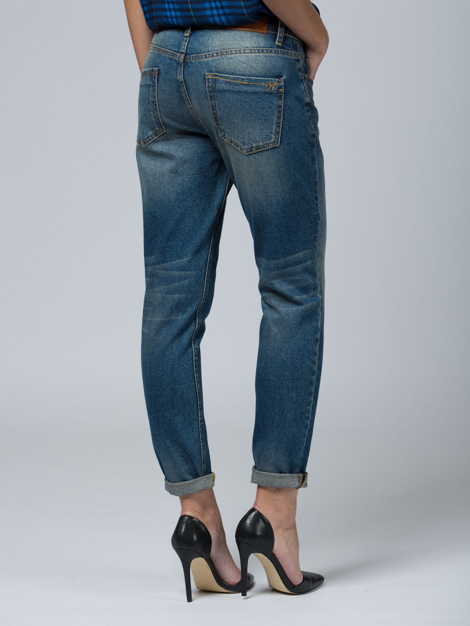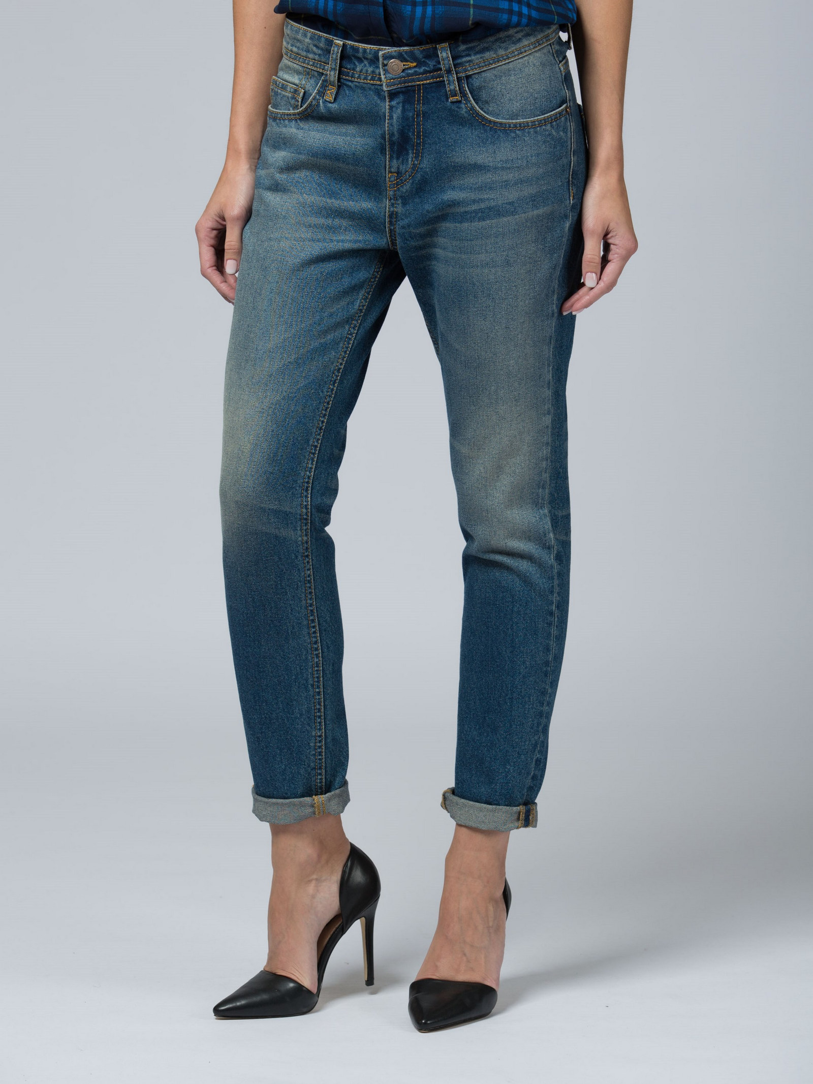 Модель кроя бойфренд. Слегка зауженная штанина. Низкая посадка. Джинсы средне-синего цвета с выразительными потертостями.