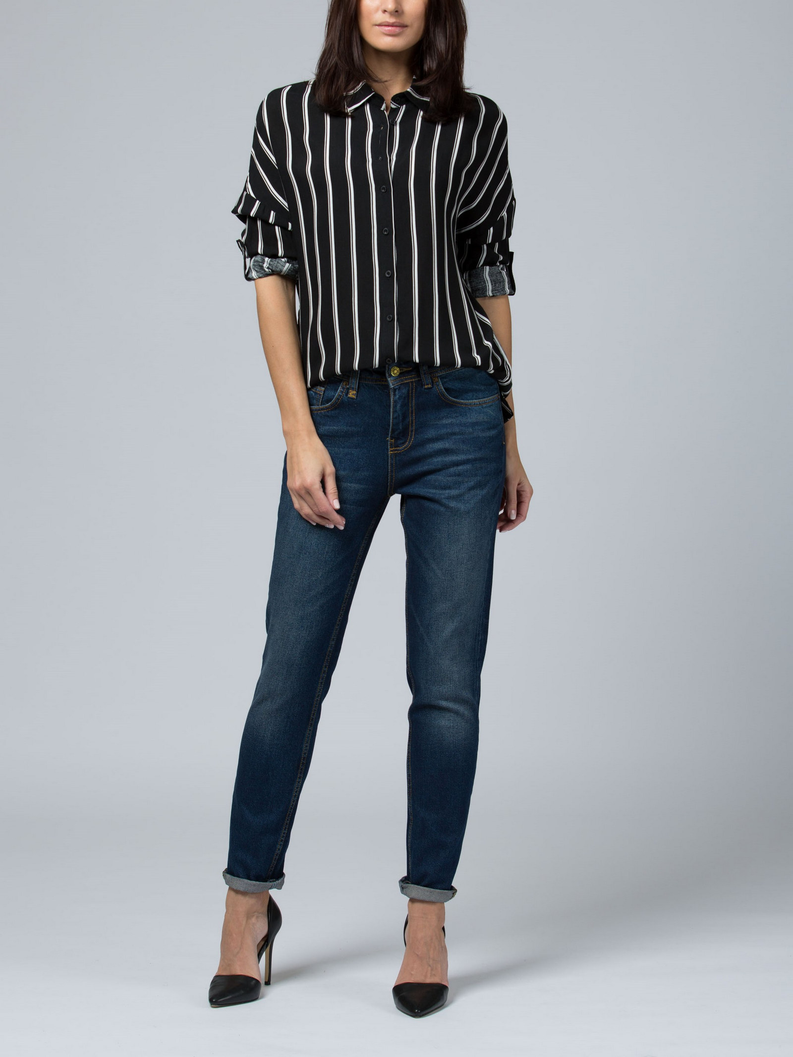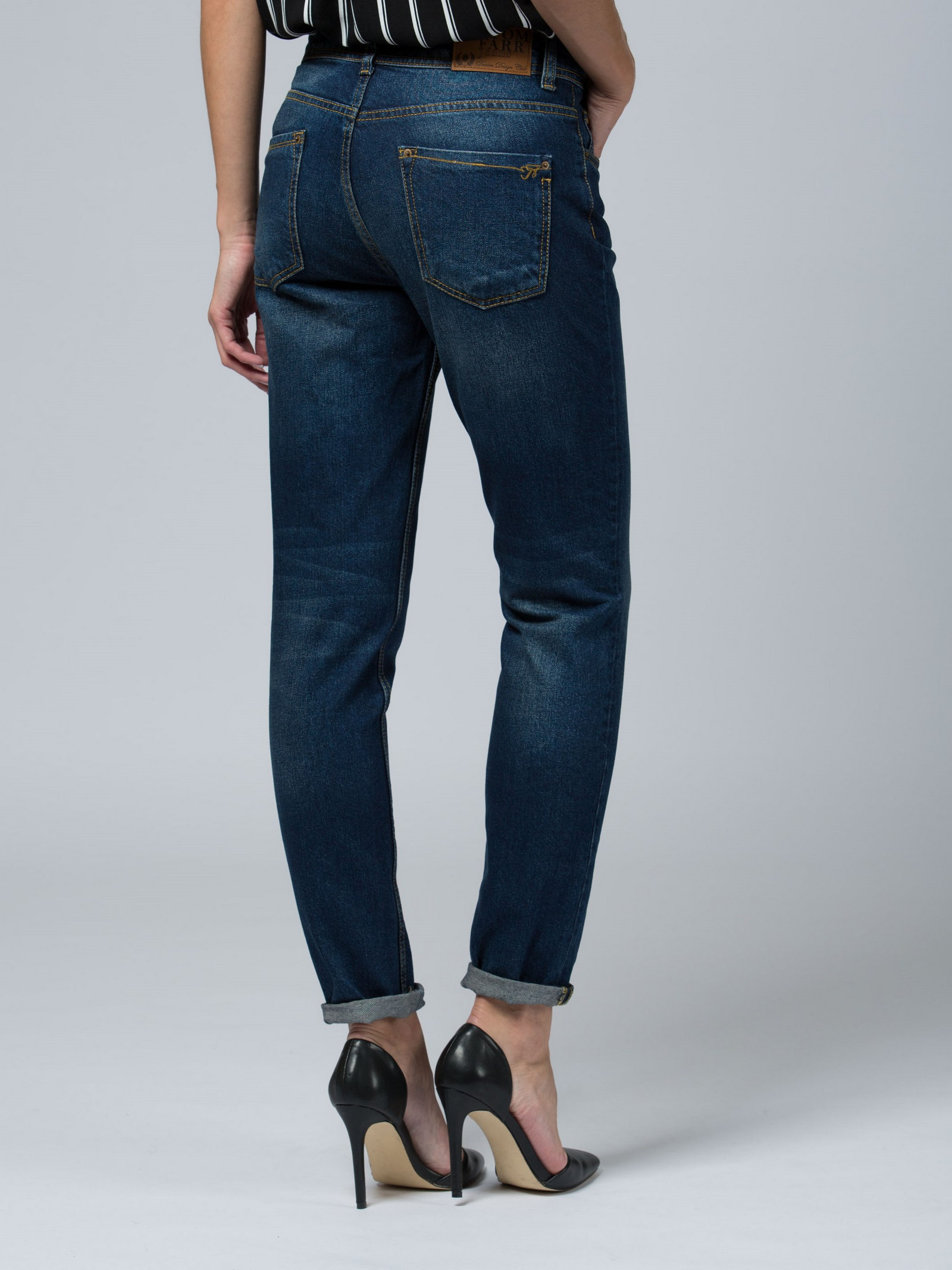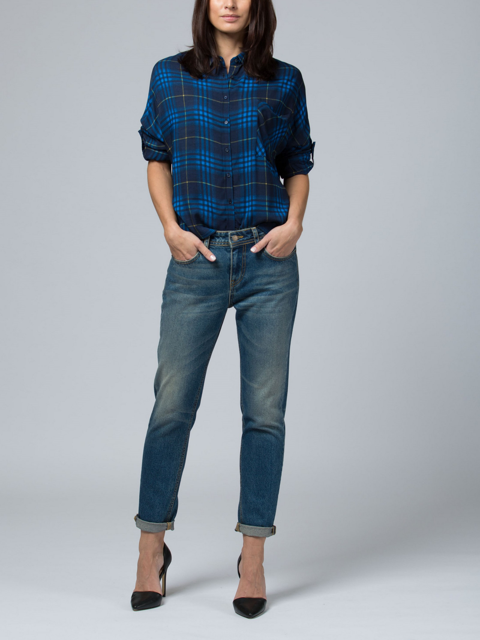 Модель кроя бойфренд. Слегка зауженная штанина. Низкая посадка. Джинсы средне-синего цвета с выразительными потертостями.