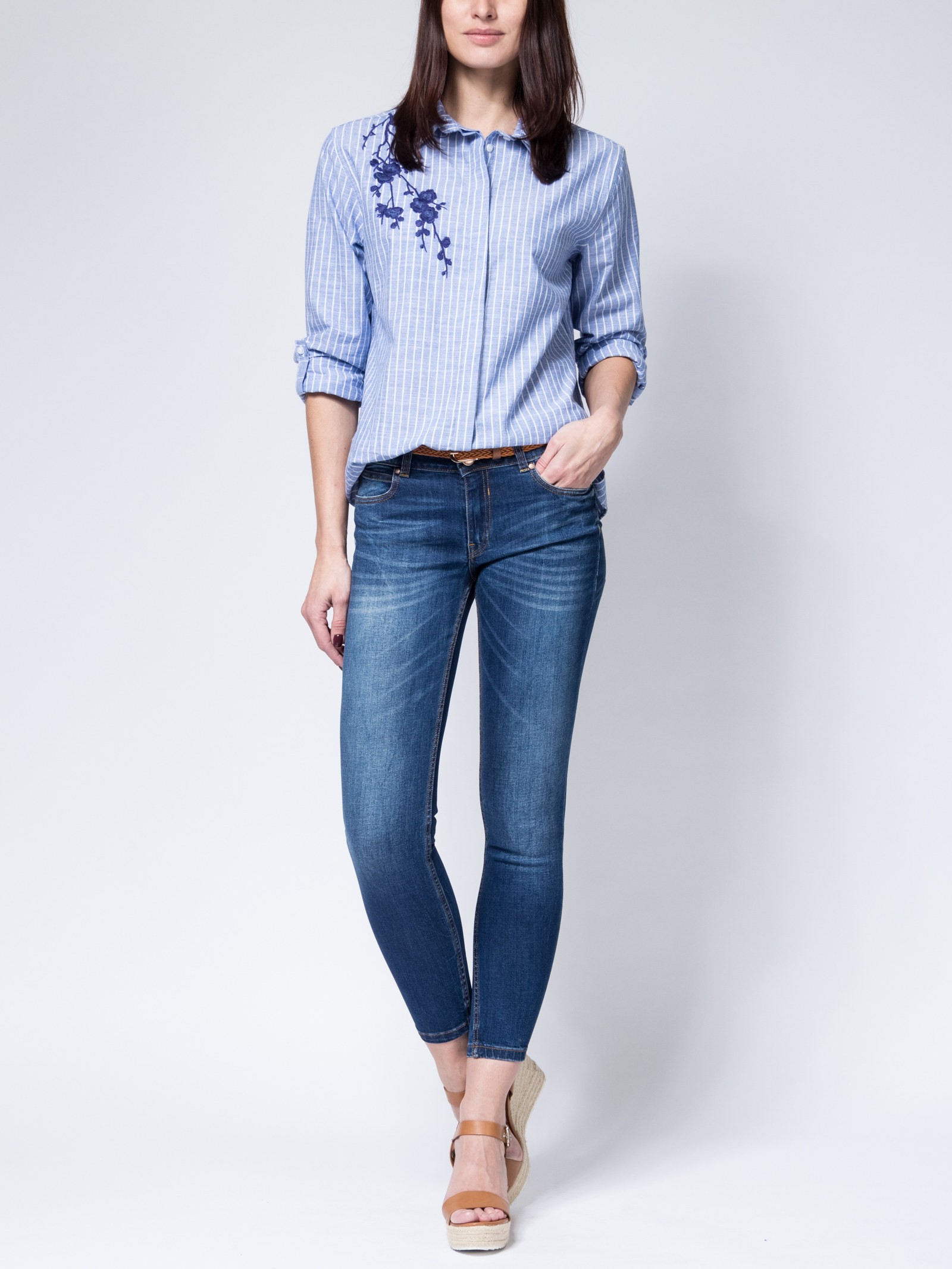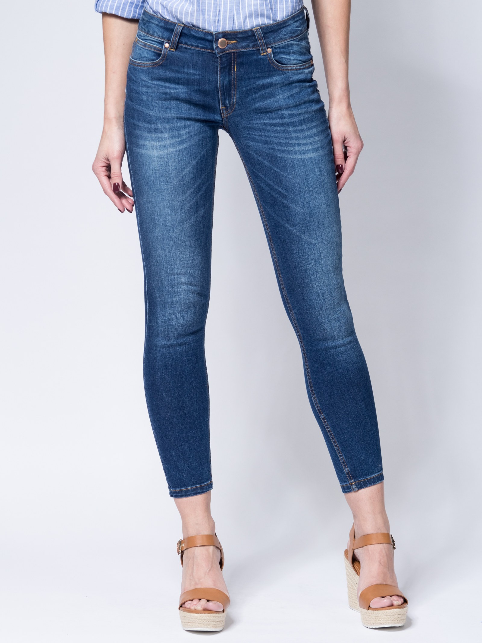 Узкая модель из стрейчевого денима, обеспечивающего комфортную носку. Зауженная книзу штанина. Средняя посадка. Джинсы классического синего цвета, с разрезом выше колена, легкими царапинами и распоротым низом.