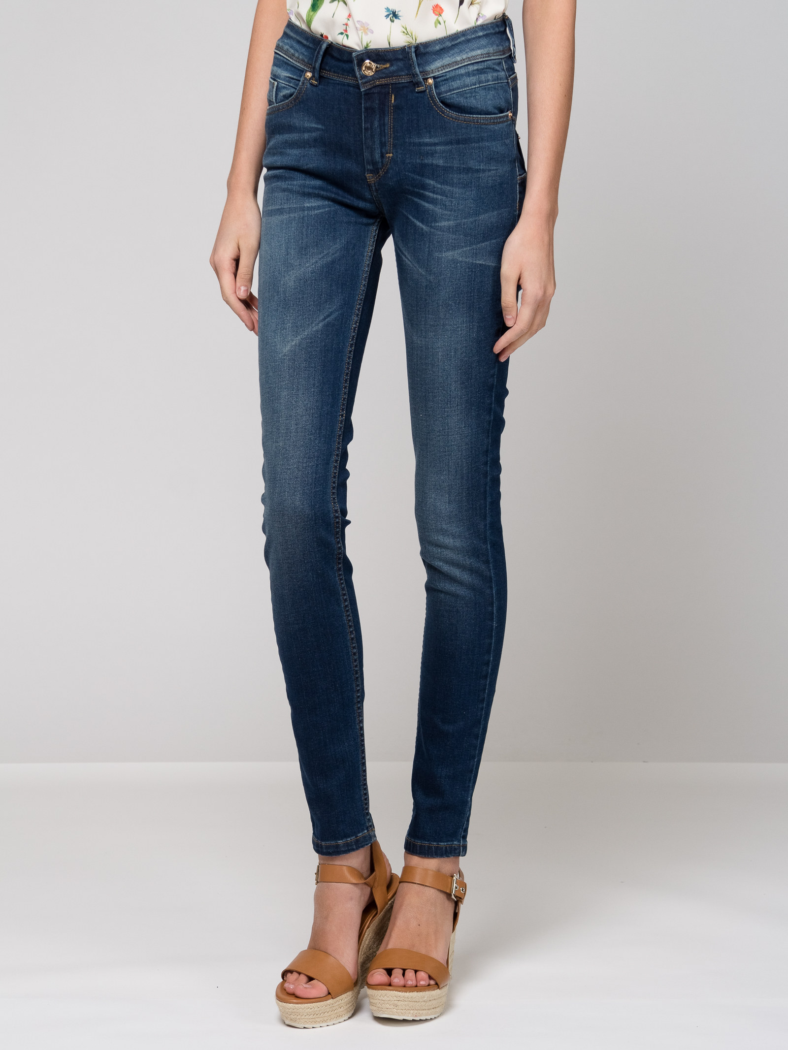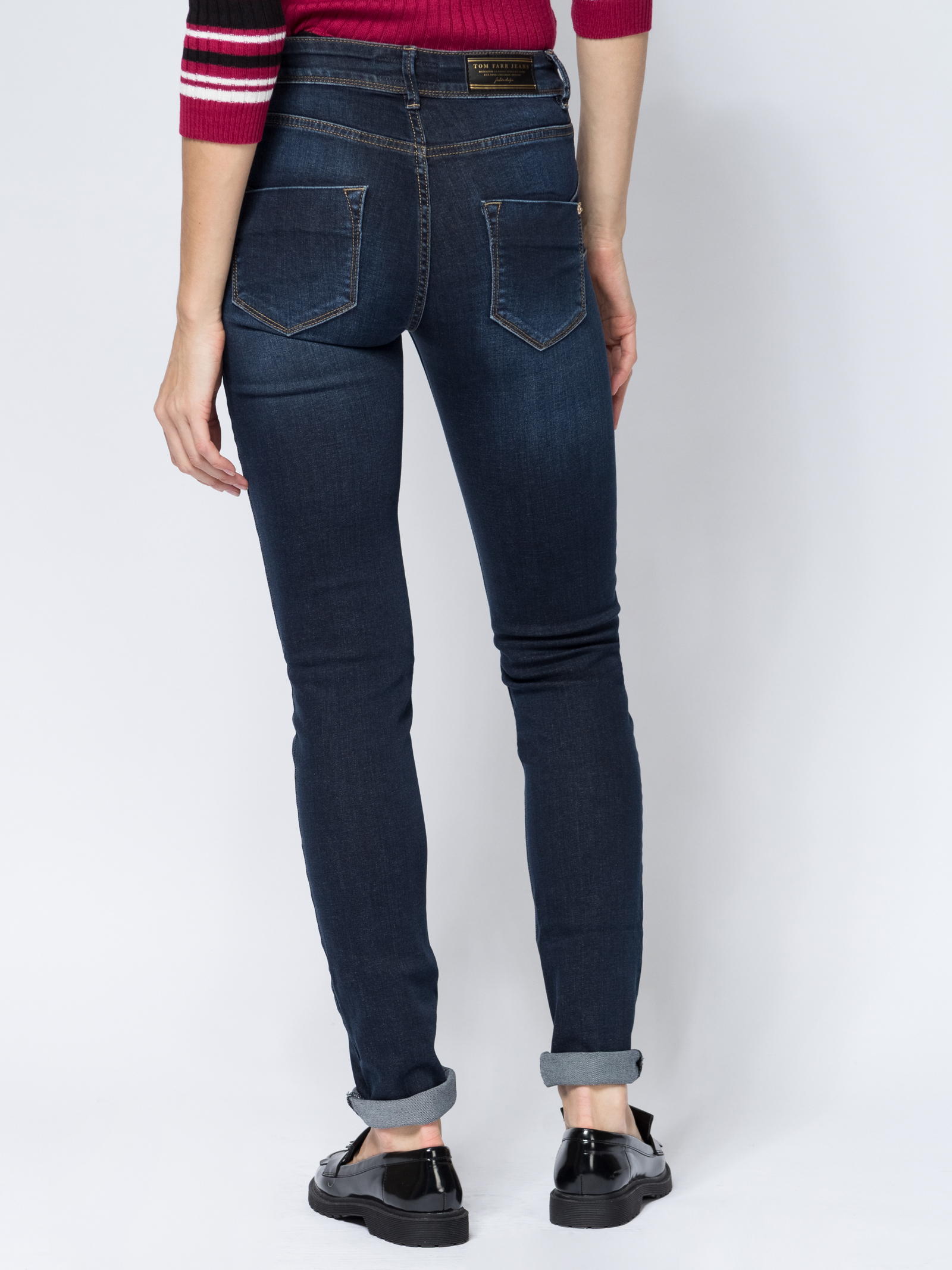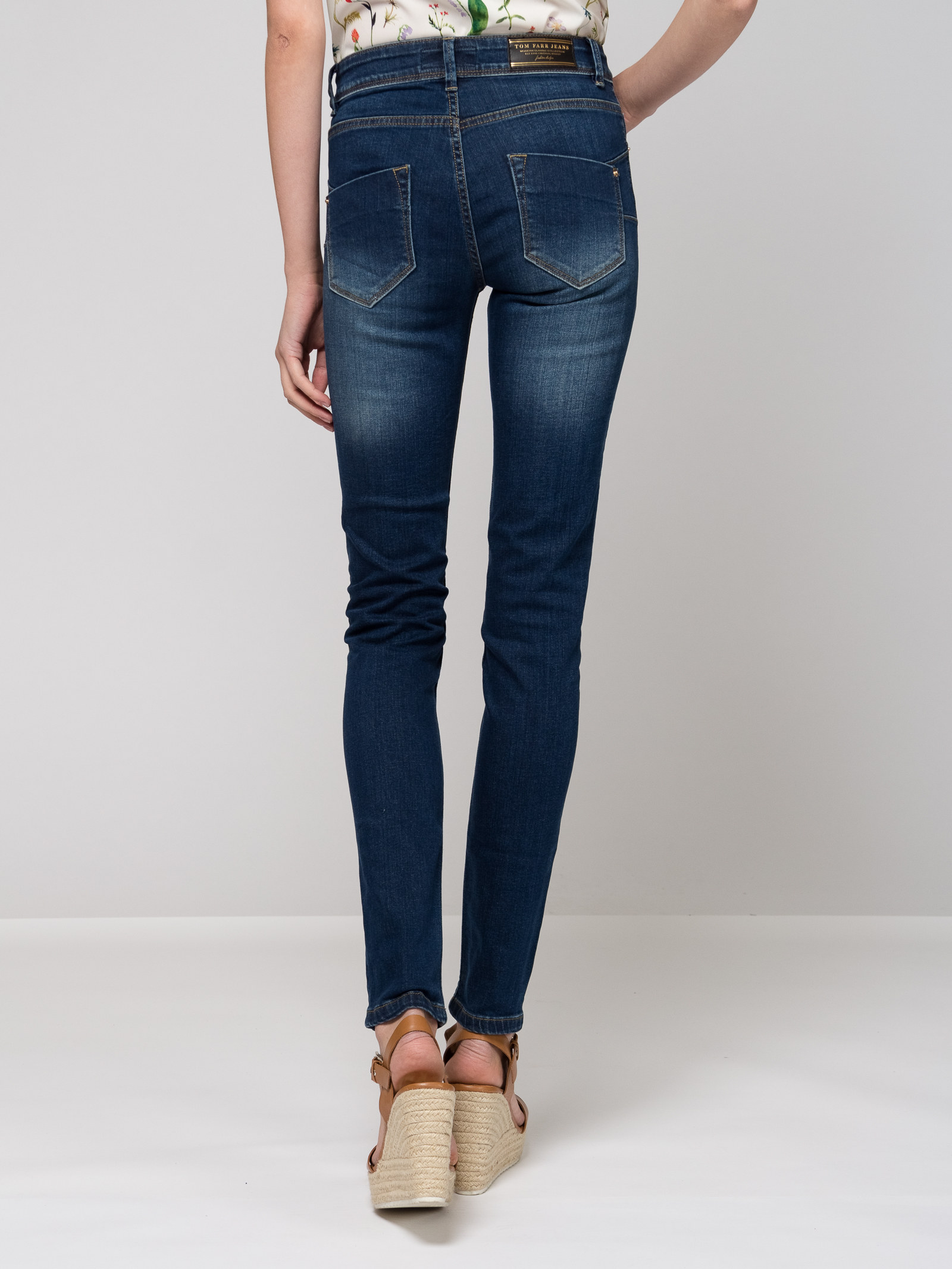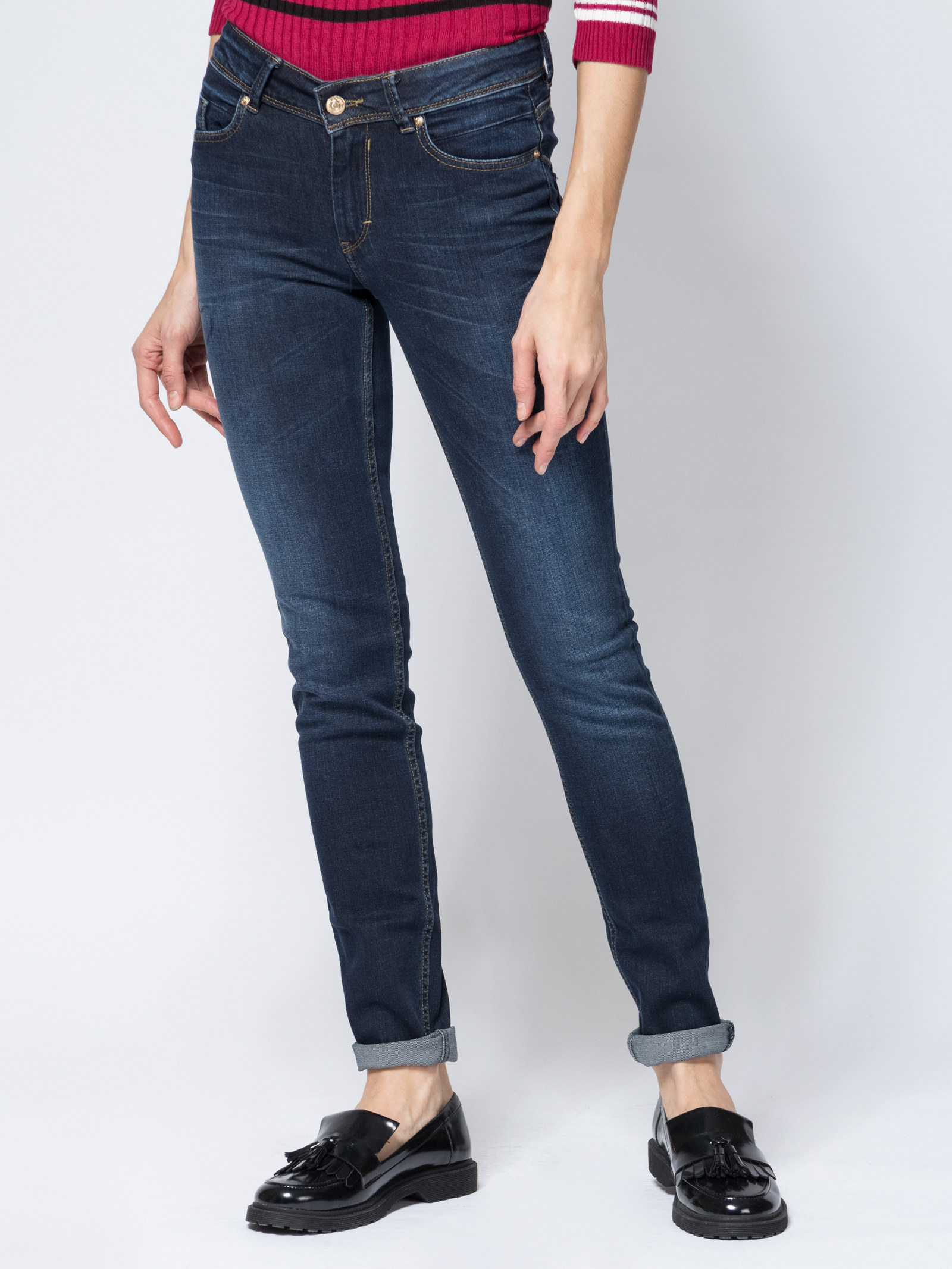 Узкая модель из стрейчевого денима, обеспечивающего комфортную носку. Штанина заужена книзу. Высокая посадка. Специальный крой с эффектом пуш-ап. Темно-синие джинсы с естественными потертостями.