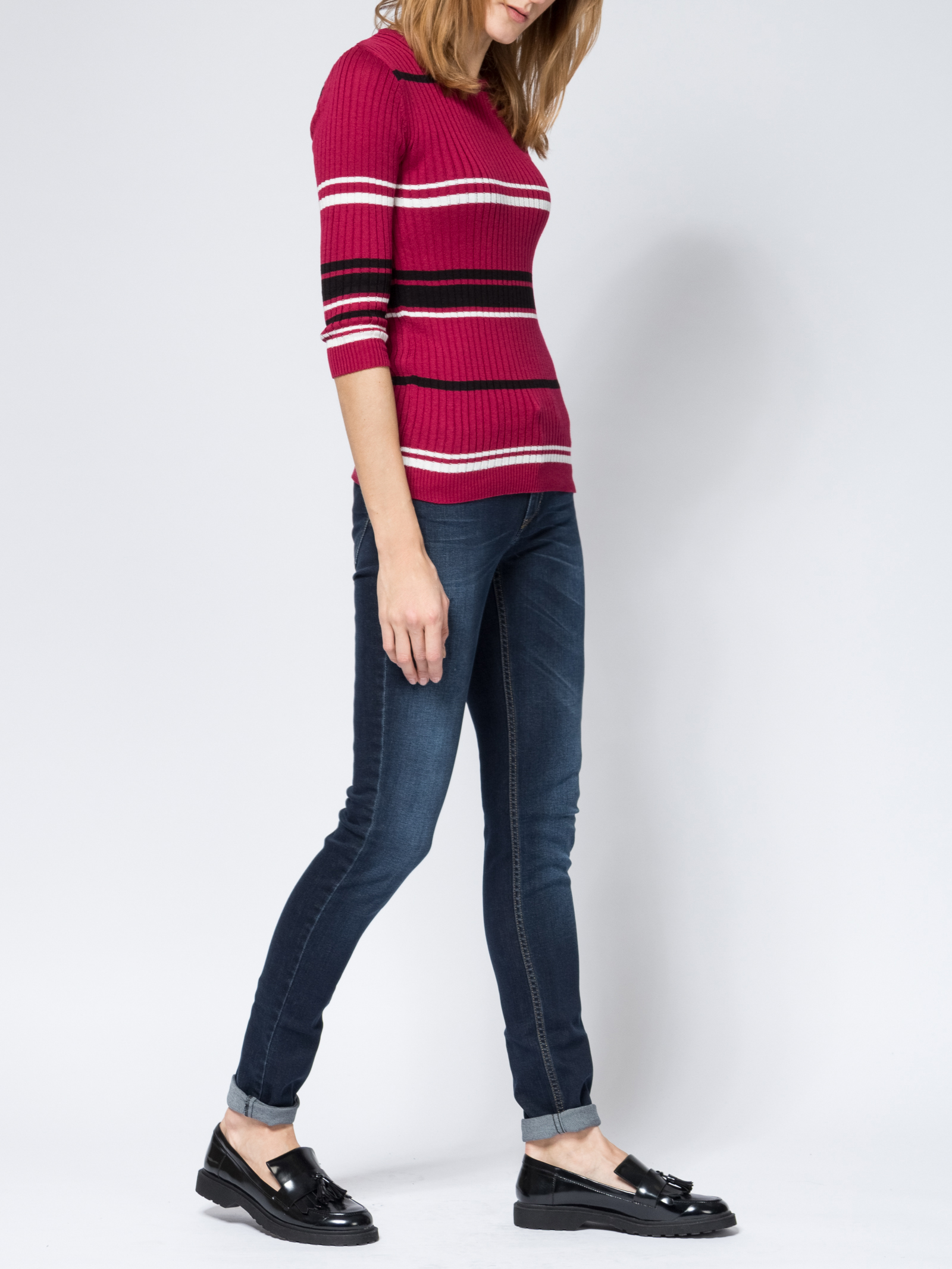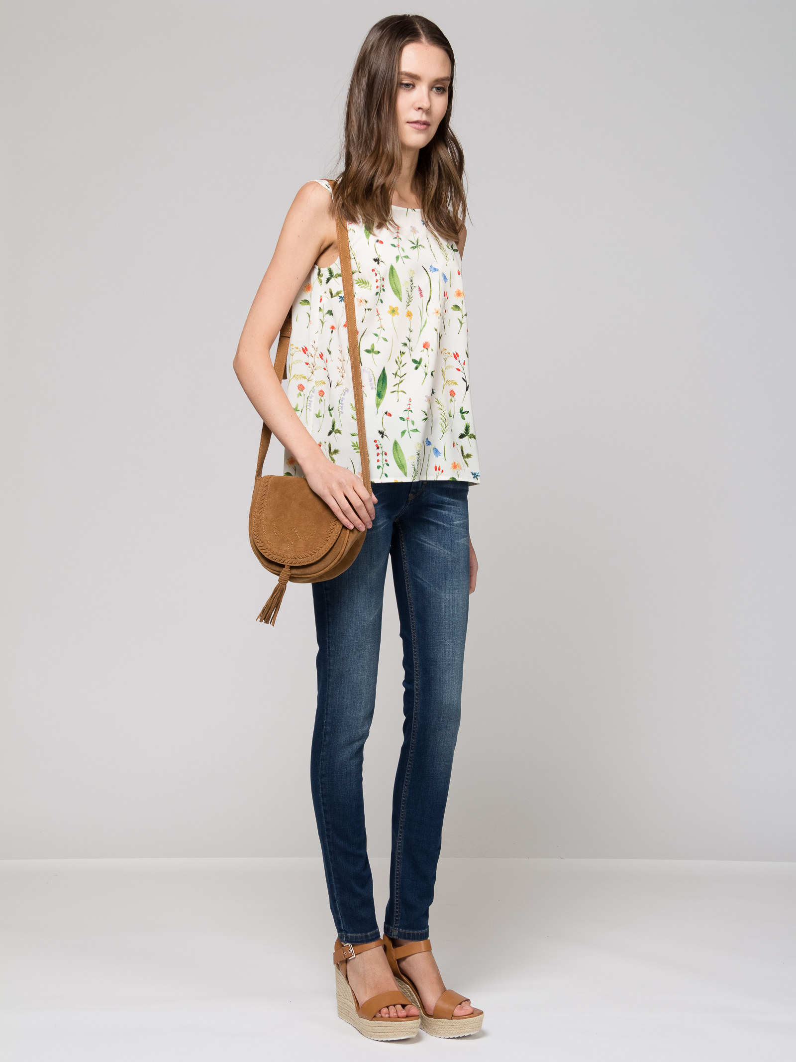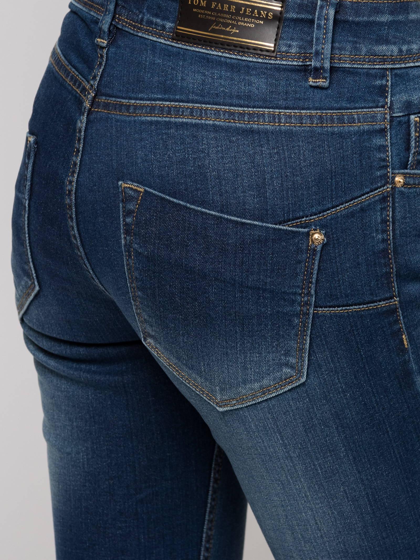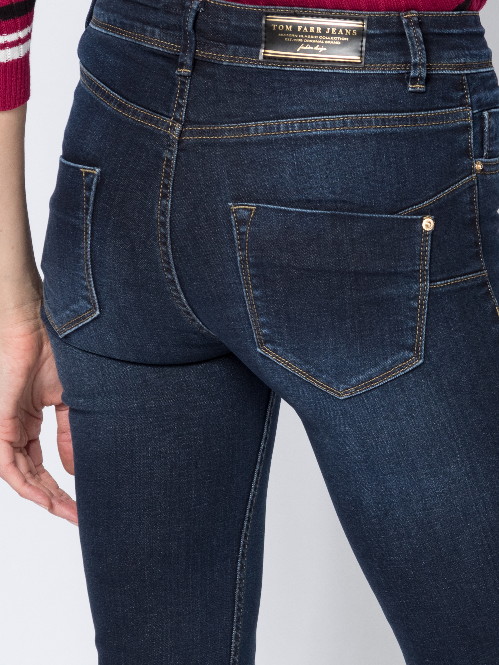 Узкая модель из стрейчевого денима, обеспечивающего комфортную носку. Штанина заужена книзу. Высокая посадка. Специальный крой с эффектом пуш-ап. Темно-синие джинсы с естественными потертостями.