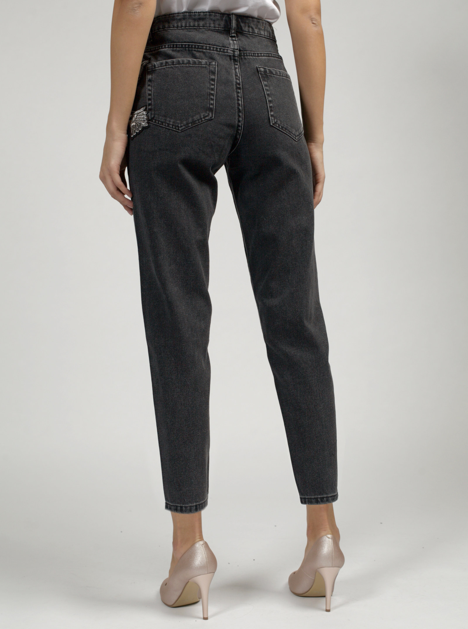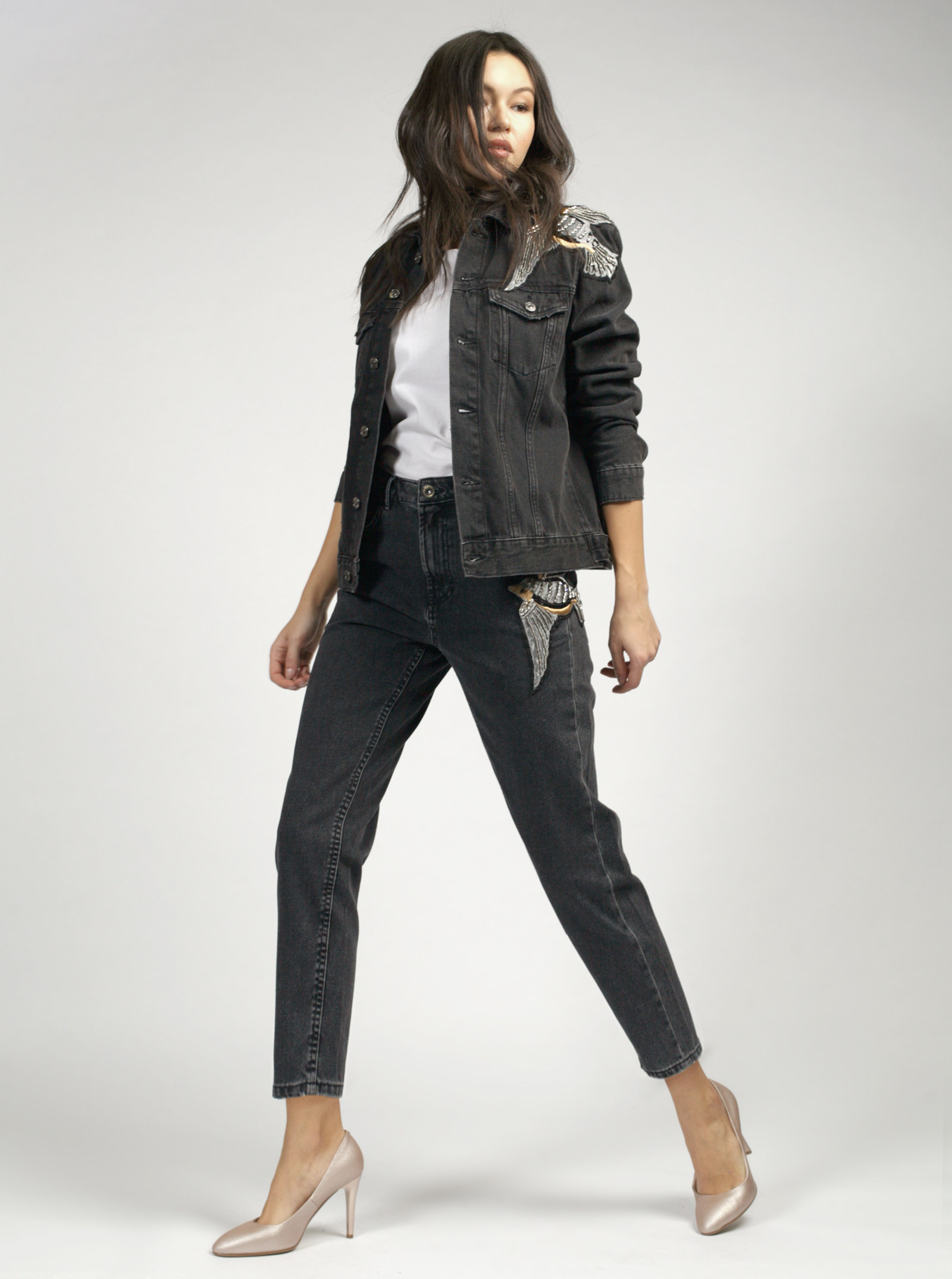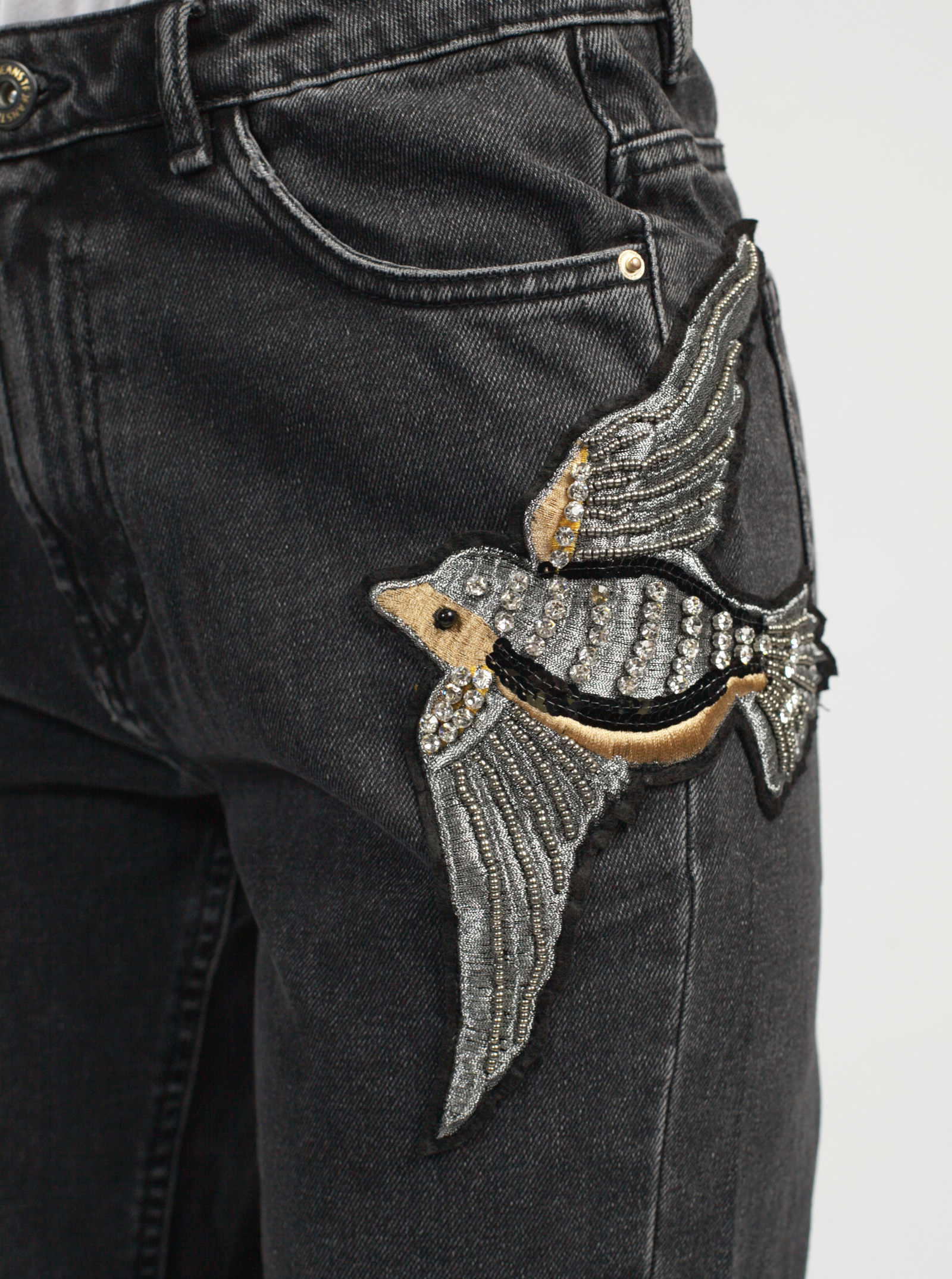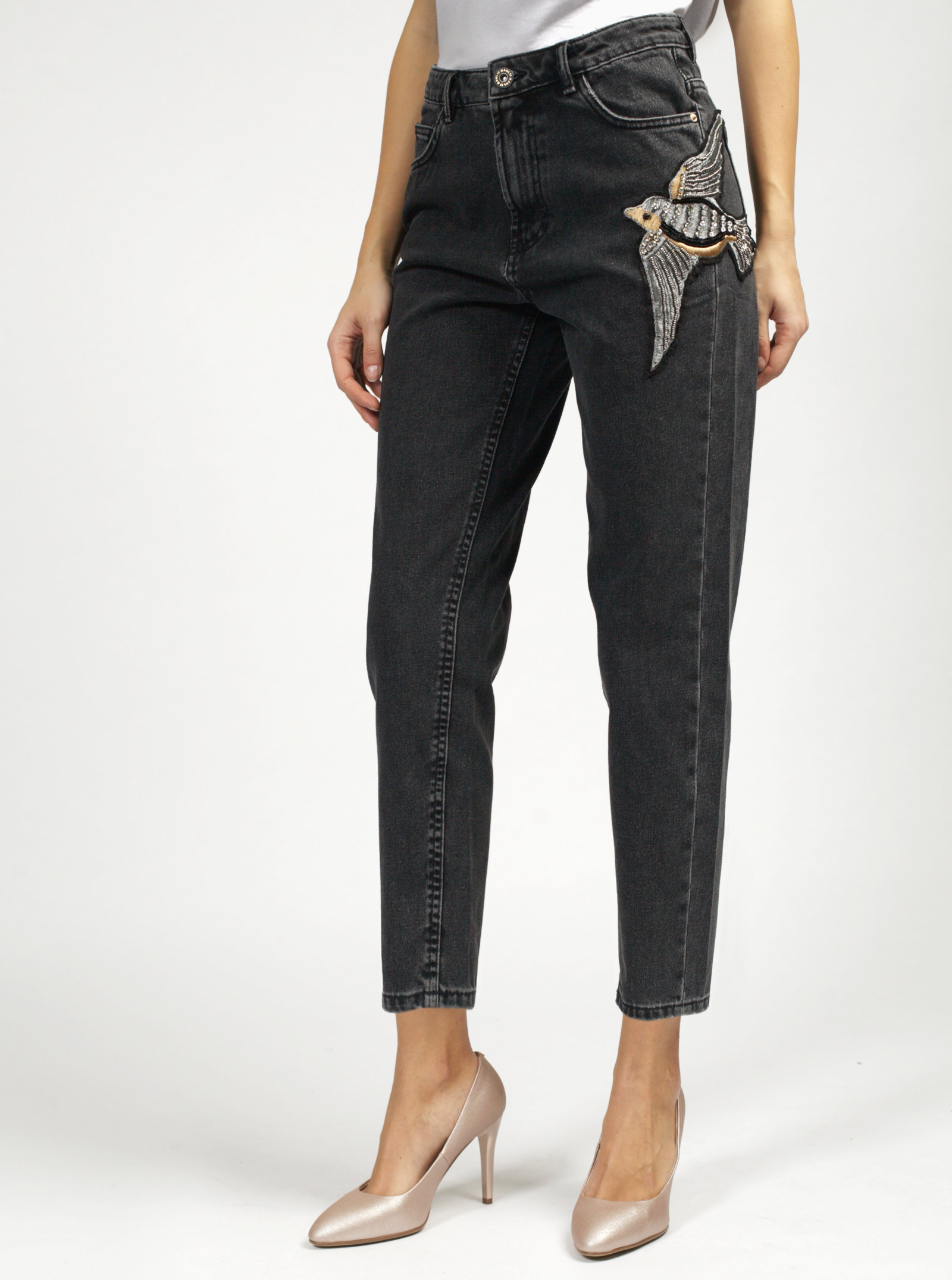 Фирменный фит MARY. Джинсы модного силуэта Mom с высокой посадкой и трендовой нашивкой в виде птицы. Выполнены из хлопка.