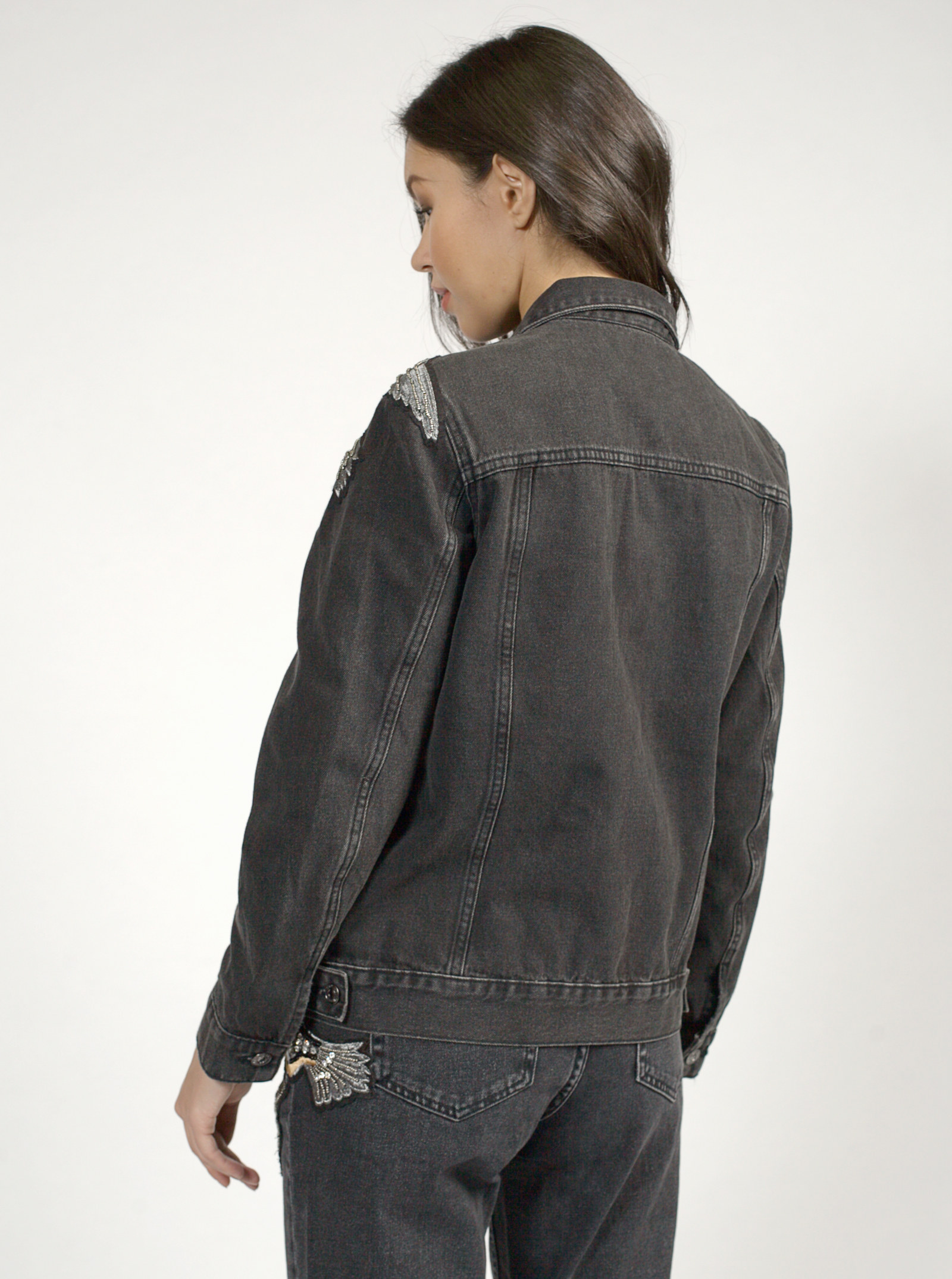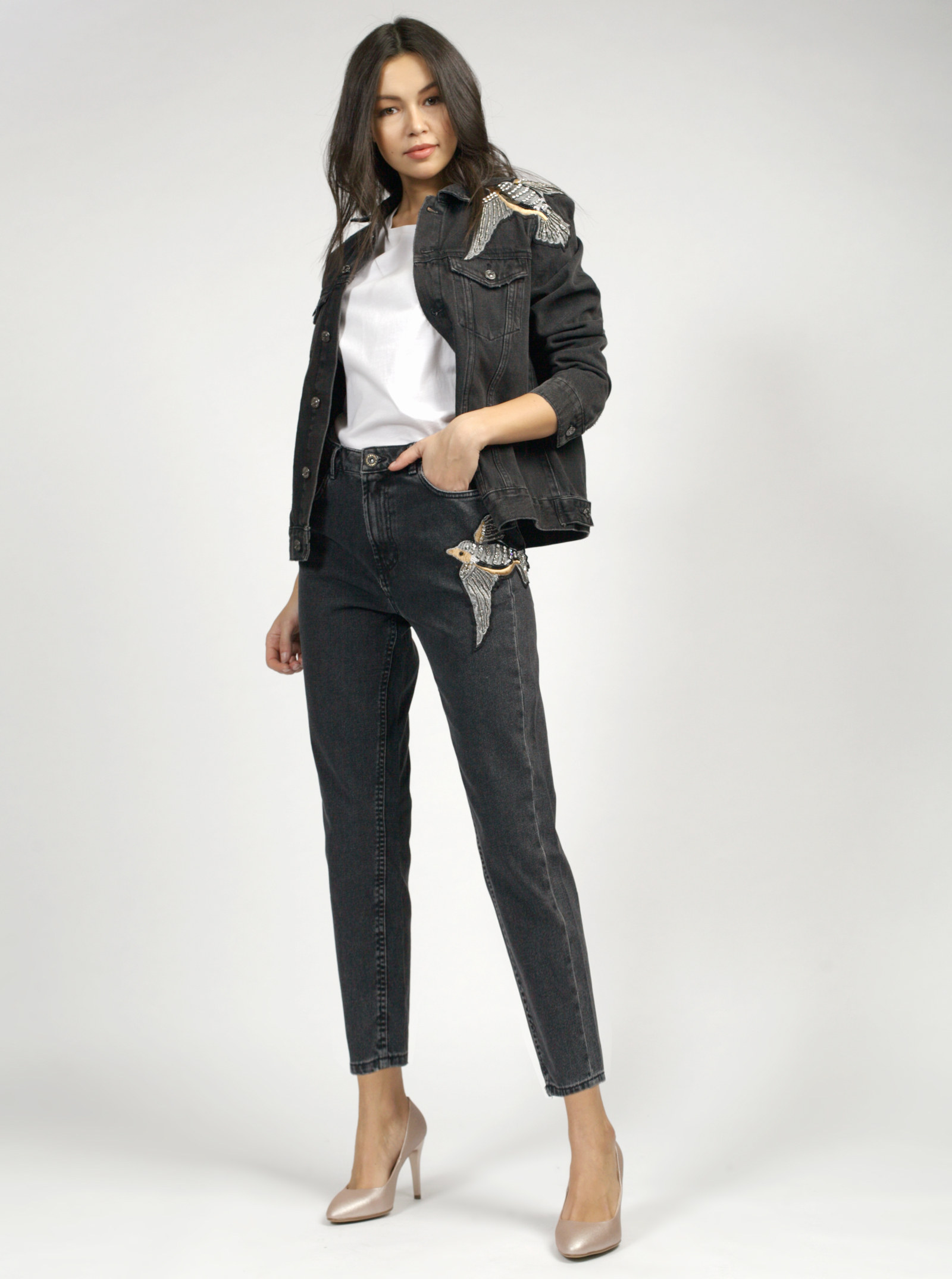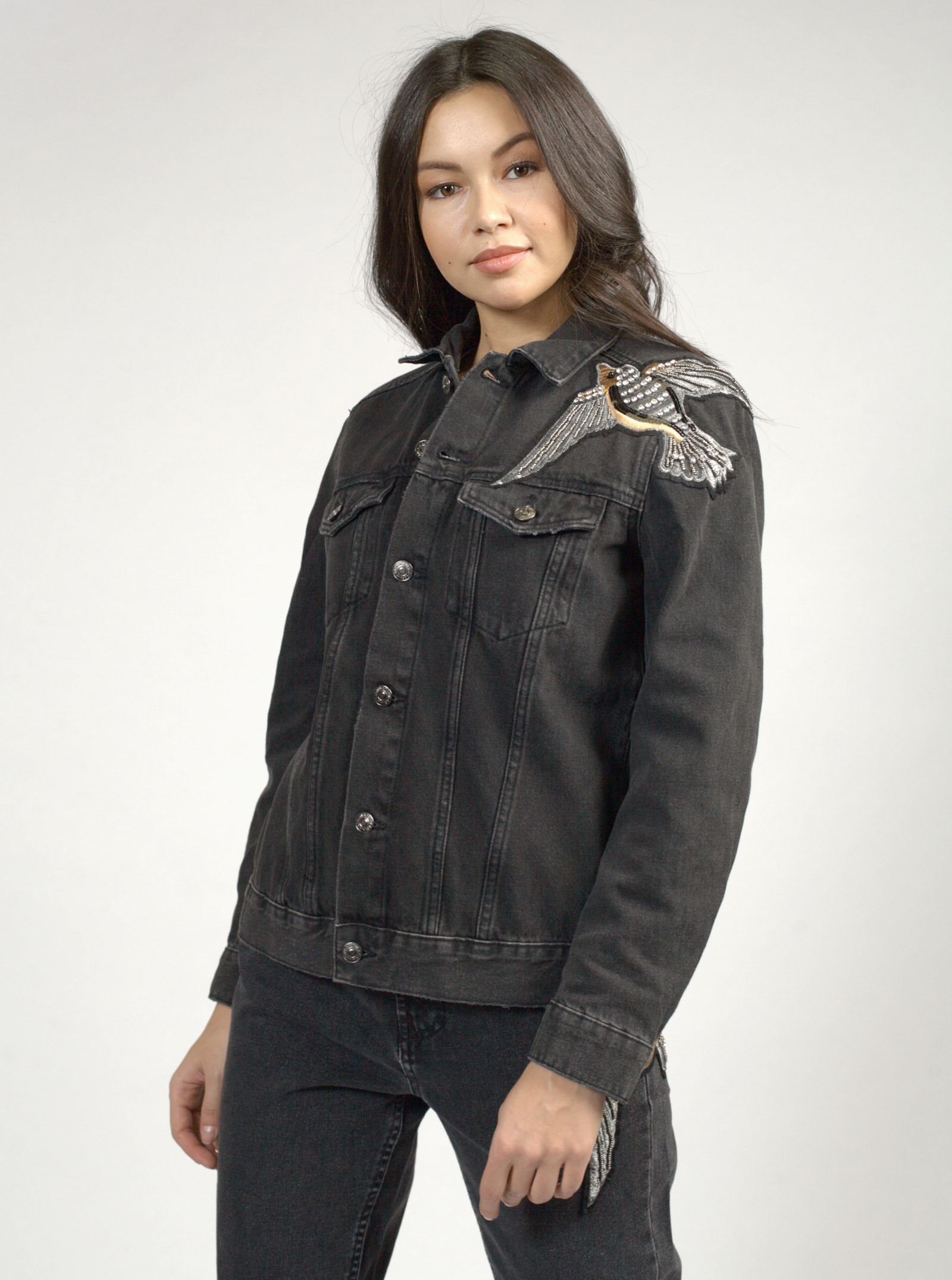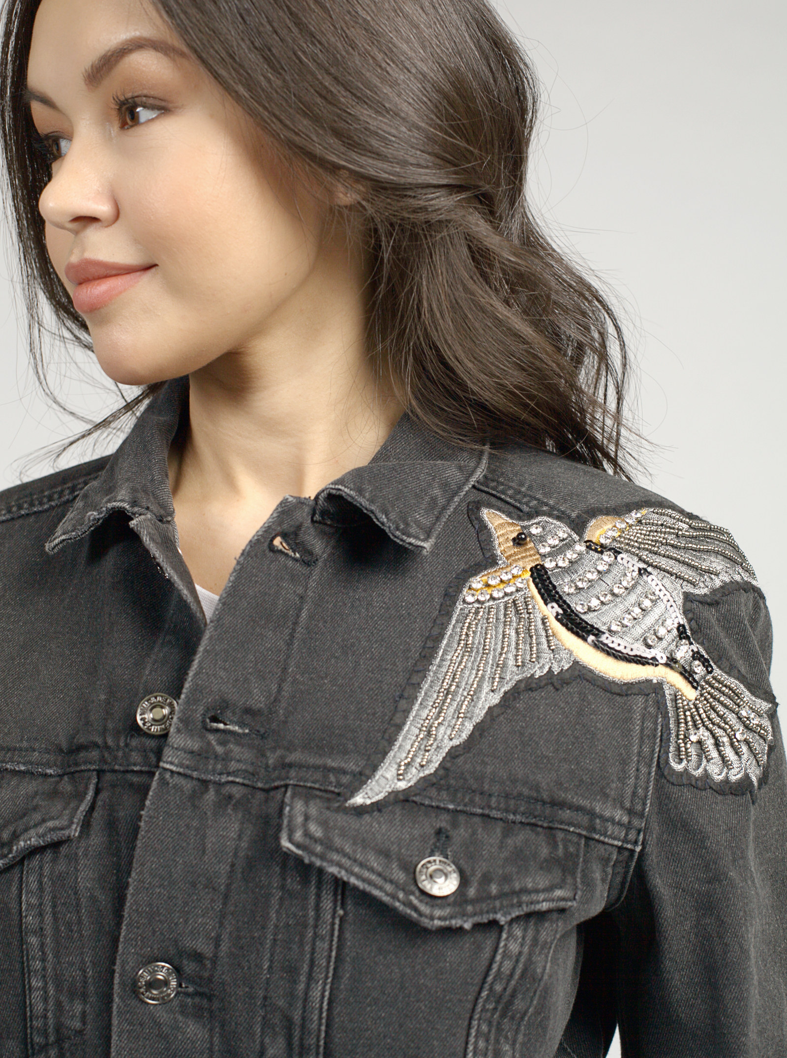 Джинсовая куртка из хлоковой ткани модного силуэта со стильной нашивкой в виде птицы.