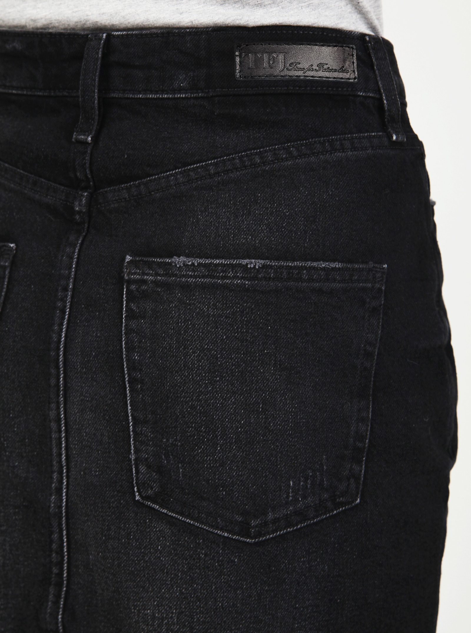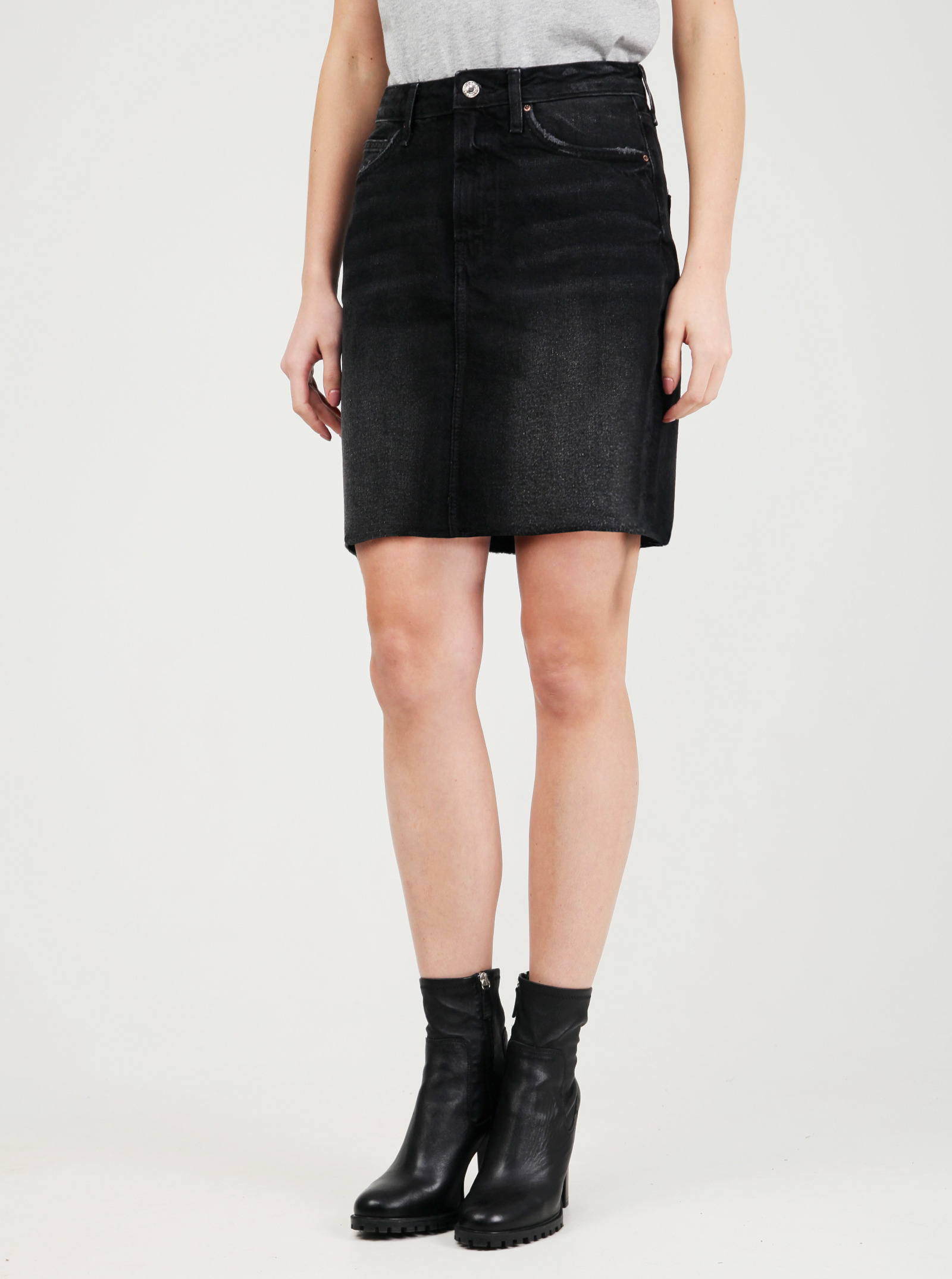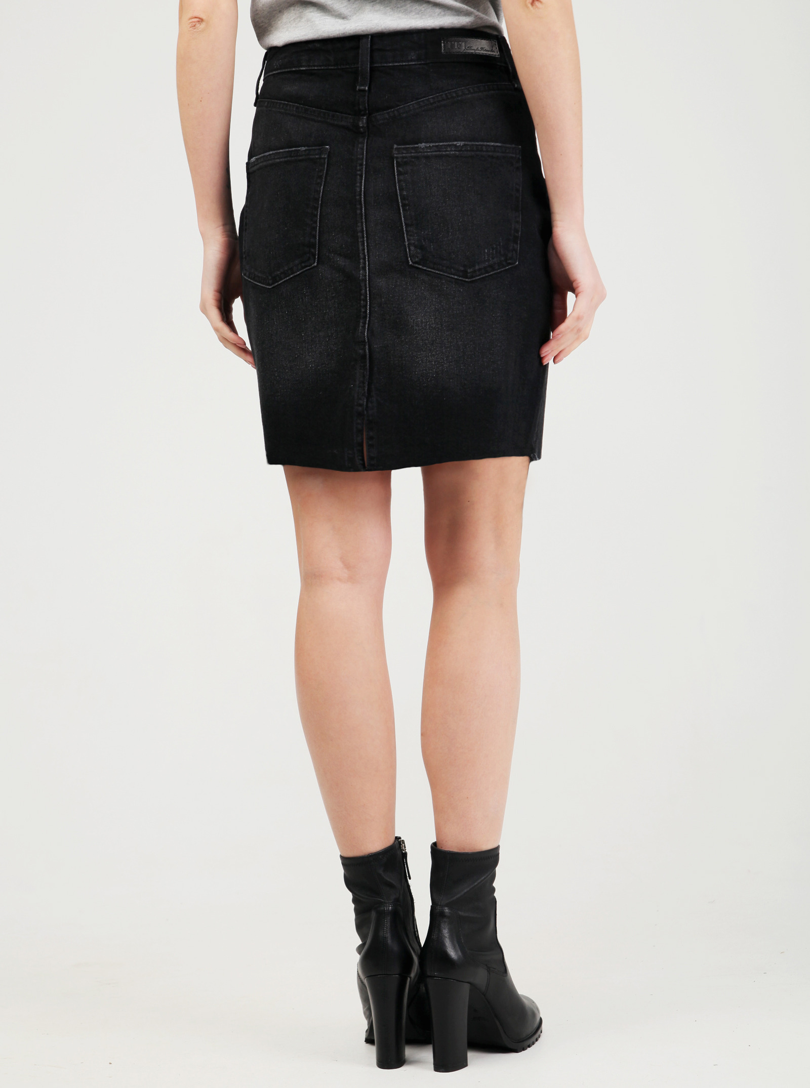Модная джинсовая юбка из плотной хлопковой ткани с легкими потертостями и обрезанным низом.