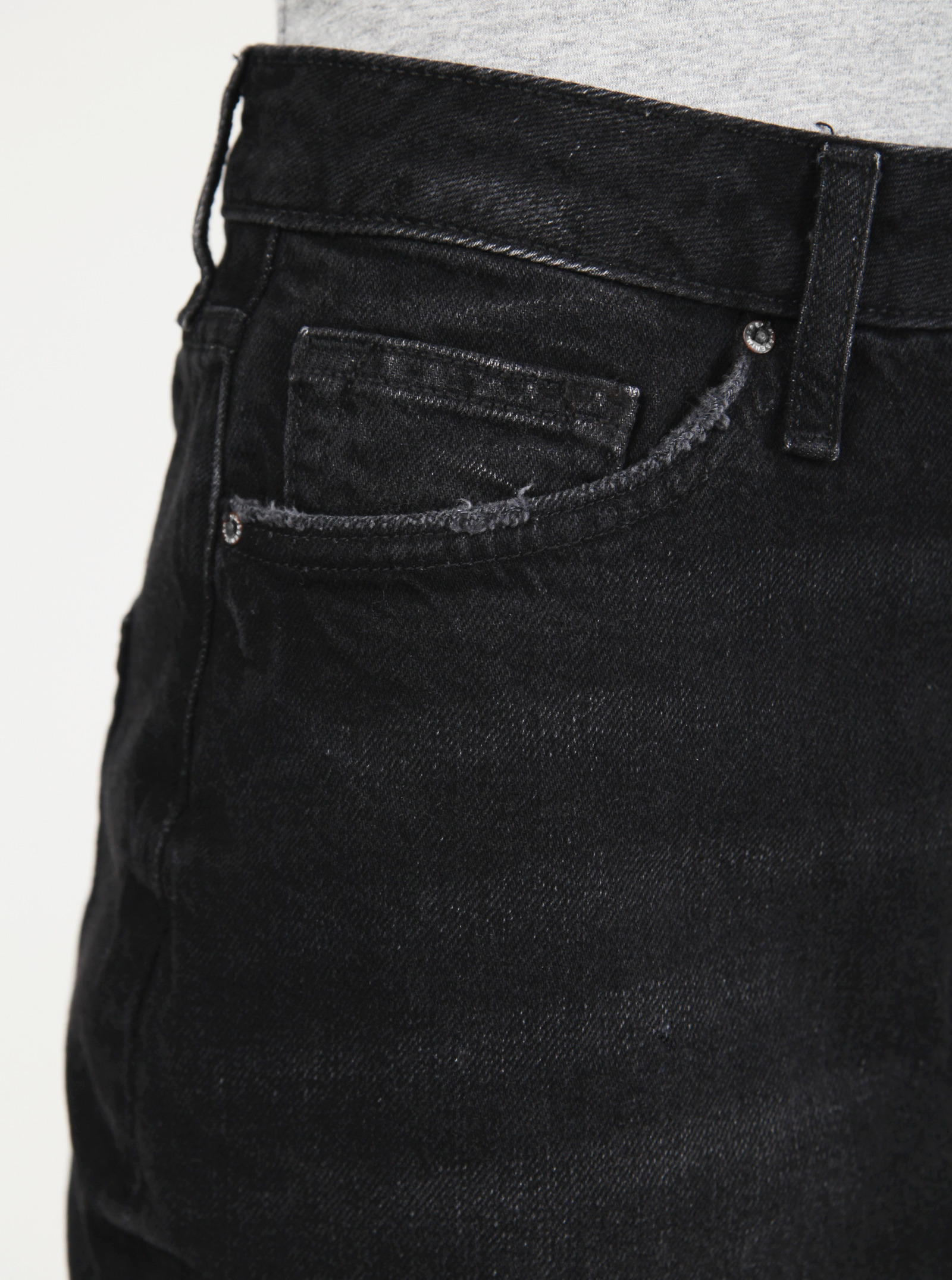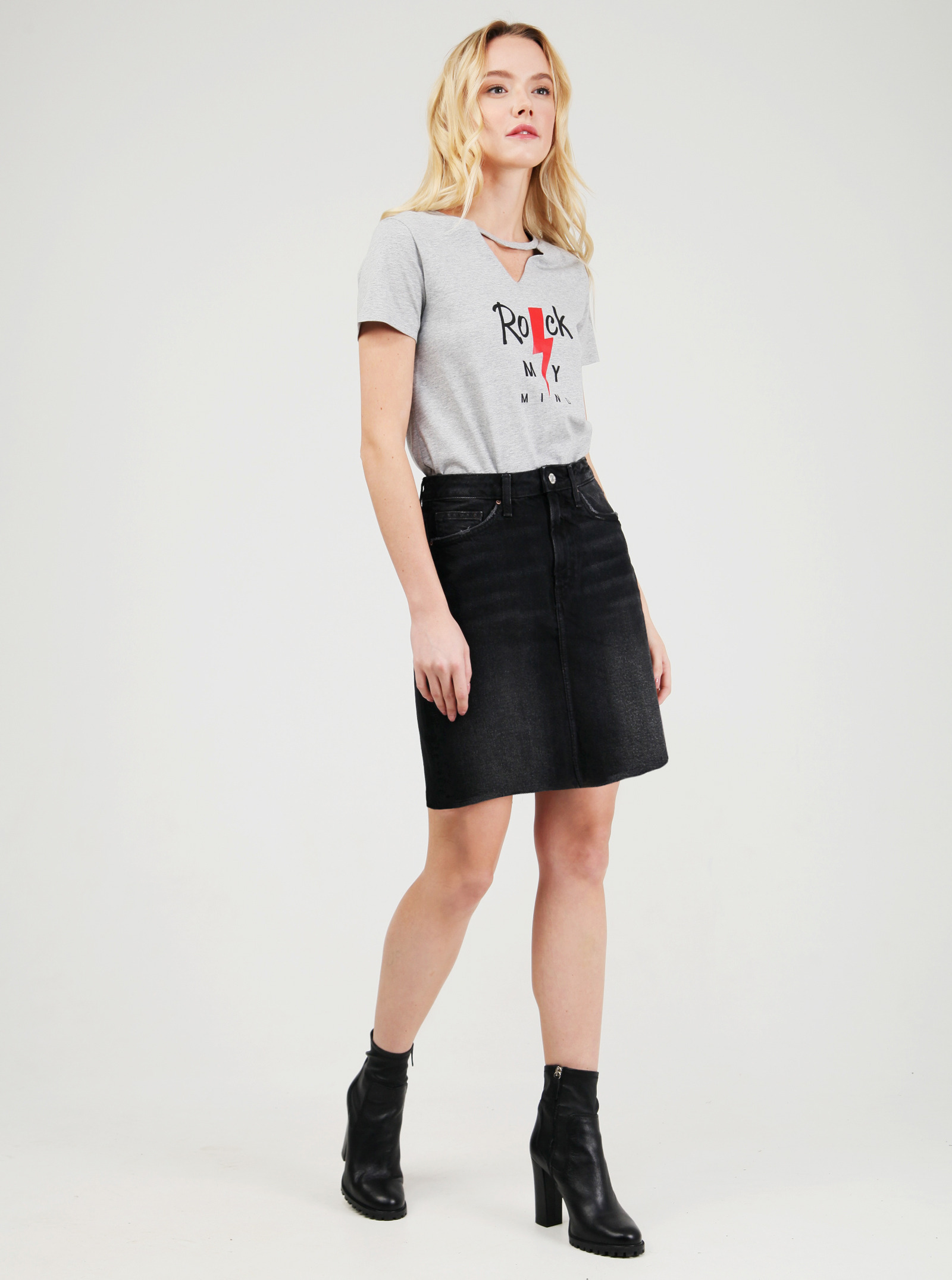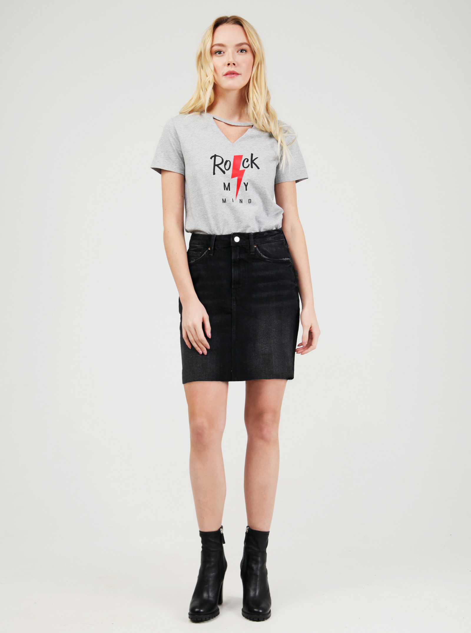 Модная джинсовая юбка из плотной хлопковой ткани с легкими потертостями и обрезанным низом.