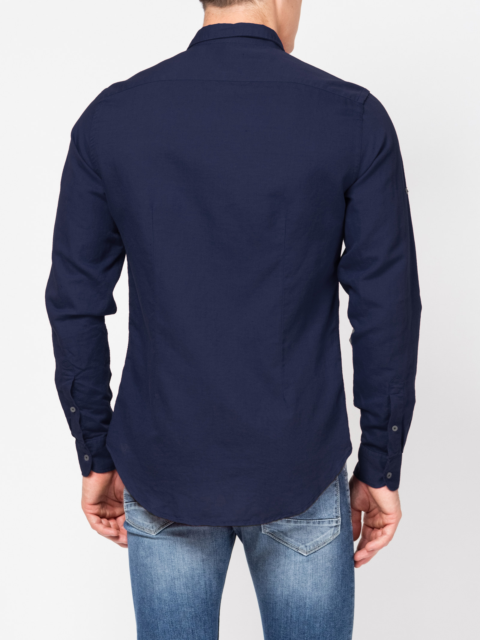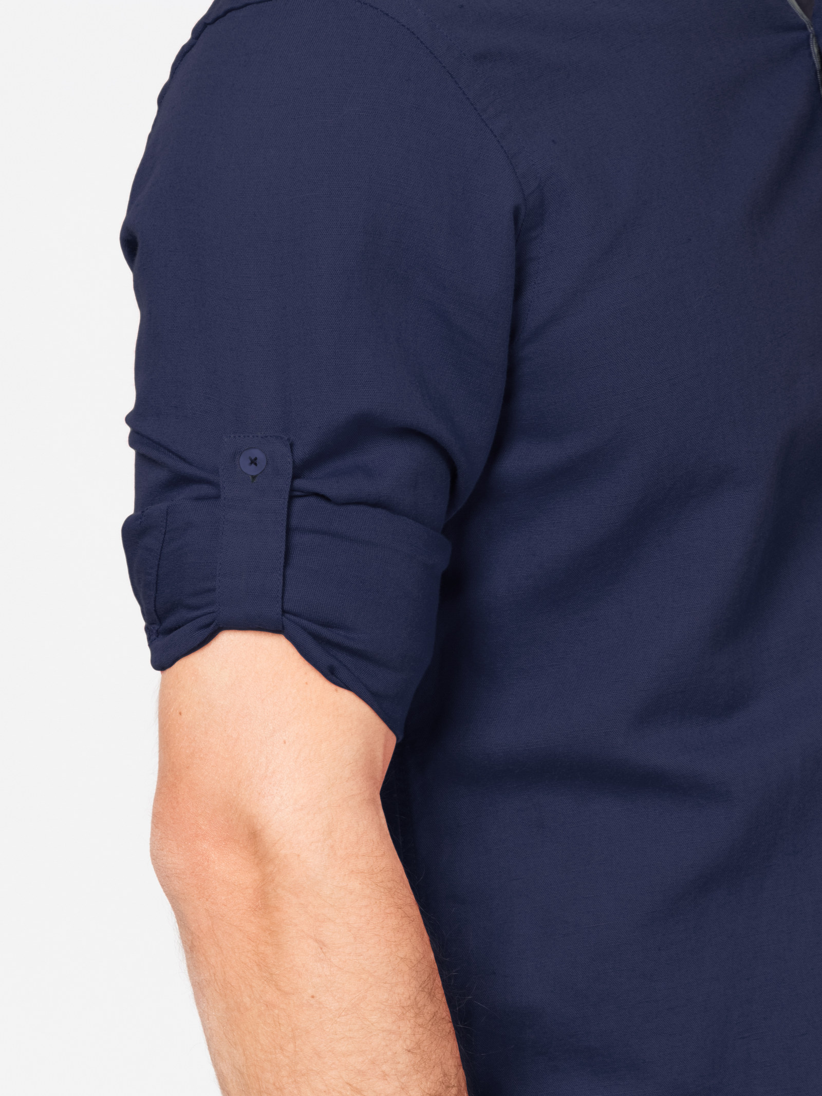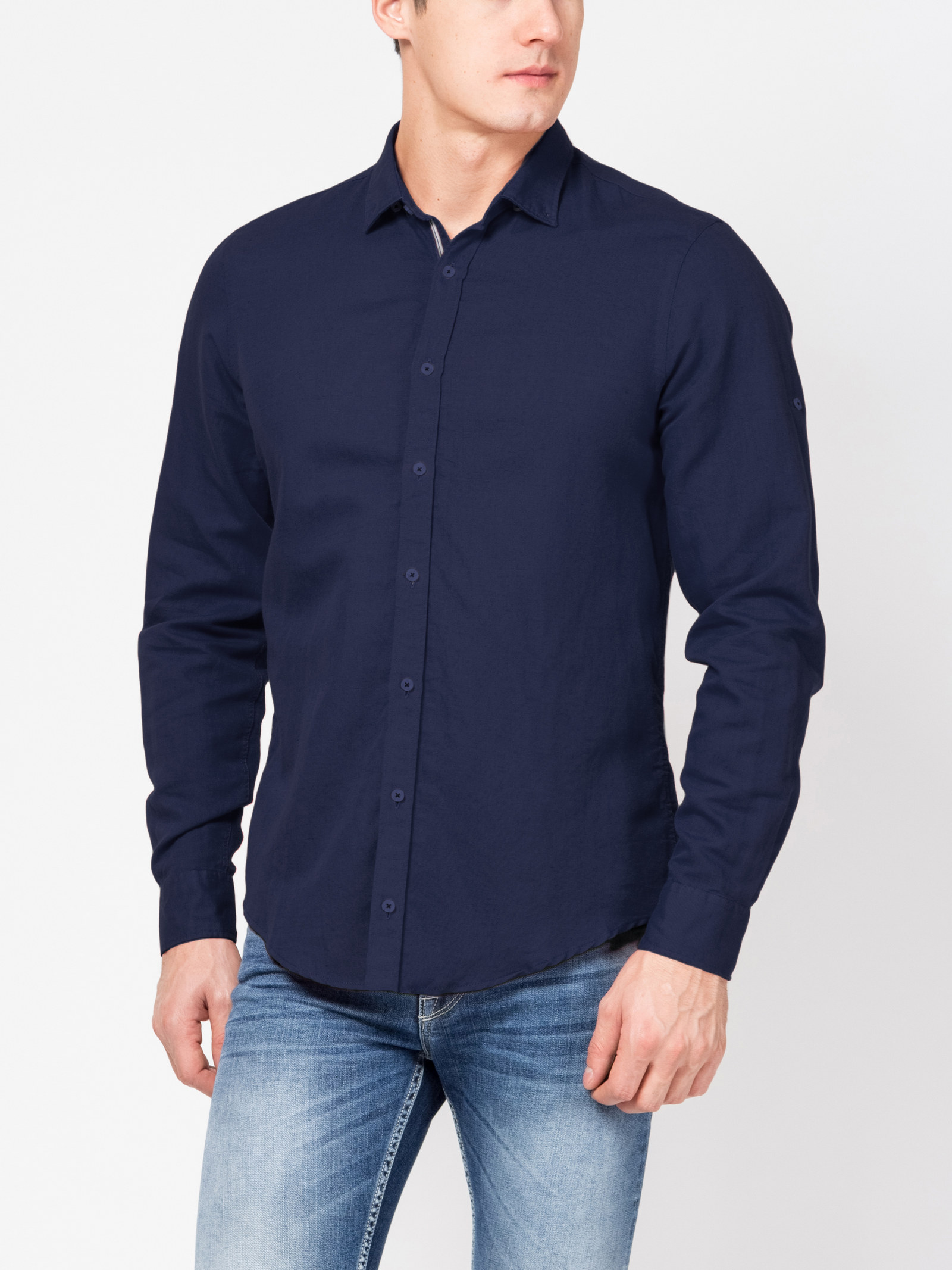 Рубашка изо льна, длинный рукав с подкатом, с контрастным кантом по внутренней стороне планки, с талиевыми вытачками сзади