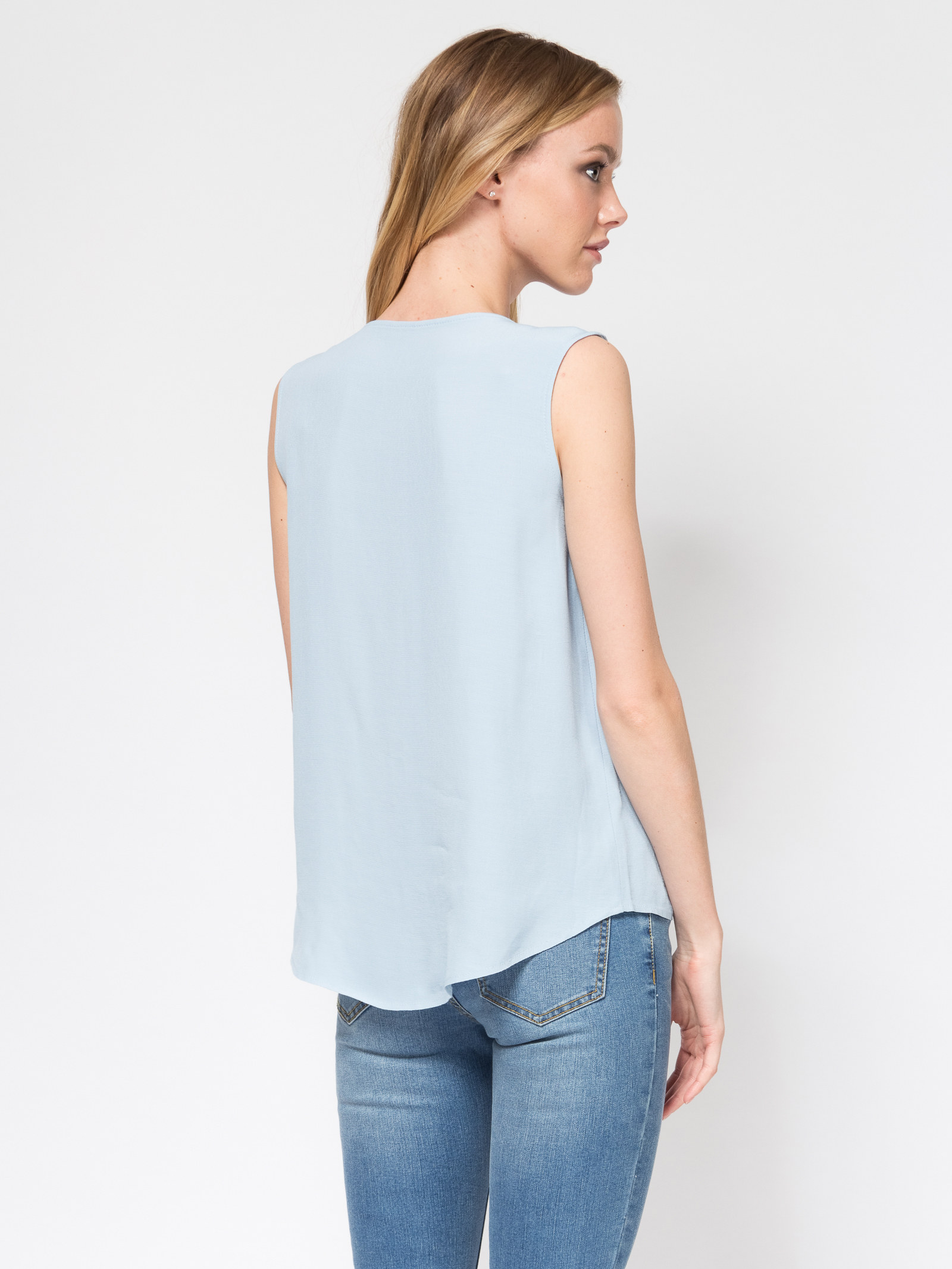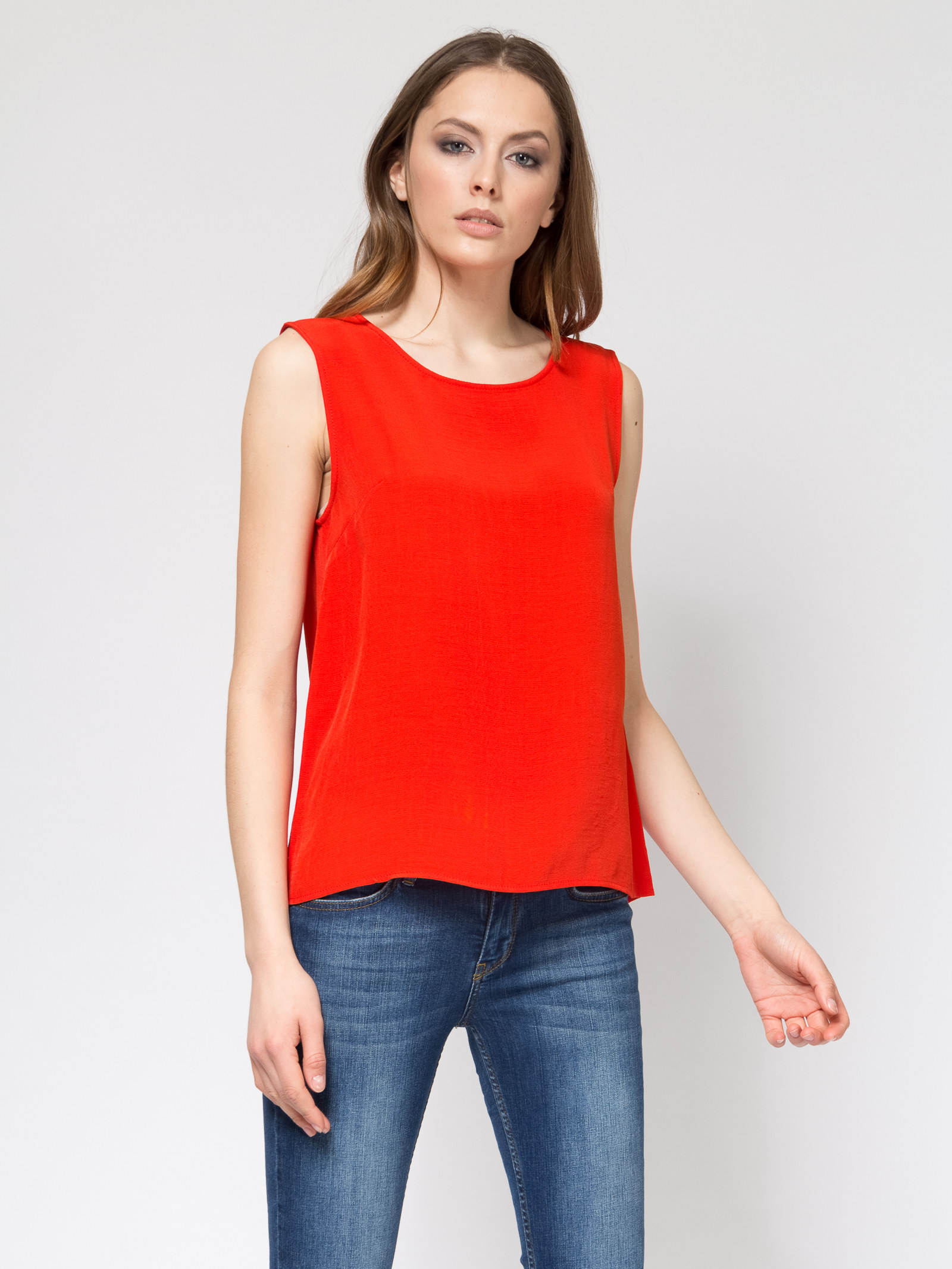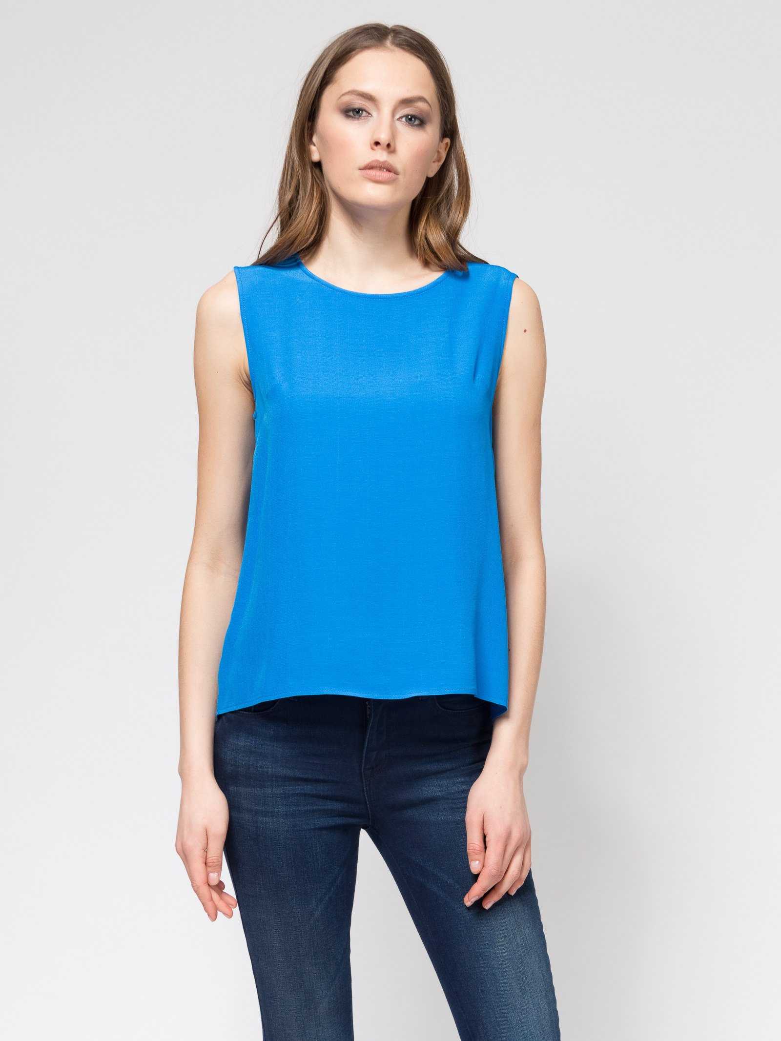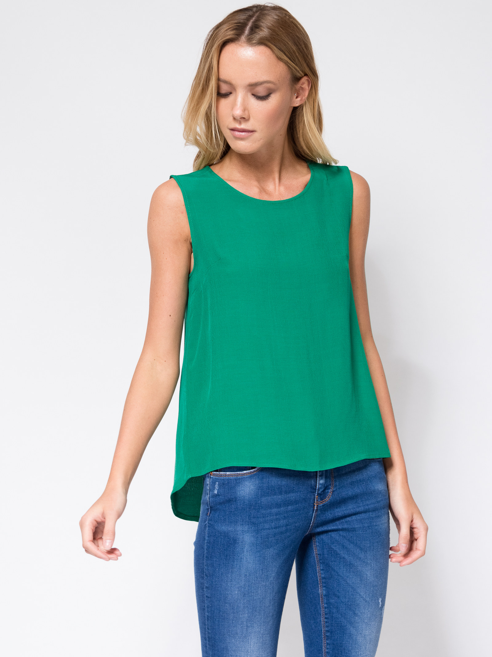 Топ без рукавов, круглый вырез горловины, свободный силуэт, спинка длинее переда, ткань вискоза с легкой фактурой