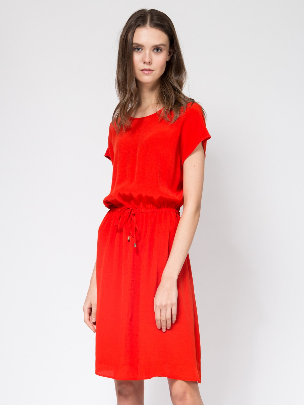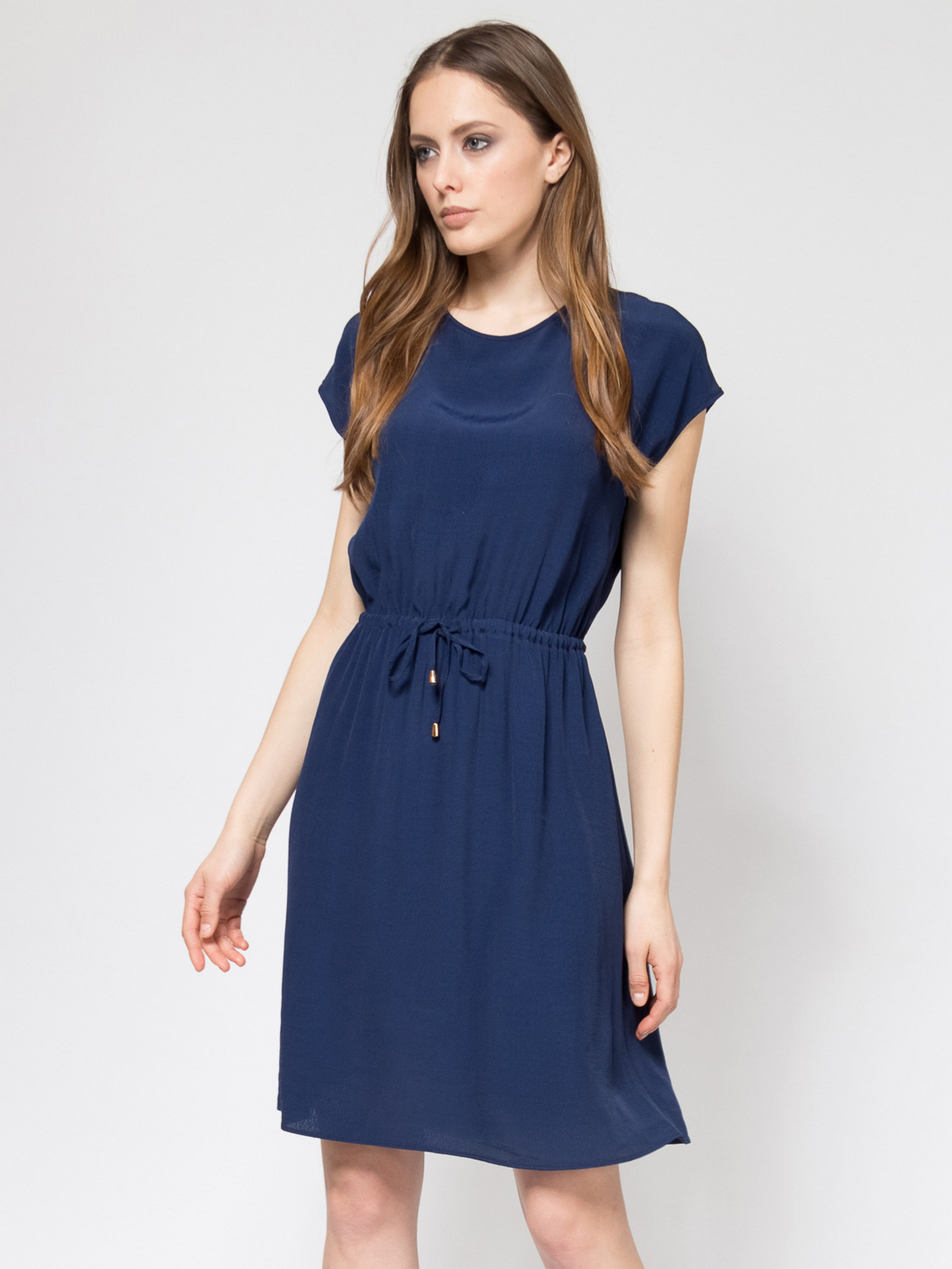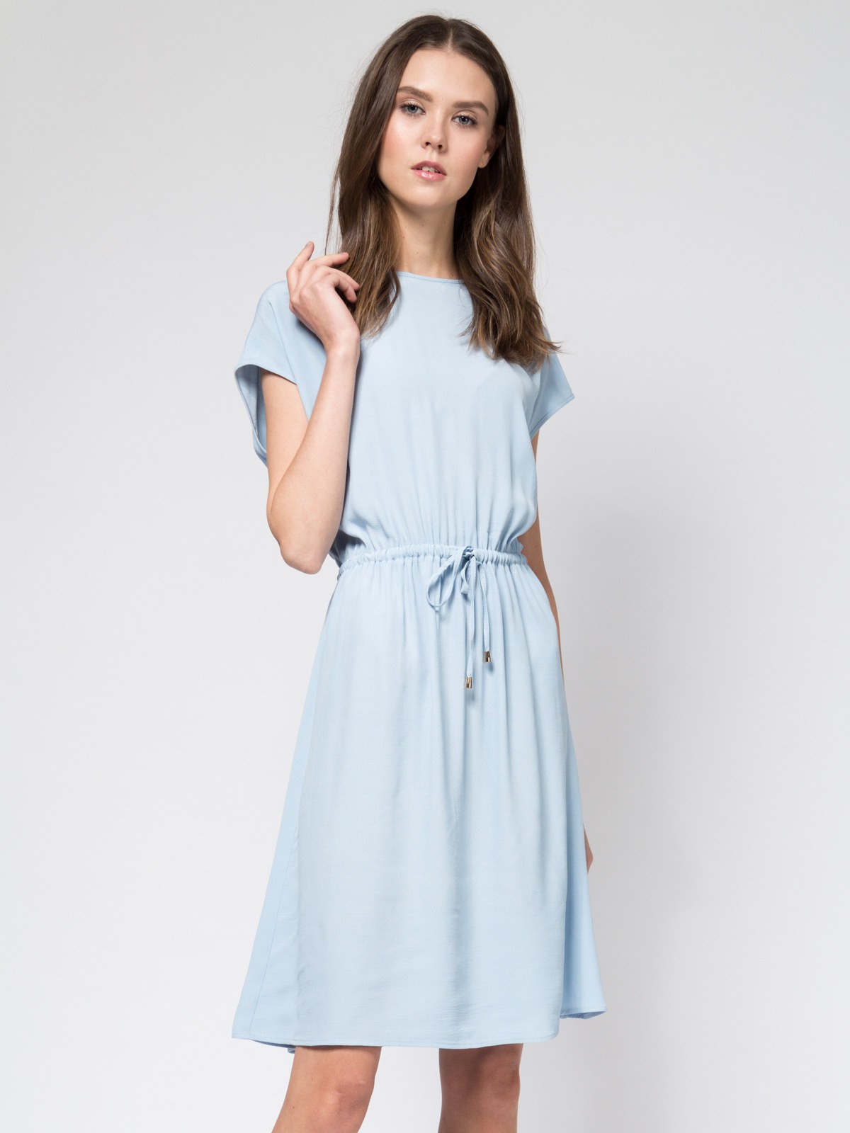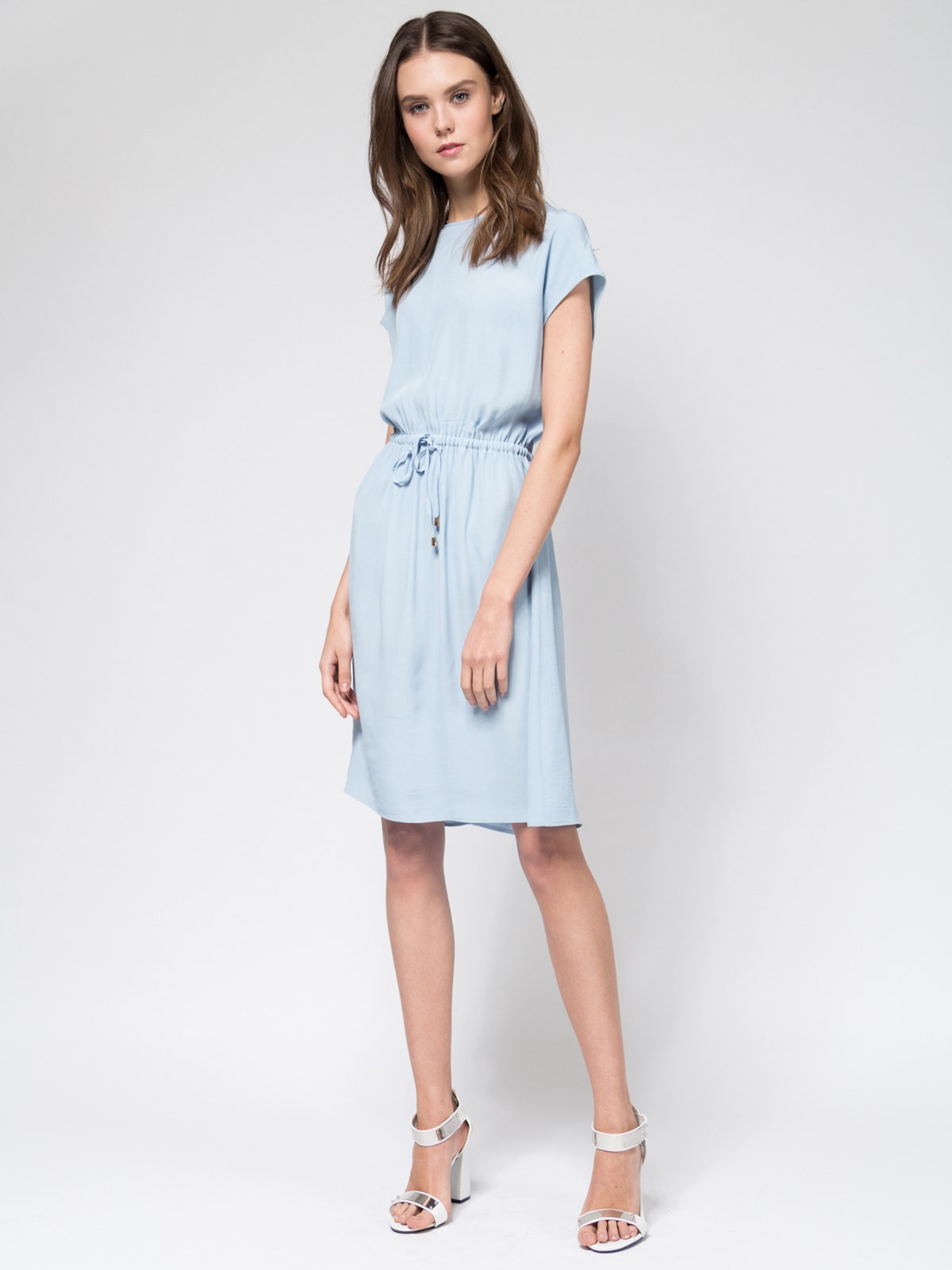 Платье без рукавов, свободный силуэт, круглая горловина, по талии кулиска со шнурком с металлическими наконечниками, сзади горловина на завяке с металлическими наконечниками