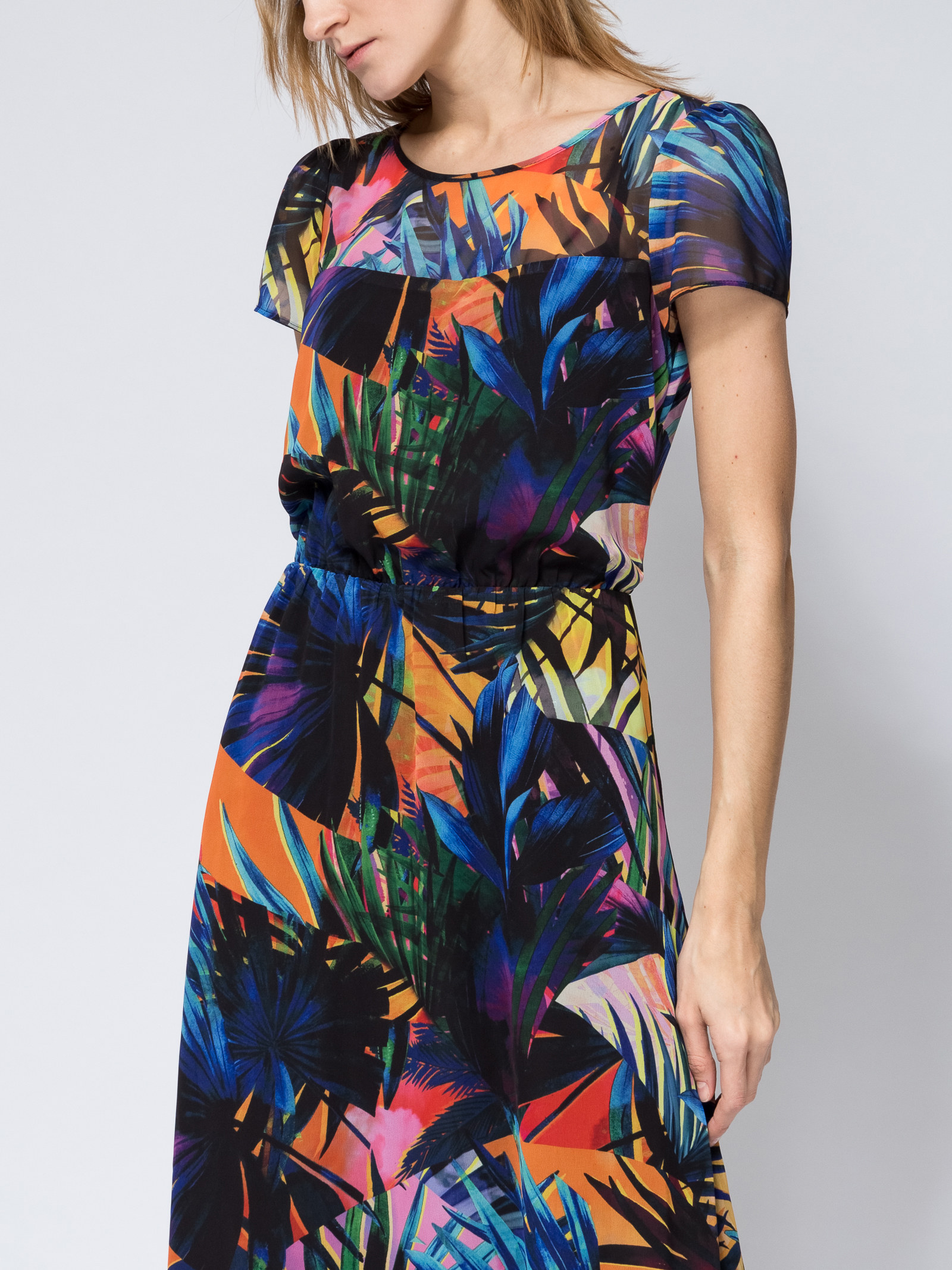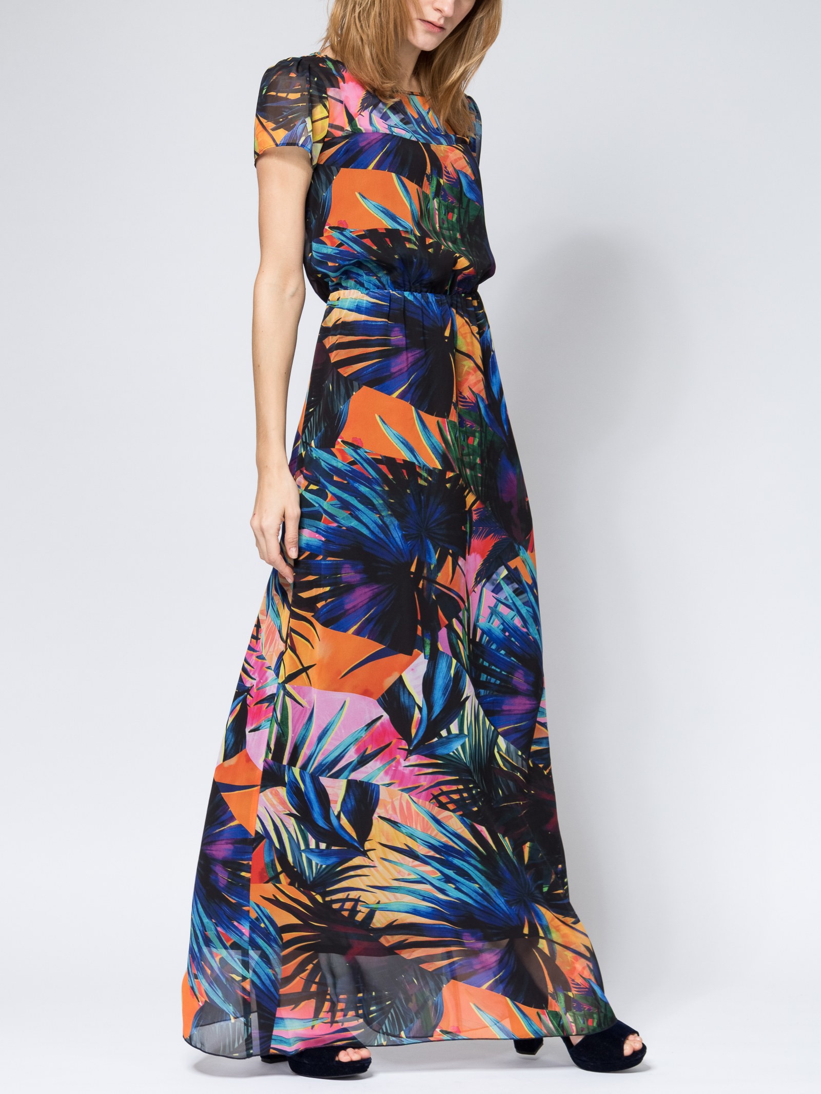Шифоновое платье с коротким рукавом, круглая горловина, силуэт свободный, талия на резинке, платье с трикотажной подкладкой спереди и в юбке, длина в пол