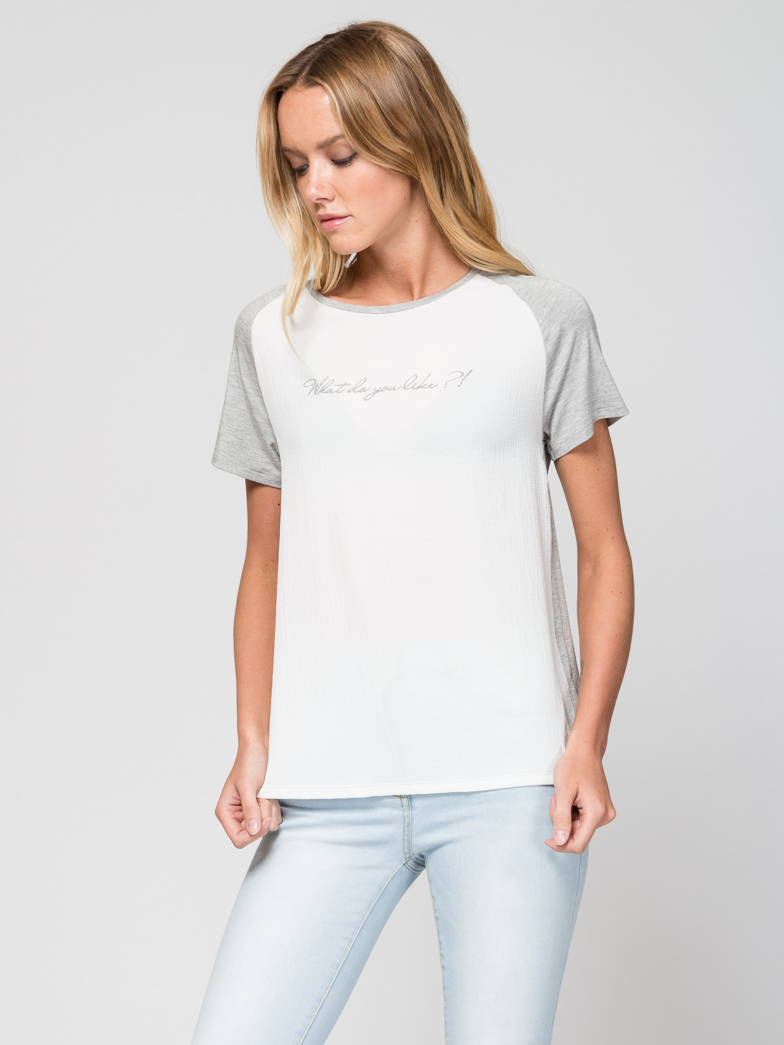 Футболка из вискозы, свободный силуэт, рукава - реглан короткие, полочка из фактурного полиэстра, принт с металлическим эффектом