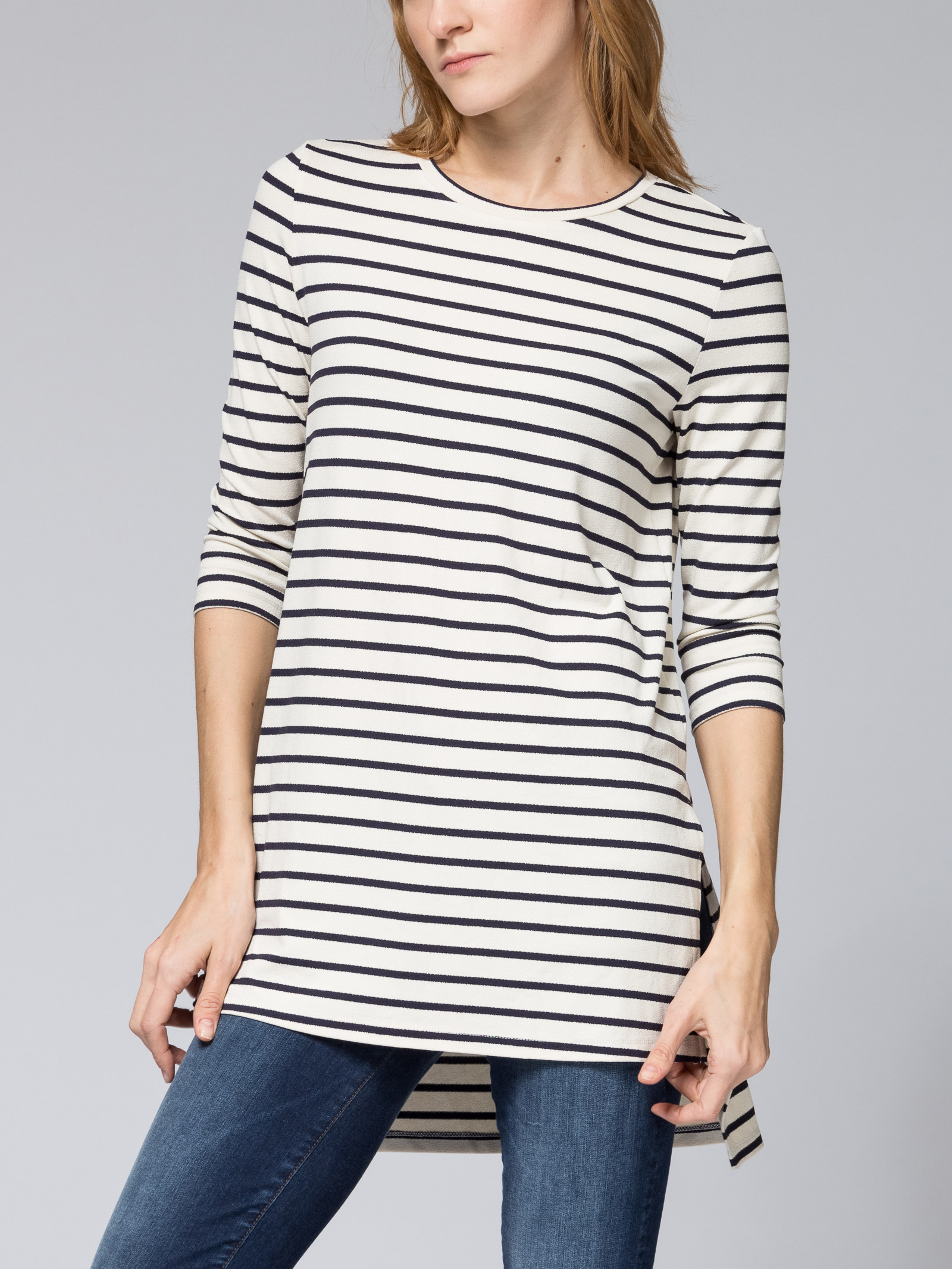 Туника из кроеного трикотажа в полоску, рукав 3/4, свободный силуэт, спинка длинее полочки, по бокам разрезы