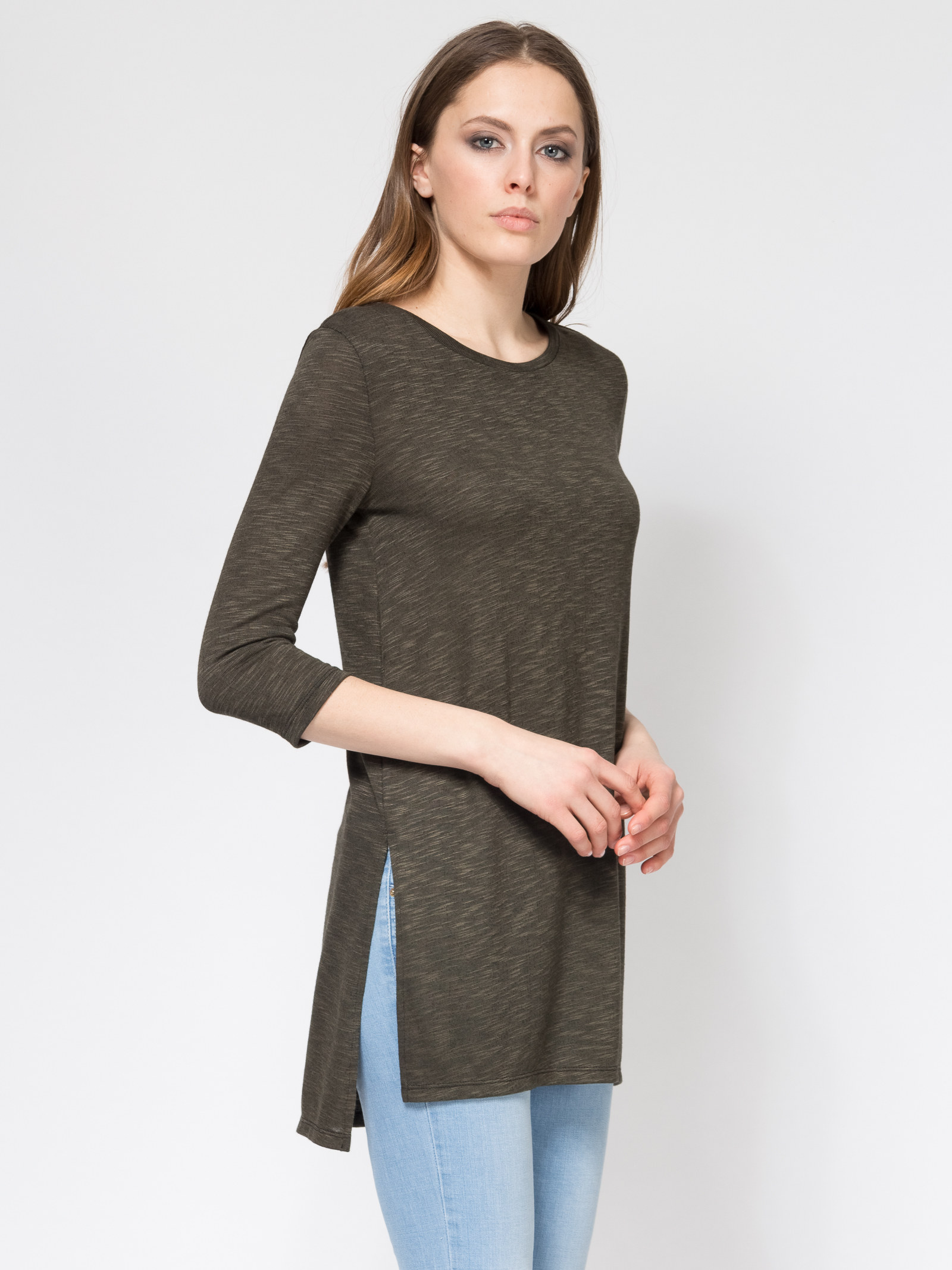 Туника из кроеного трикотажа , рукав 3/4, свободный силуэт, спинка длинее полочки, по бокам разрезы