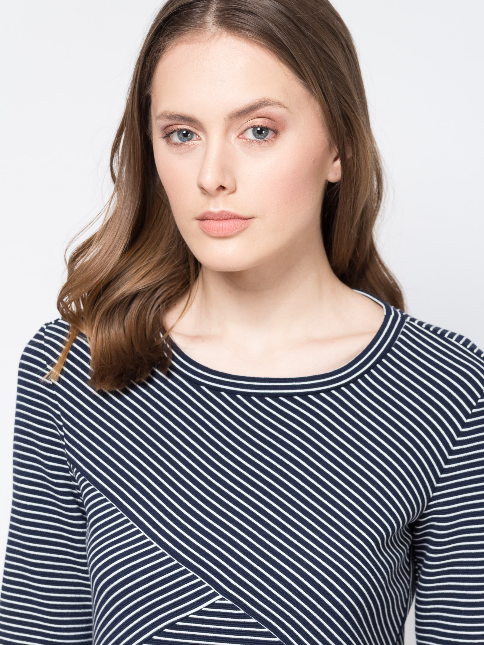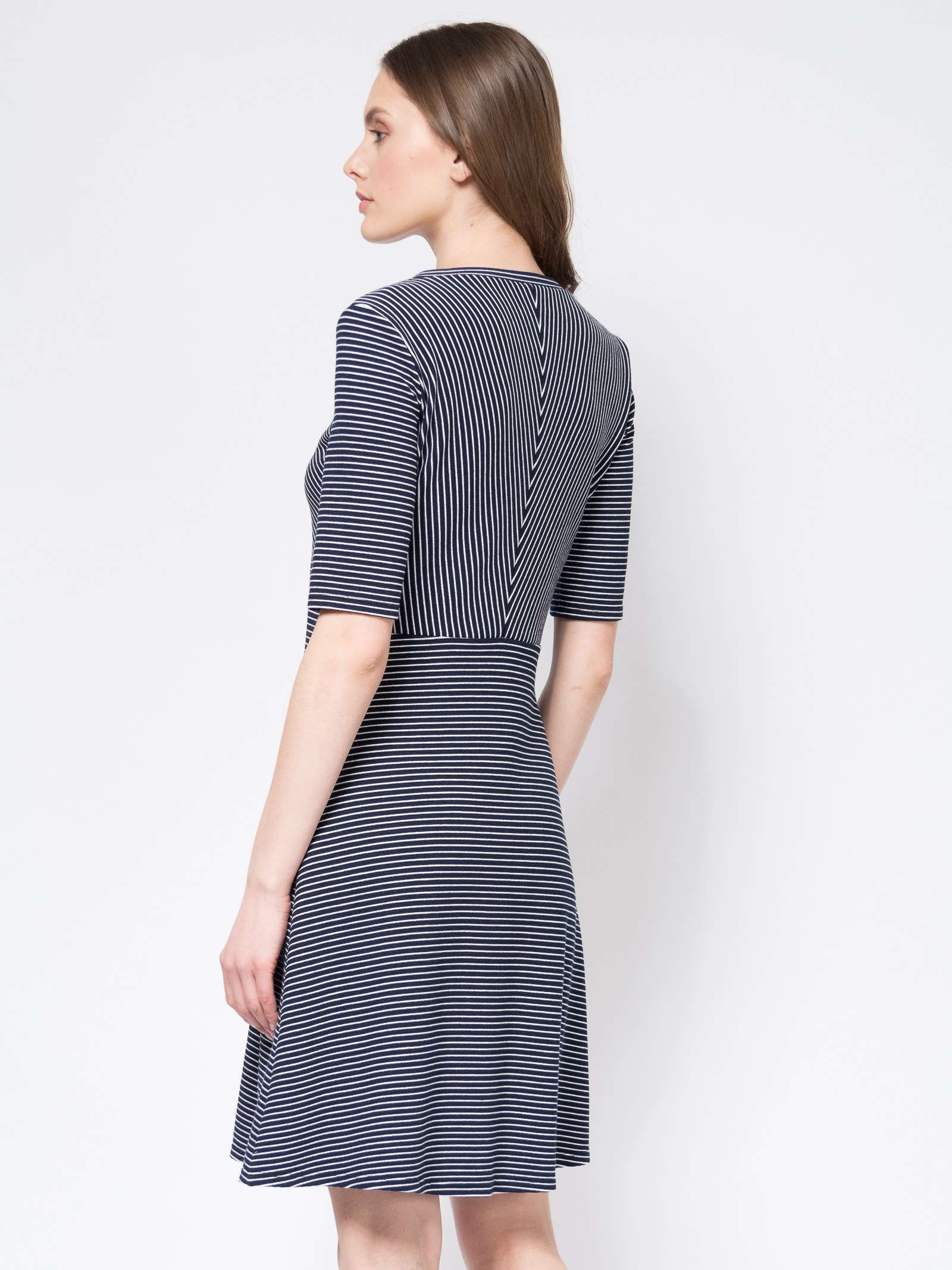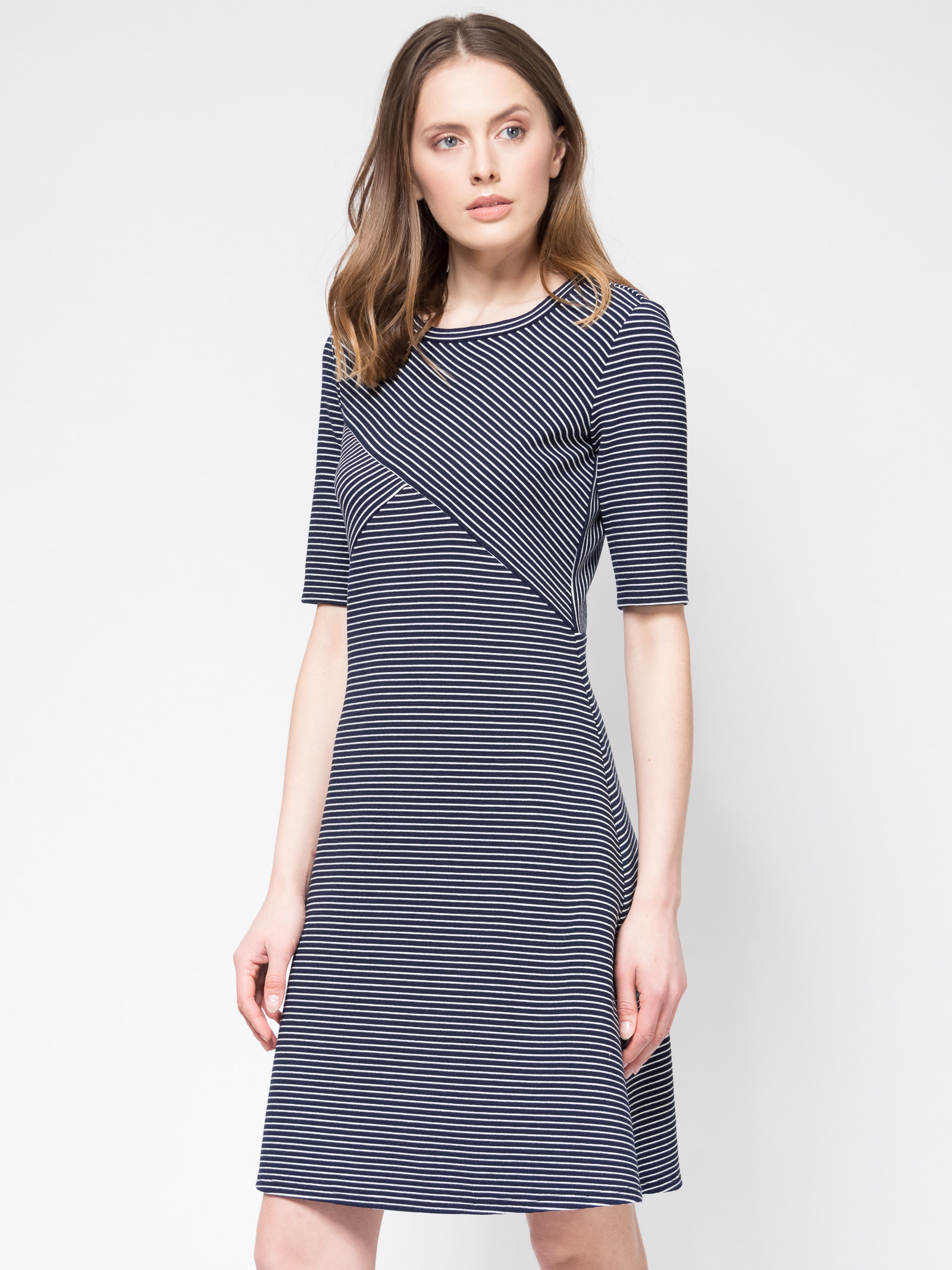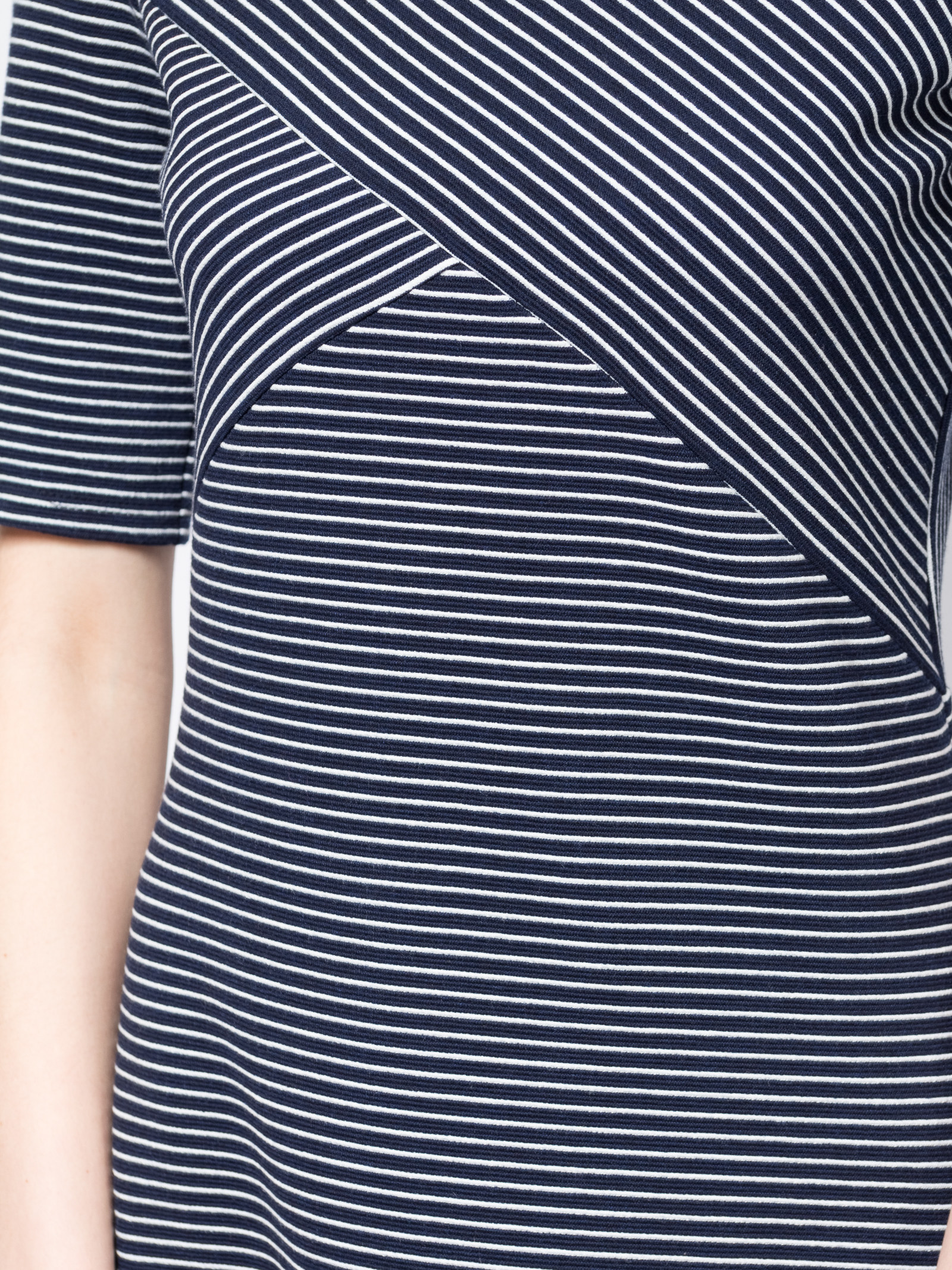 Платье из фактурной ткани в полоску, с членениями по переду, рукава короткие, полуприлегающий силуэт, длина выше колена