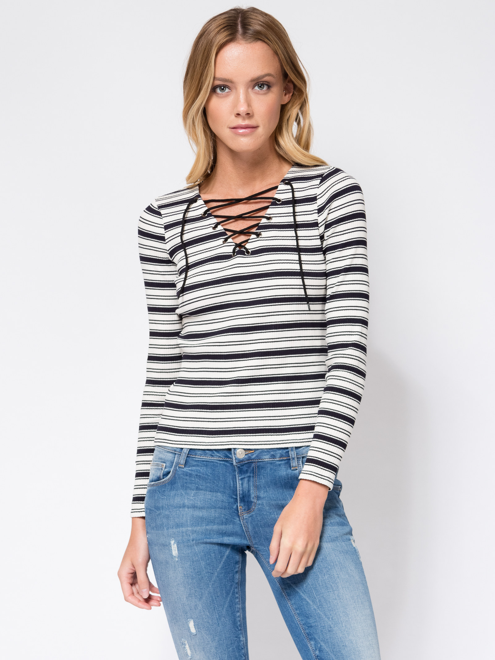 Джемпер в полоску из фактурной ткани в рубчик, V-вырез, горловина на шнуровке, полуприлегающий силуэт, длинный рукав