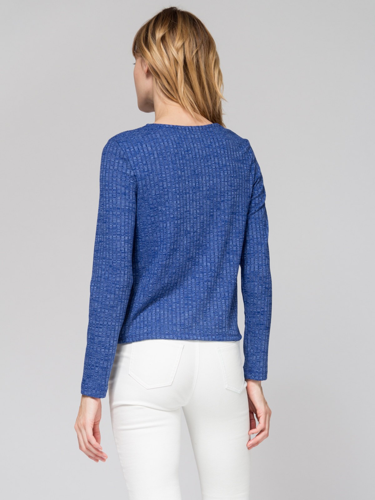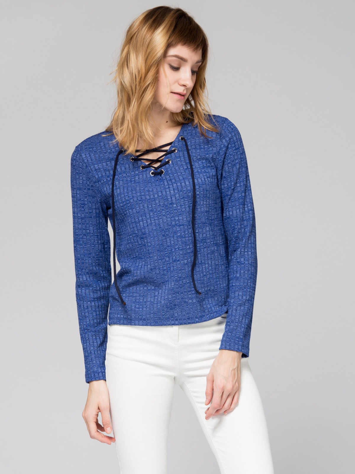 Футболка из фактурной ткани в рубчик, горловина с V-вырезом, по горловине шнуровка, рукава длинные, полуприлегающий силуэт