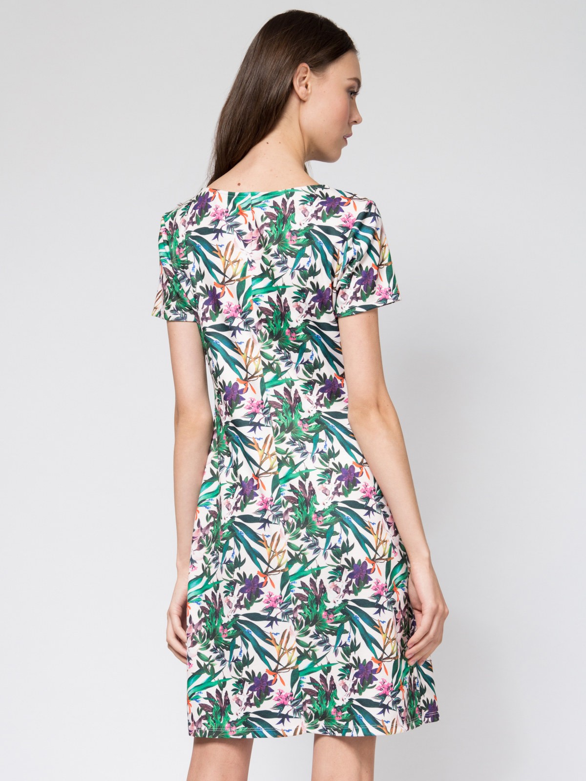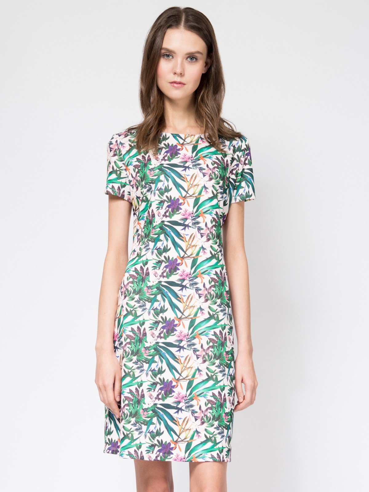 Платье из принтованного трикотажа, короткий рукав, приталенный силуэт с разклешенной к низу юбкой, длина выше колена