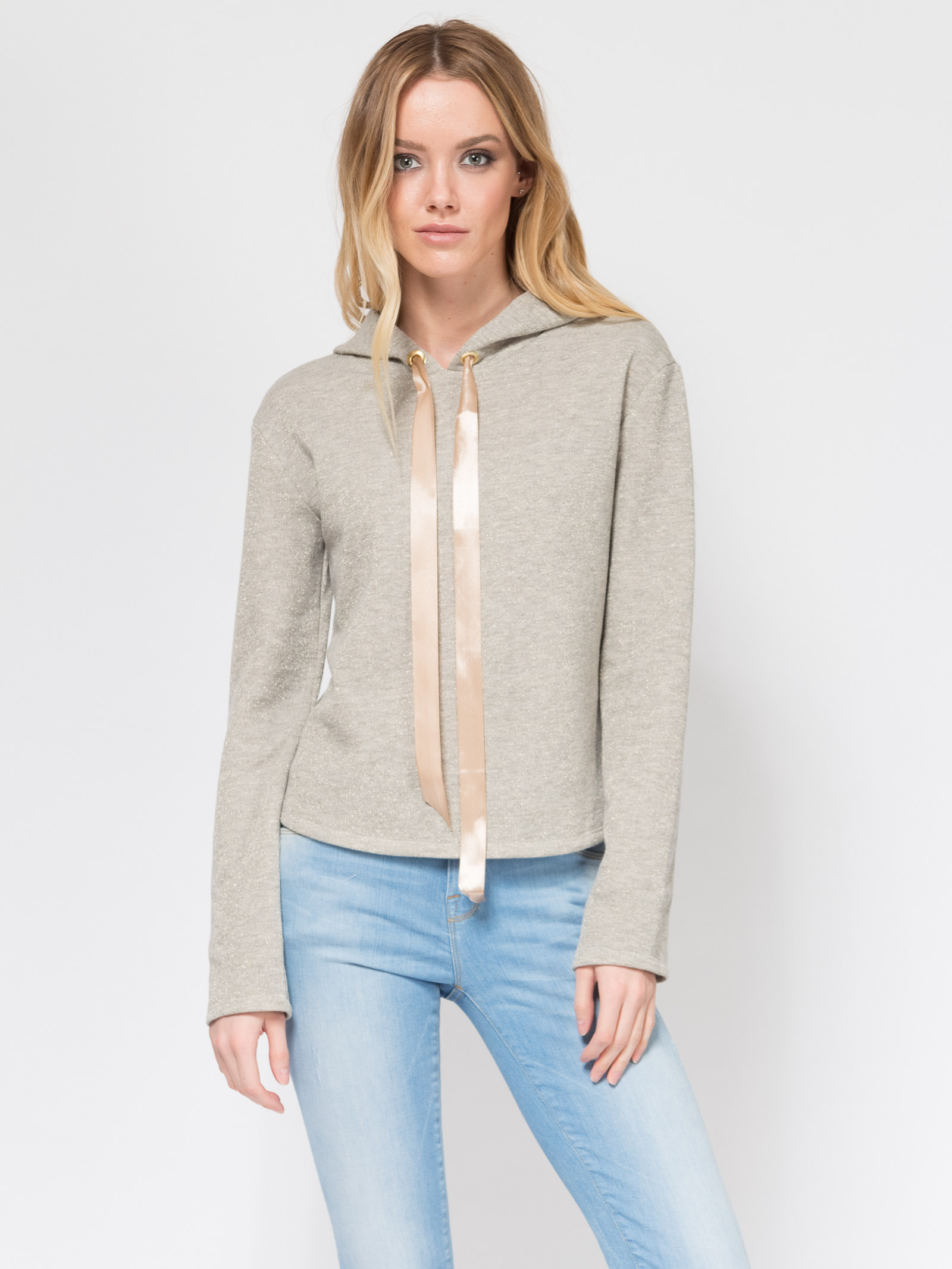 Толстовка из футера с люрексом, с капюшоном и широкими атласными лентами, длинный рукав, свободный силуэт, спущенная линия плеча