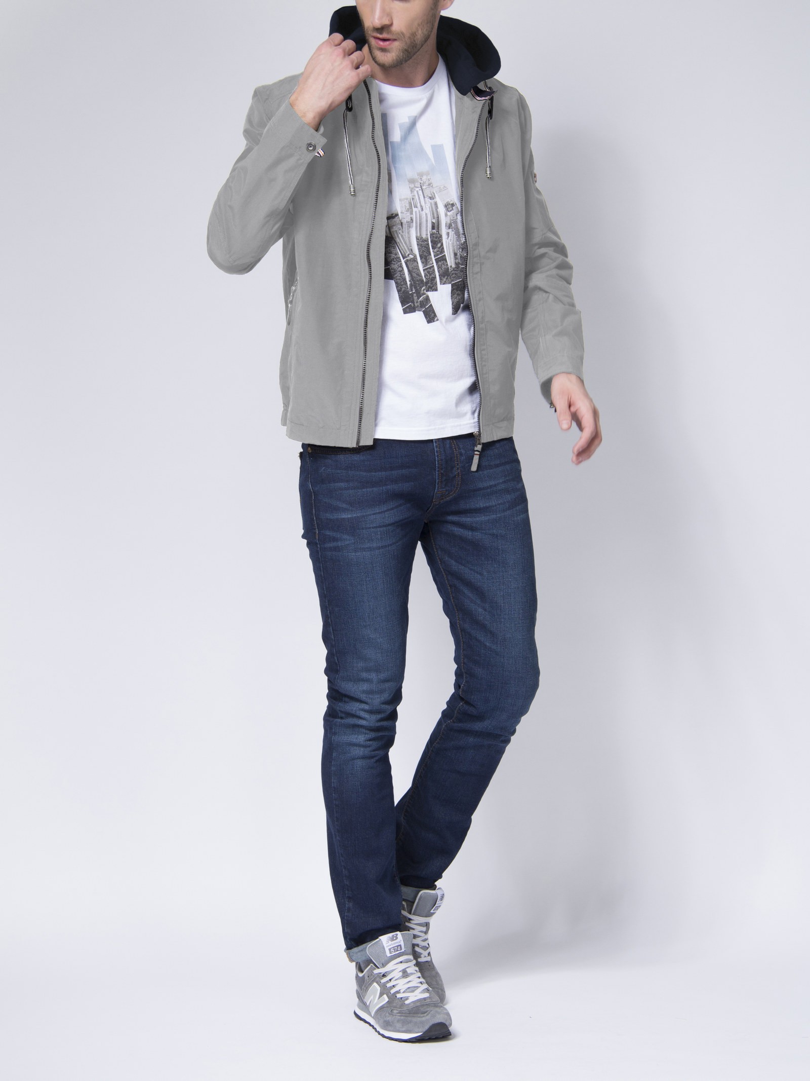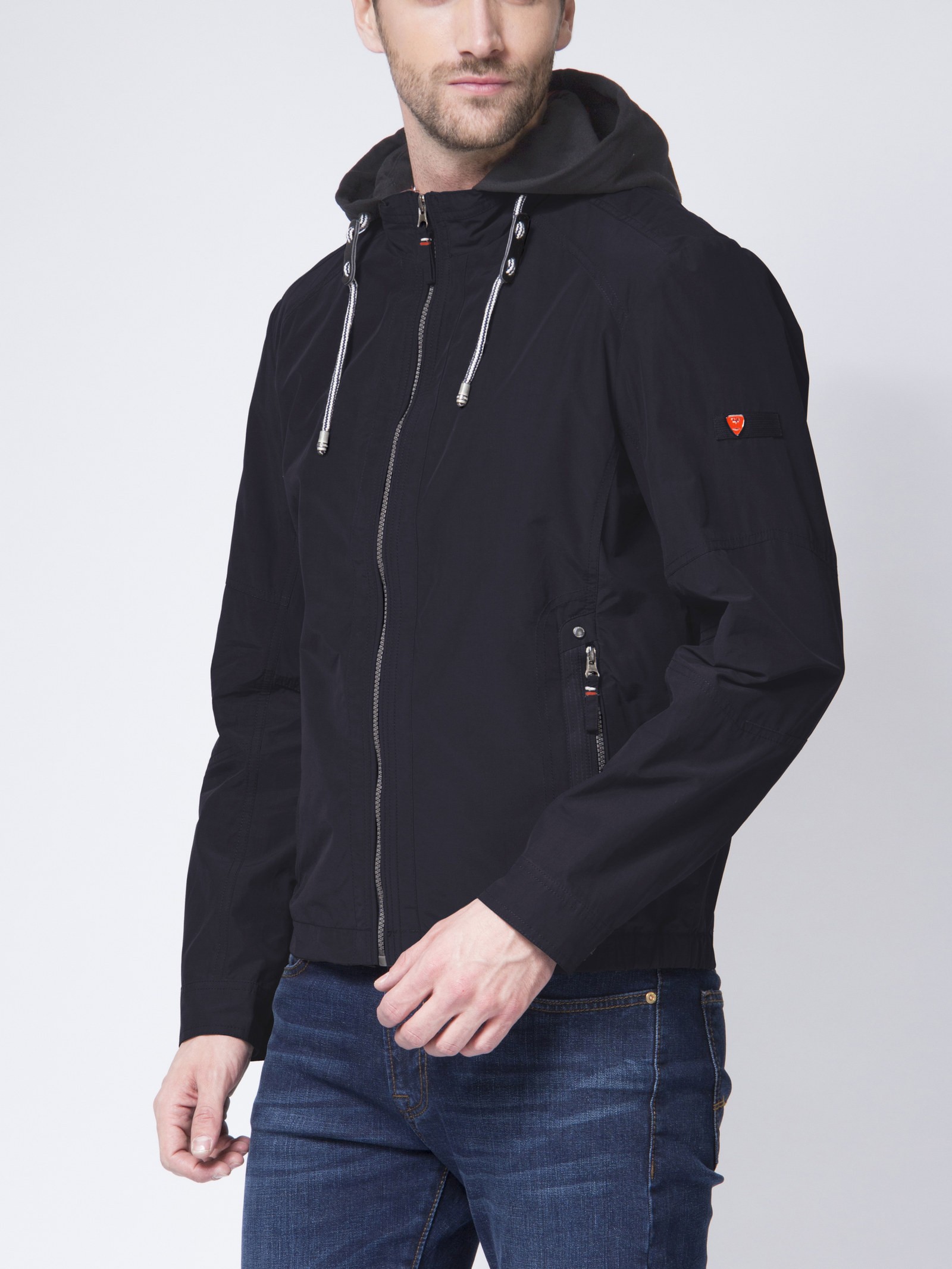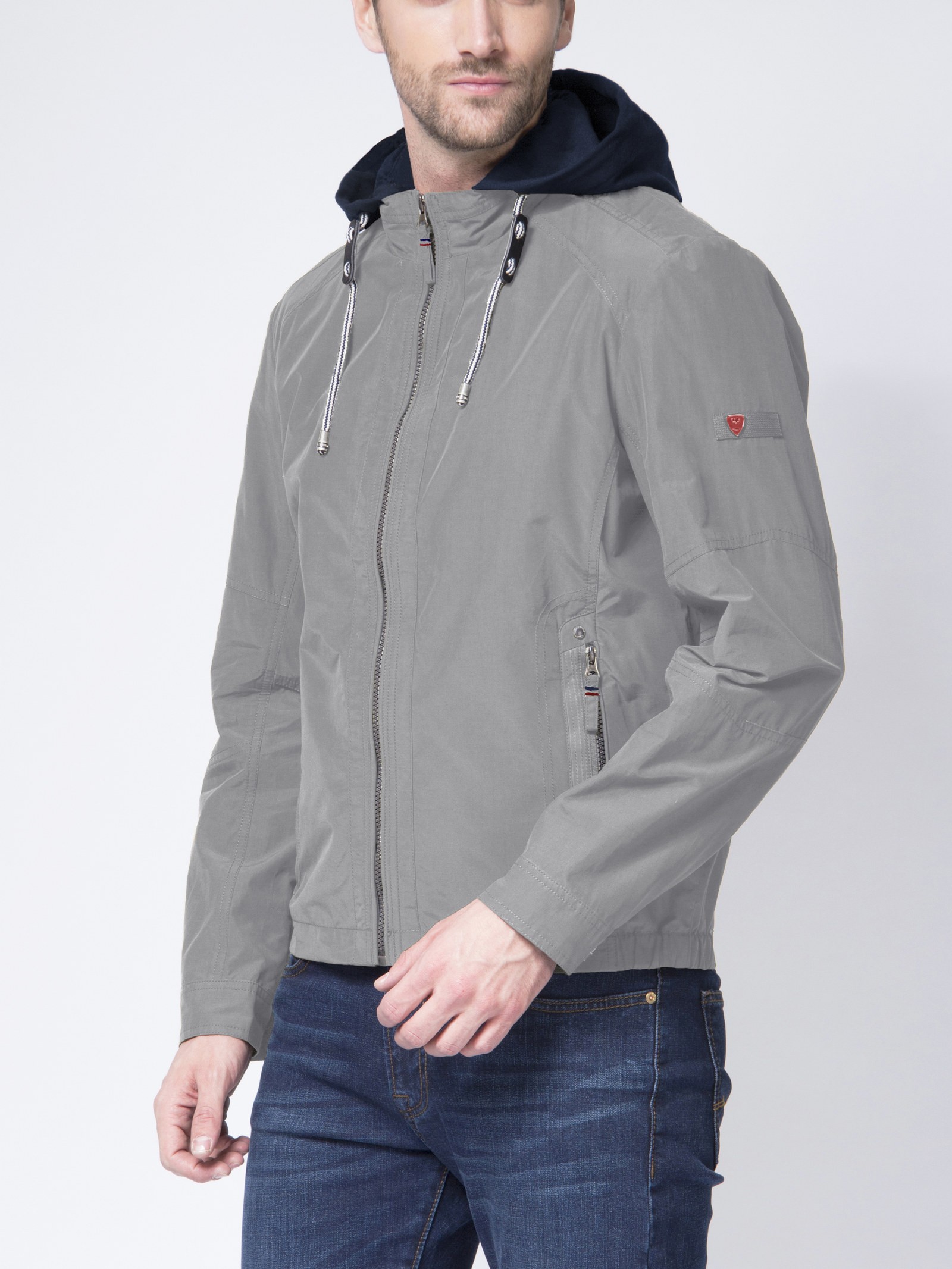 Короткая ветровка из смесовой ткани с хлопком и контрастными деталями. Куртка с черным, трикотажным капюшоном. Застежка молния, боковые карманы на молнии с декоративной отстрочкой. Интересная подкладка с яркими деталями. По низу куртки резинка.