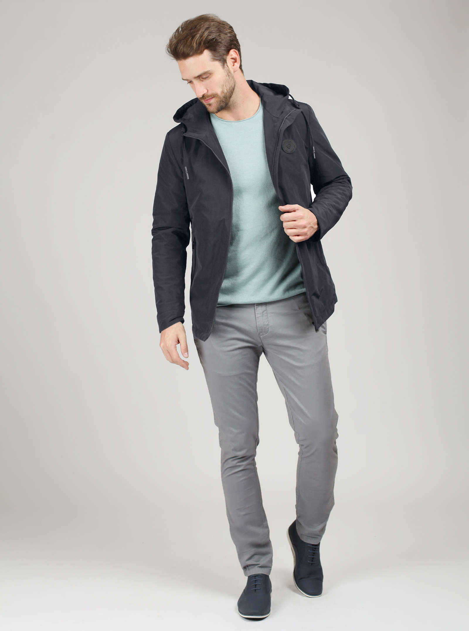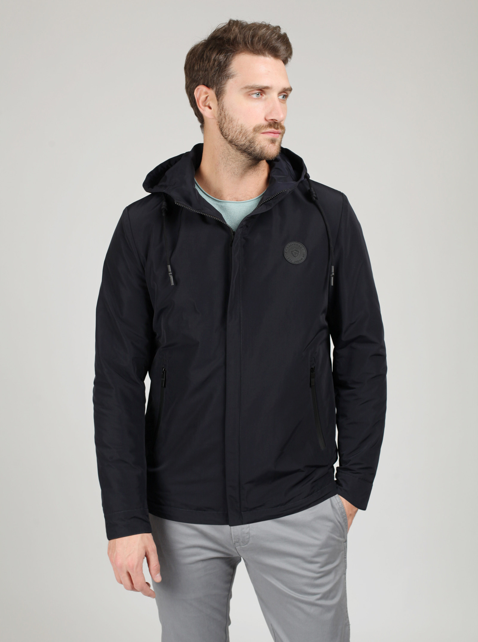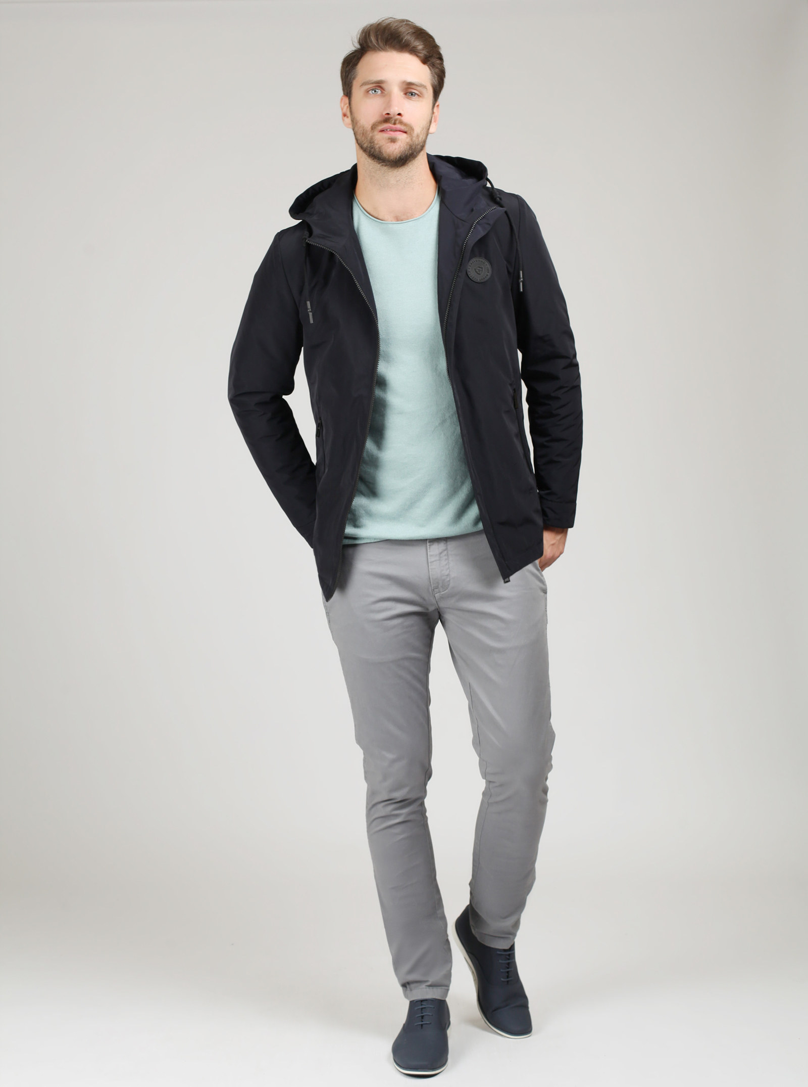 Куртка из плотной водоотталкивающей ткани на тонкой утепленной простеганной подкладке Капюшон не съемный, по его краю продернут толстый шнур для регулировки прилегания в случае непогоды. Можно также затянуть кулисками изделие по низу куртки и регулировать степень прилегания рукава двумя кнопками на манжете. Вас порадует также и наличие внутренних карманов на молнии на уровне груди и контрастная отделка на подкладке.