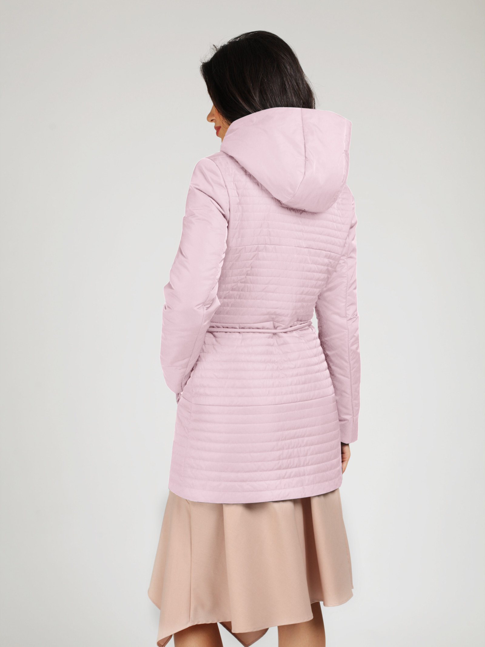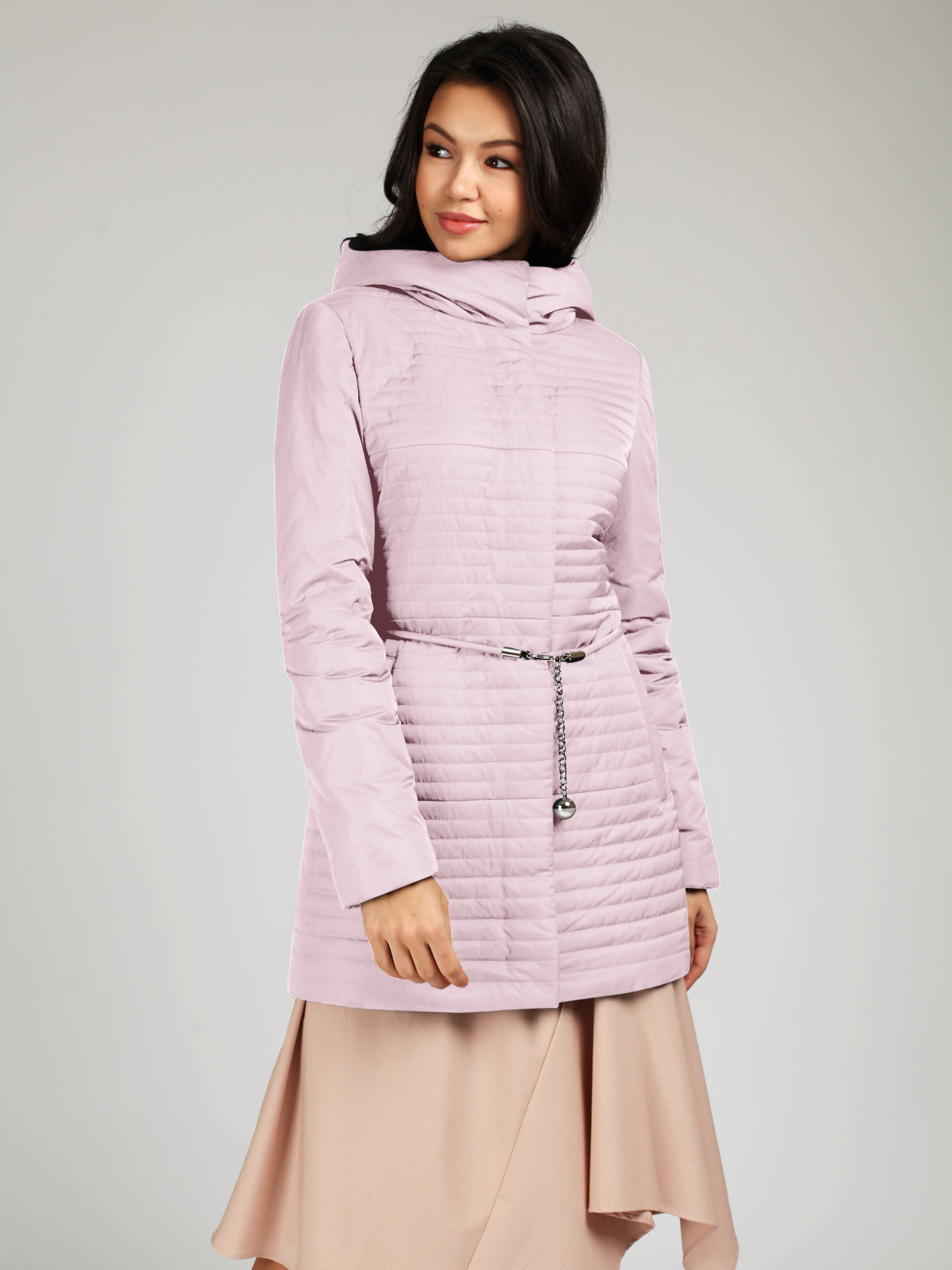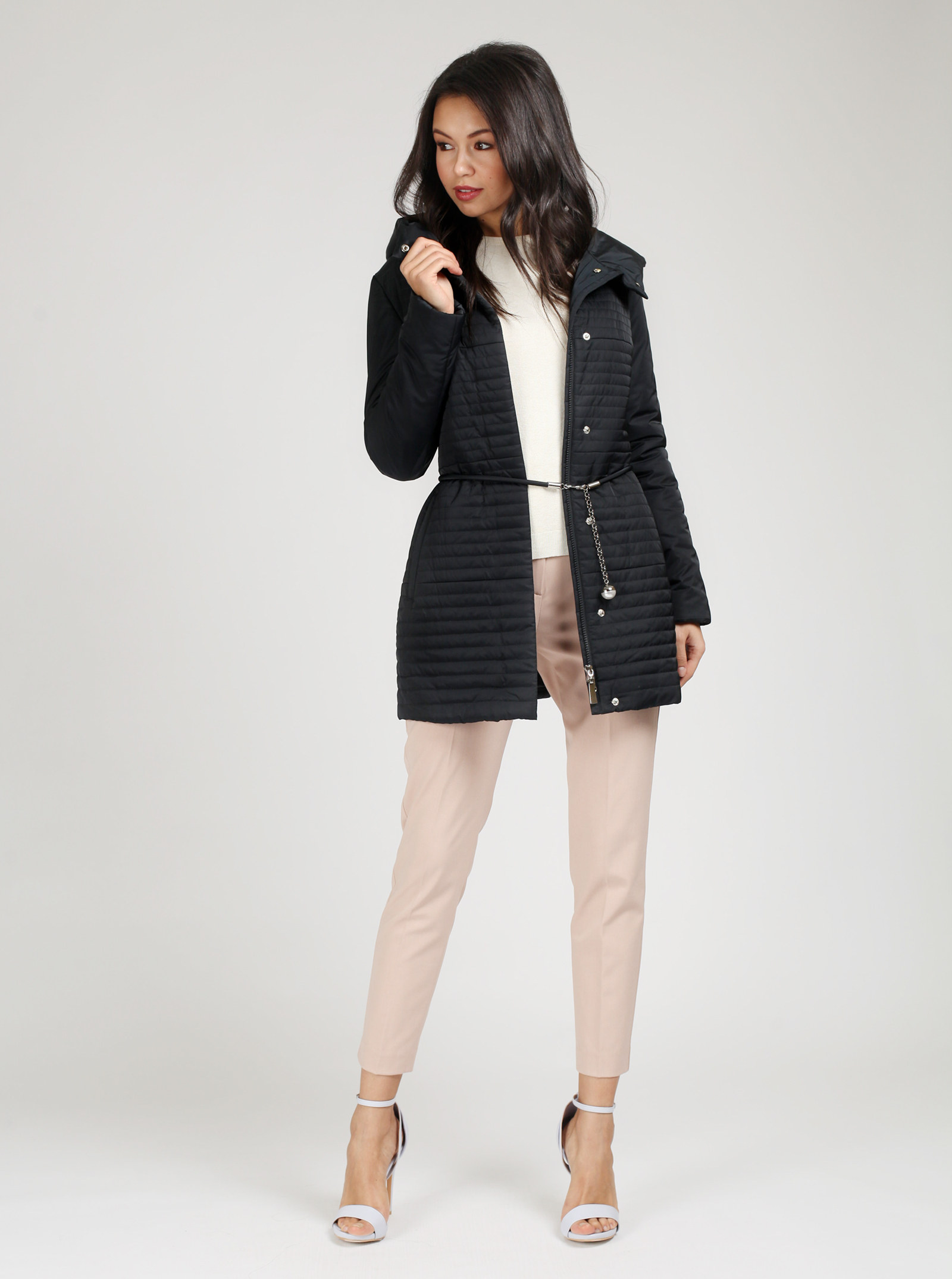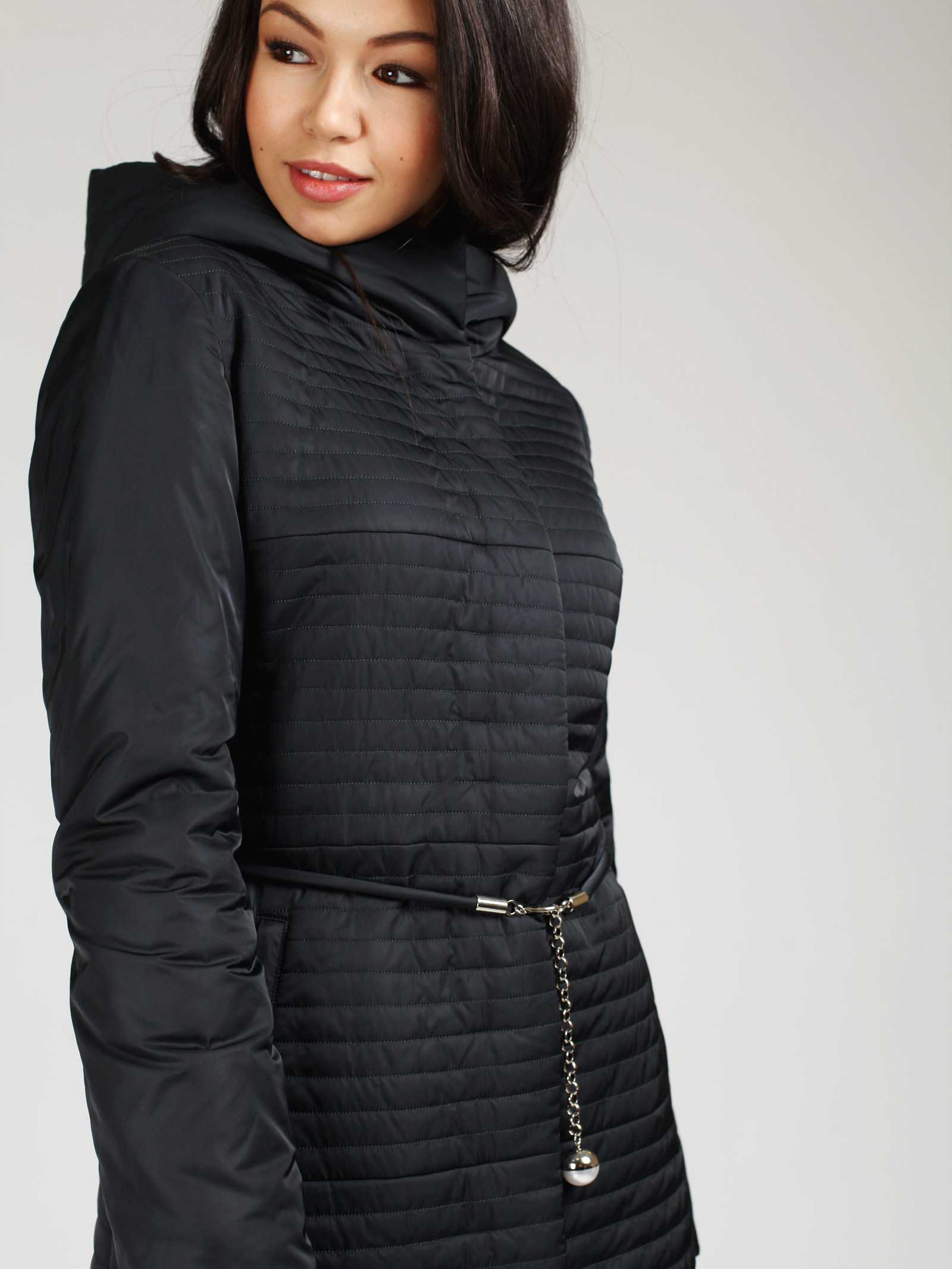 Пальто утепленное полуприлегающее, отрезное по линии талии. Верхняя и нижняя части пальто имеют разную ширину стежки. На капюшоне и рукавах ее нет, в совокупности получился весьма оригинальный вид. Центральная застежка производится на молнию, также предусмотрена цельнокроеная планка с потайными кнопки. Капюшон объемный, не съемный с цельнокроеной стойкой. В качестве отделки предлагается тонкий плотный съемный пояс с эффектной застежкой.
