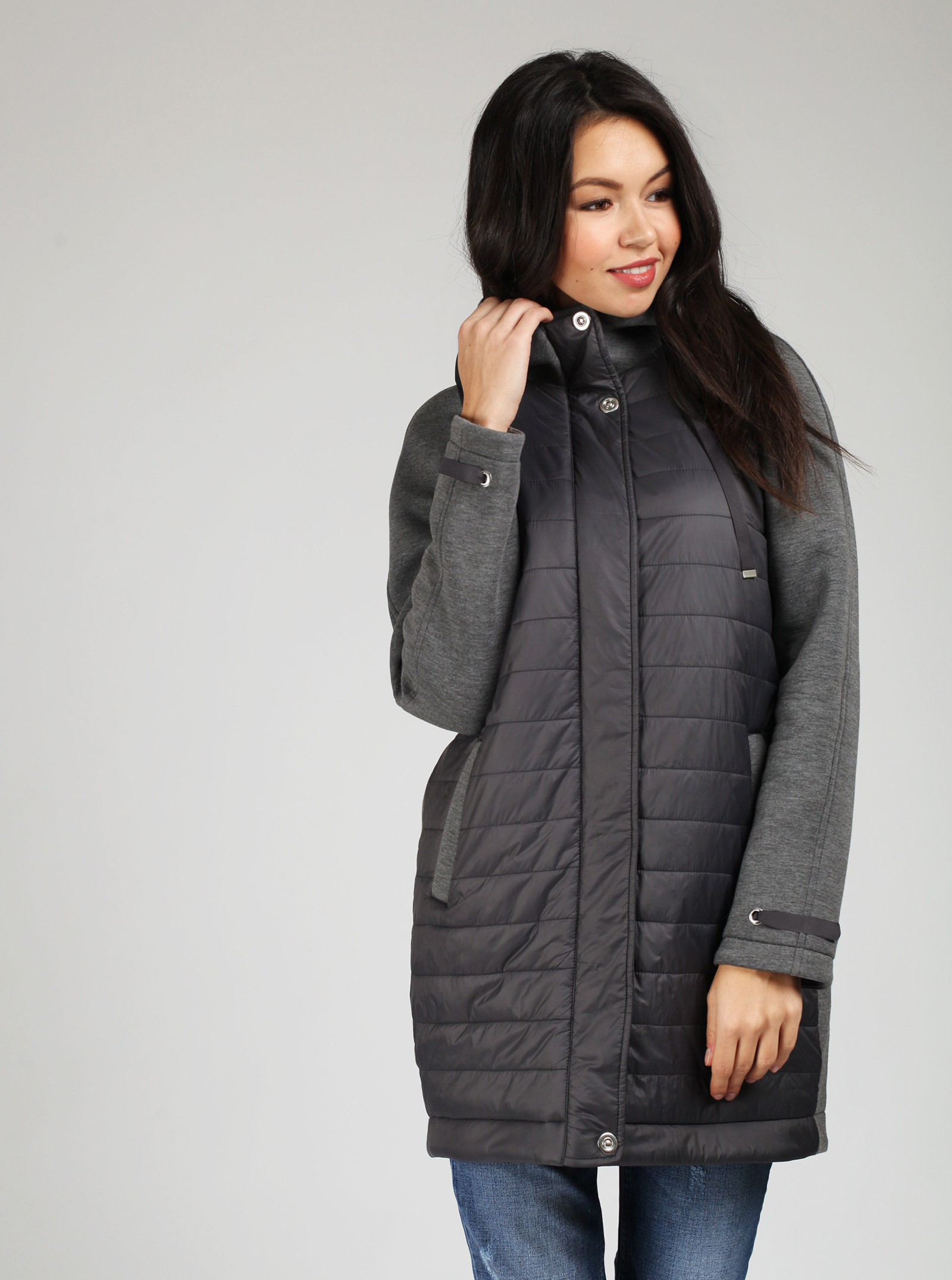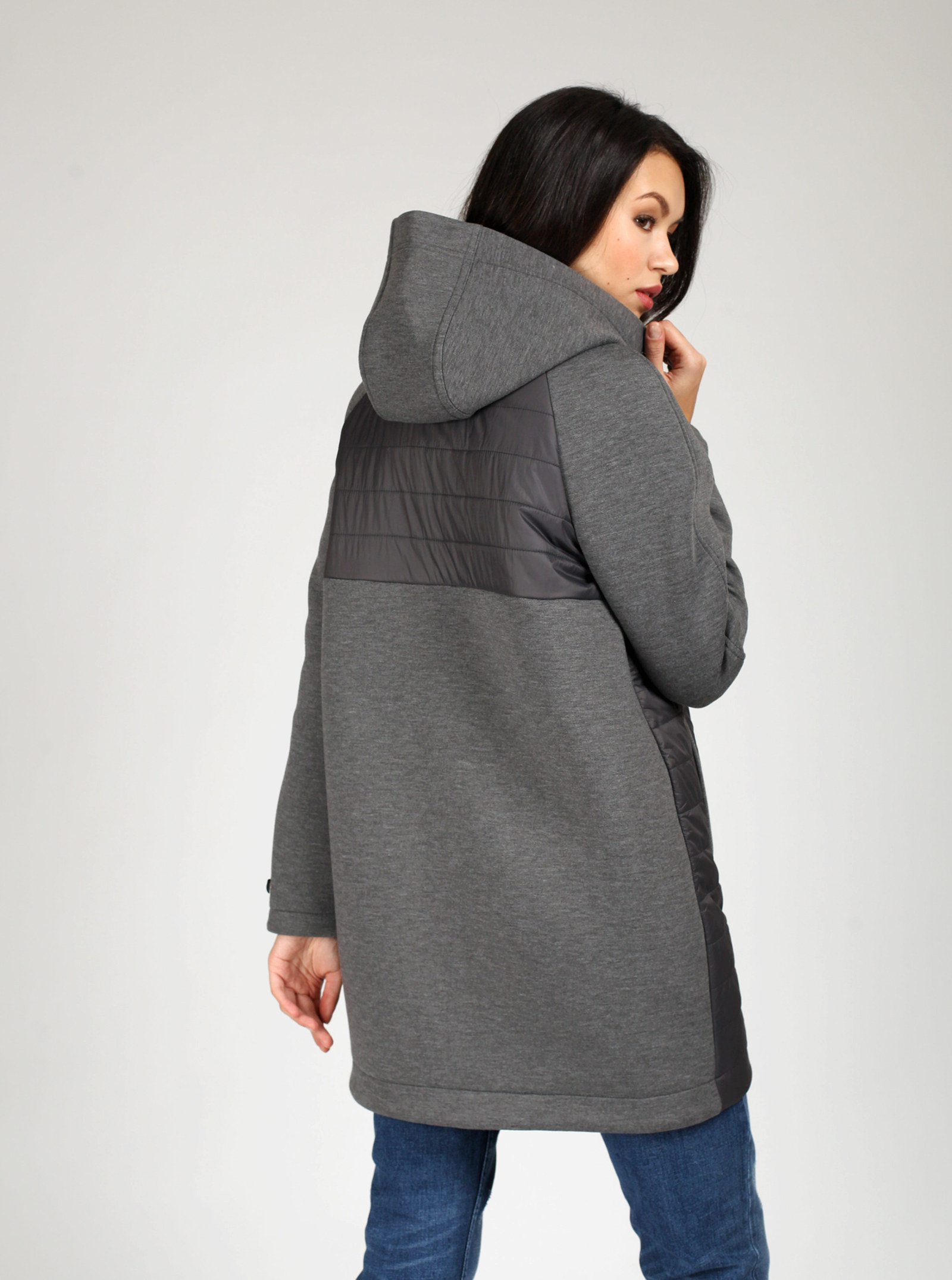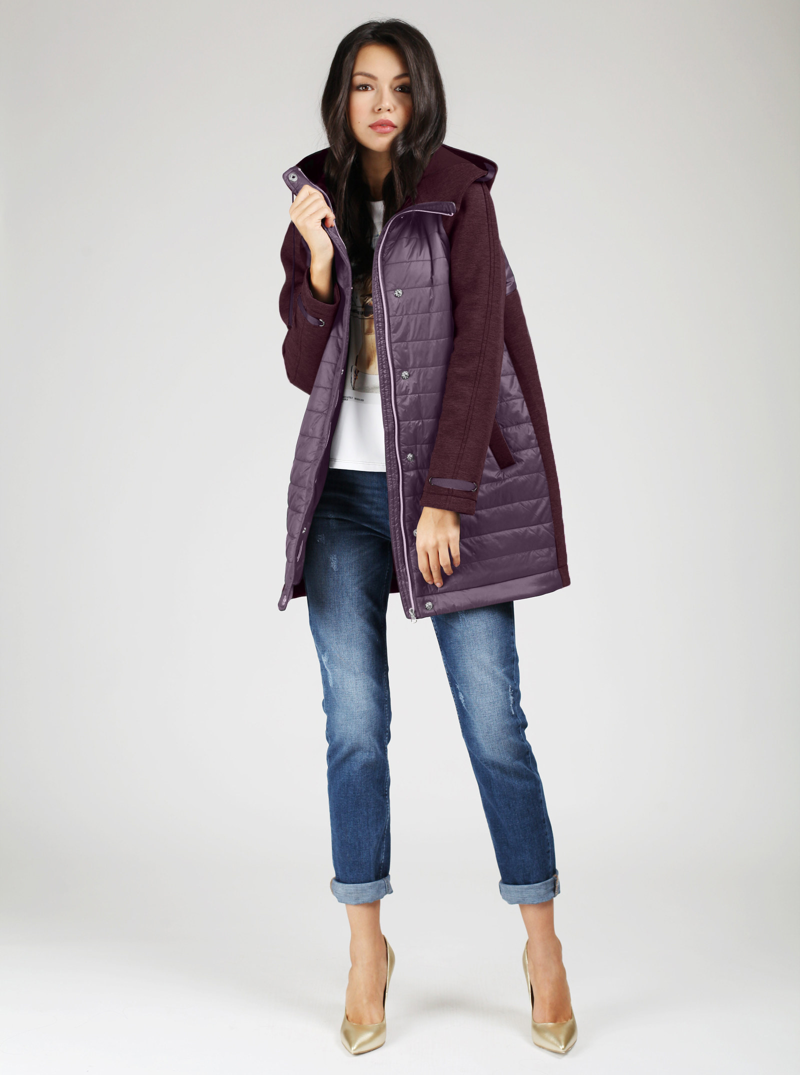 Это легкое пальто, построенное на комбинации несочетаемых фактур, очень удобное в носке. Сейчас такая эклектика в тренде. Формоустойчивое трикотажное полотно по своей сути очень мягкое и не стесняет движений. Простеганные на утеплителе передние детали и часть спины согревают. Изделие одновременно функционально и нарядно.