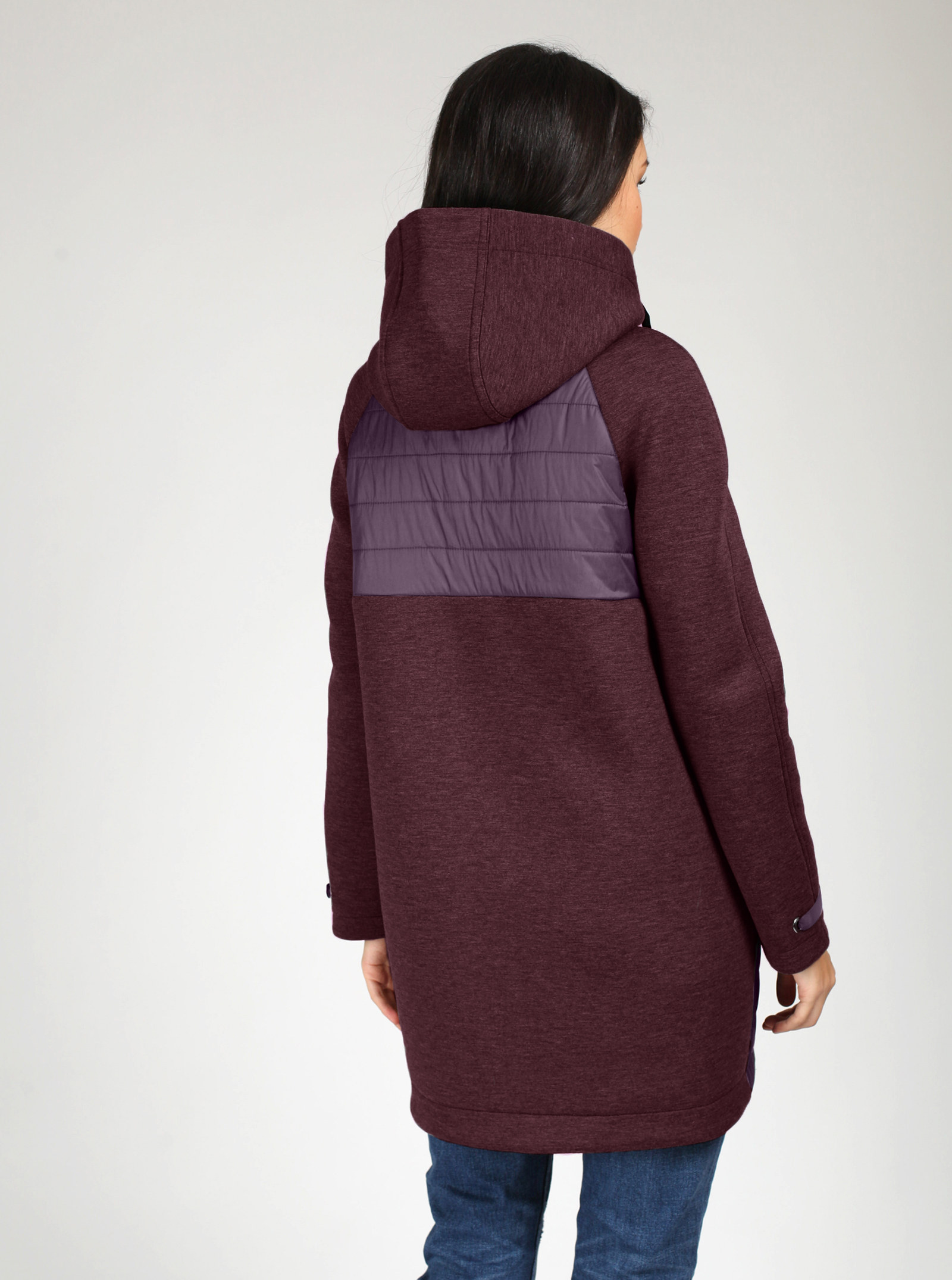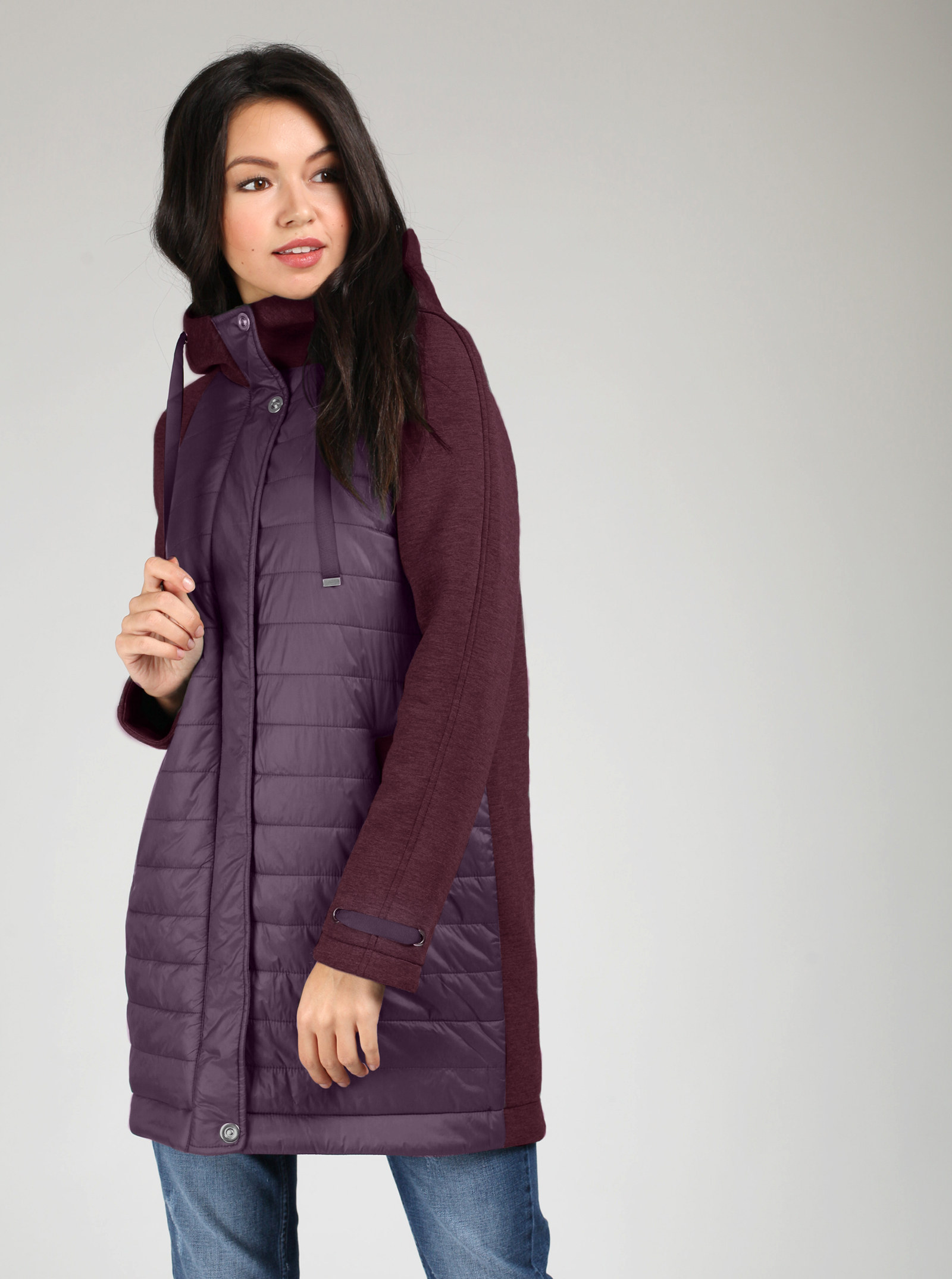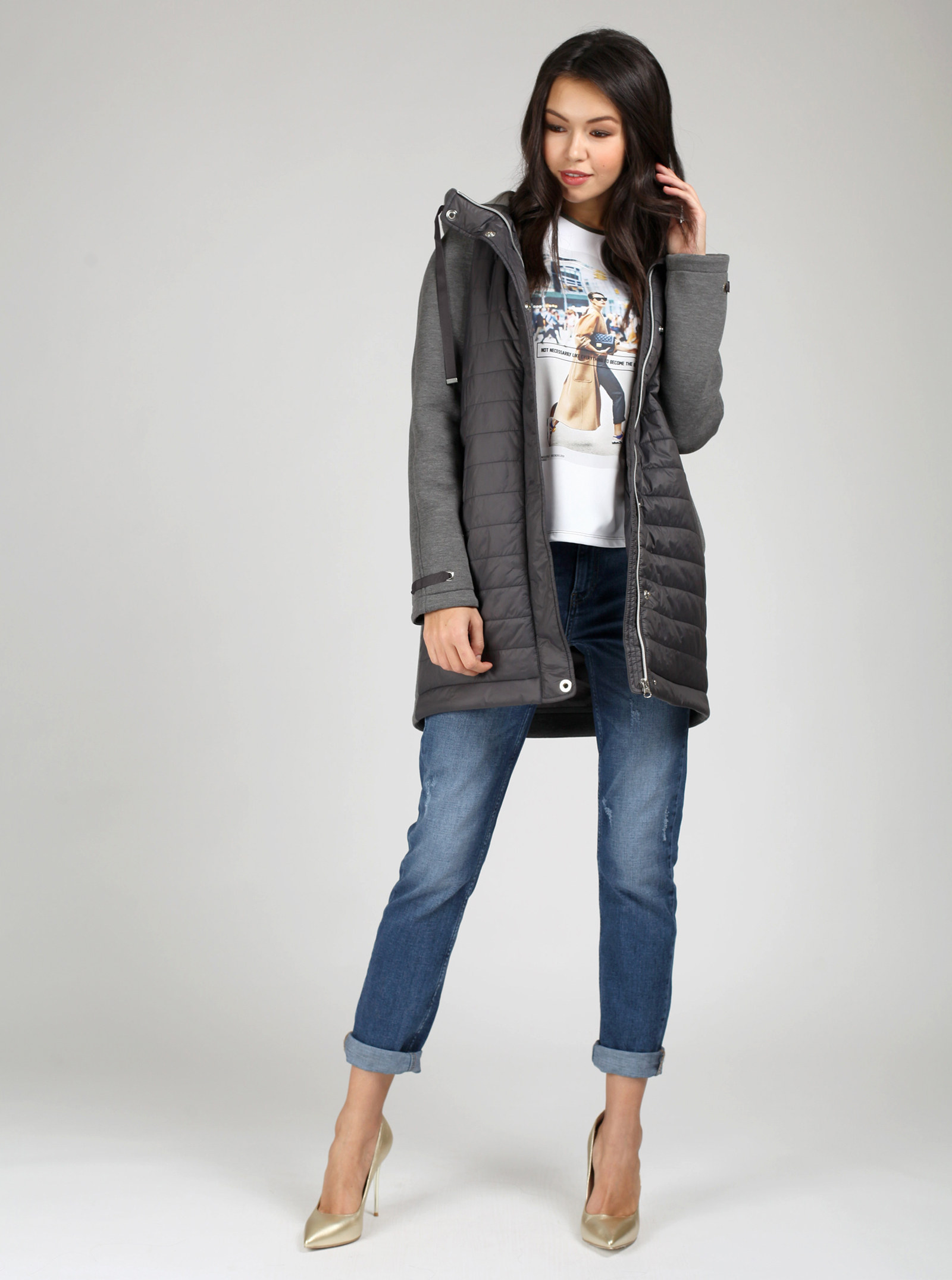 Это легкое пальто, построенное на комбинации несочетаемых фактур, очень удобное в носке. Сейчас такая эклектика в тренде. Формоустойчивое трикотажное полотно по своей сути очень мягкое и не стесняет движений. Простеганные на утеплителе передние детали и часть спины согревают. Изделие одновременно функционально и нарядно.
