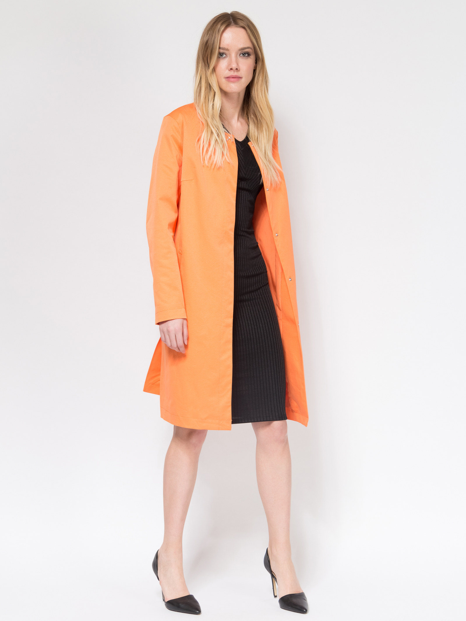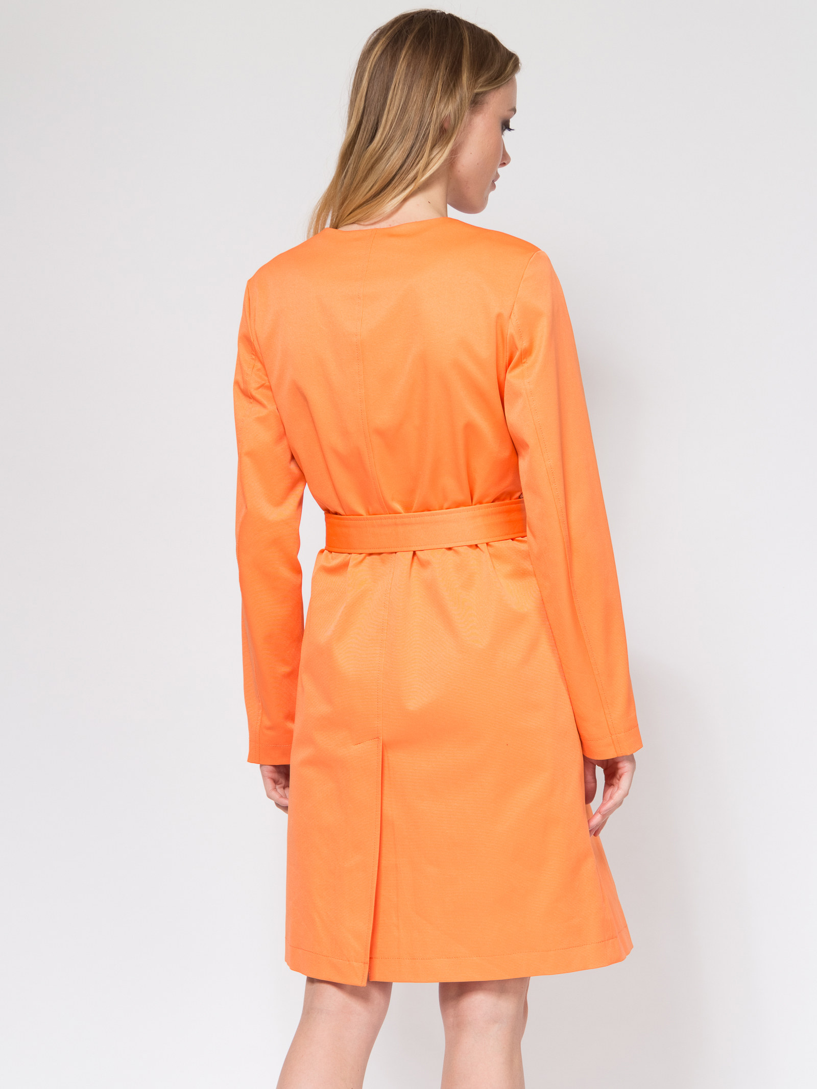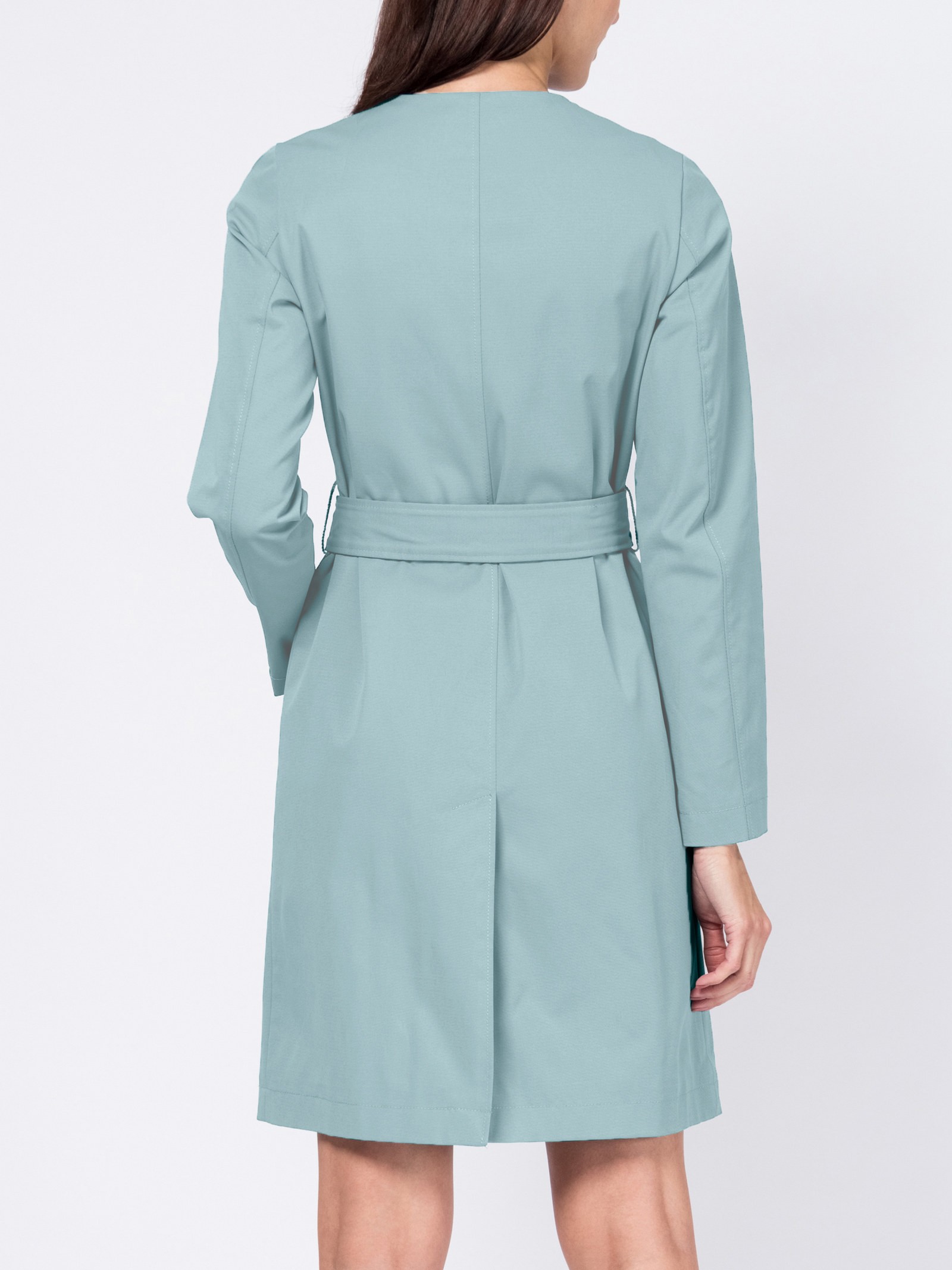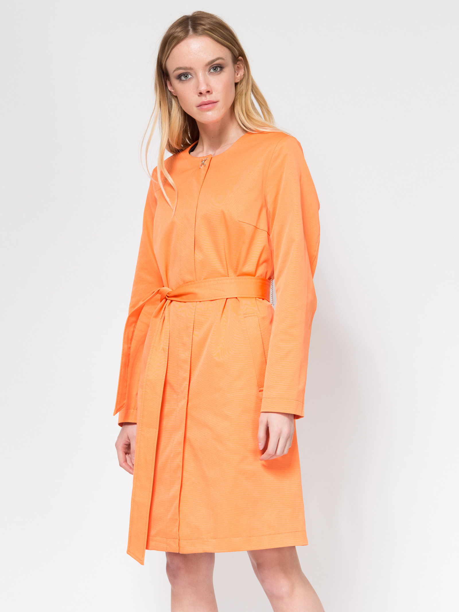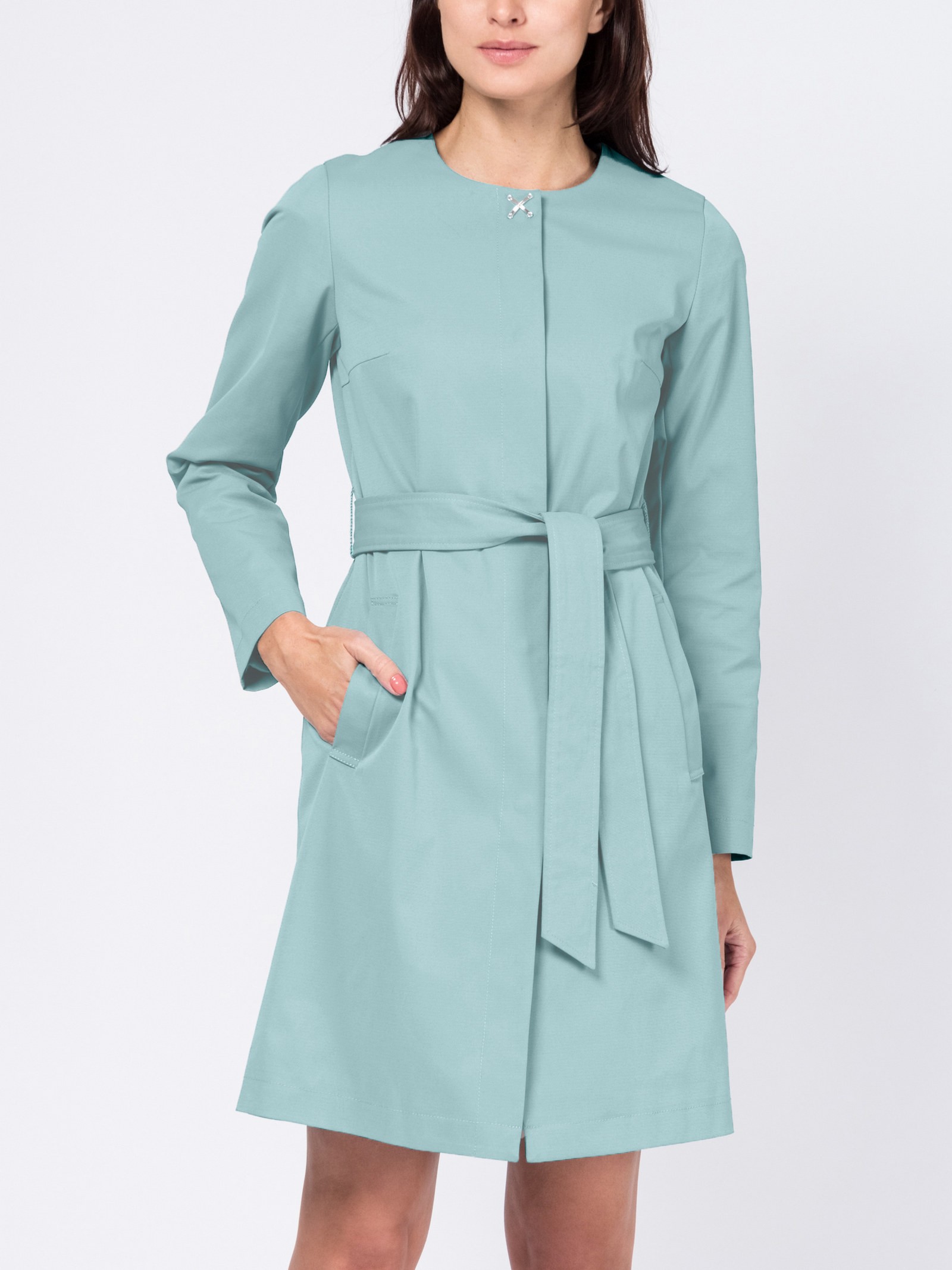 Удлиненный, приталенный плащ с поясом и изящной брошью. Сделан из плотной ткани с водонепроницаемой пропиткой. Центральная застежка на скрытых кнопках. По низу спинки небольшая шлица. Карманы с листочкой. Плащ представлен я ярких, актуальных цветах.