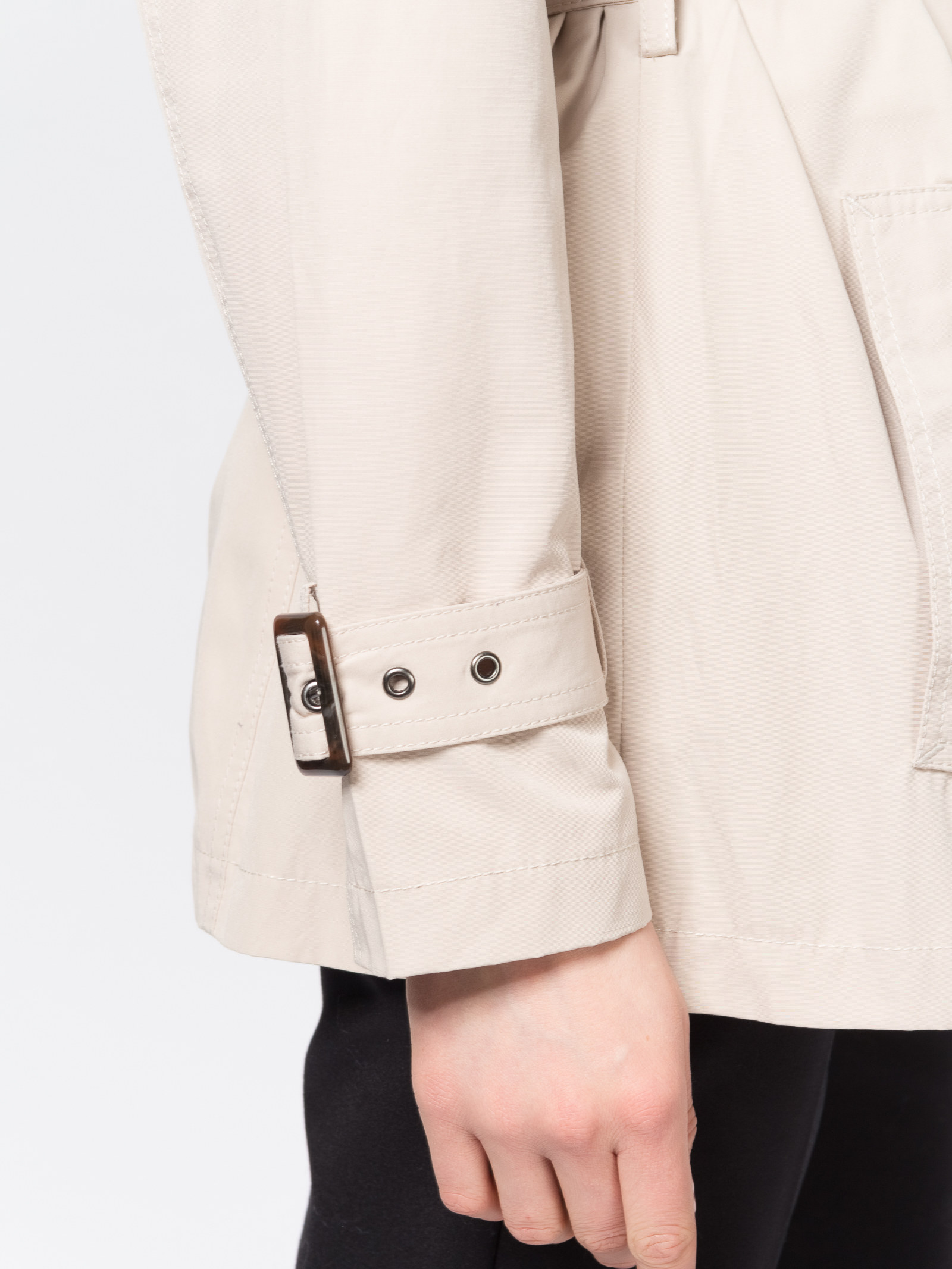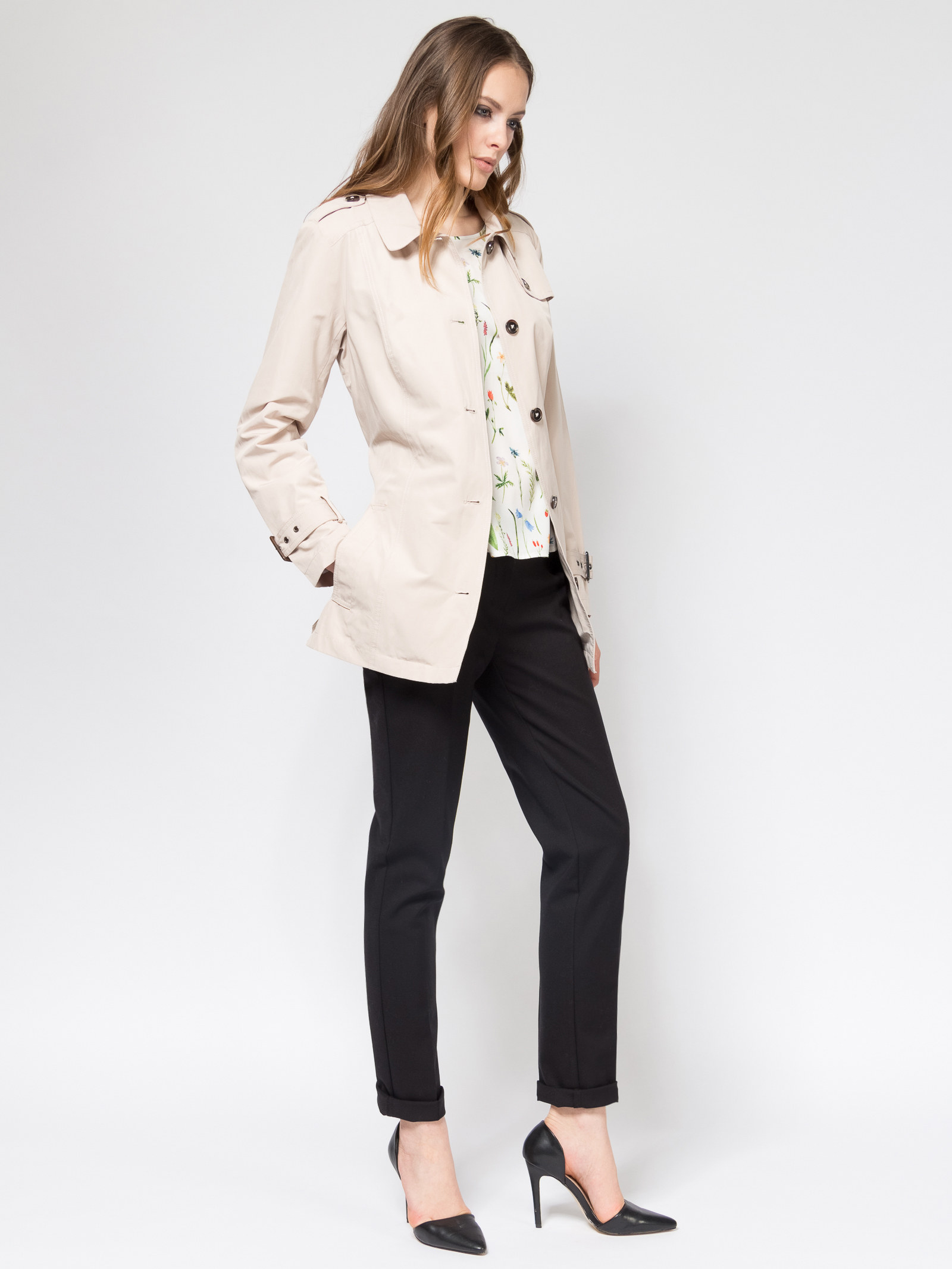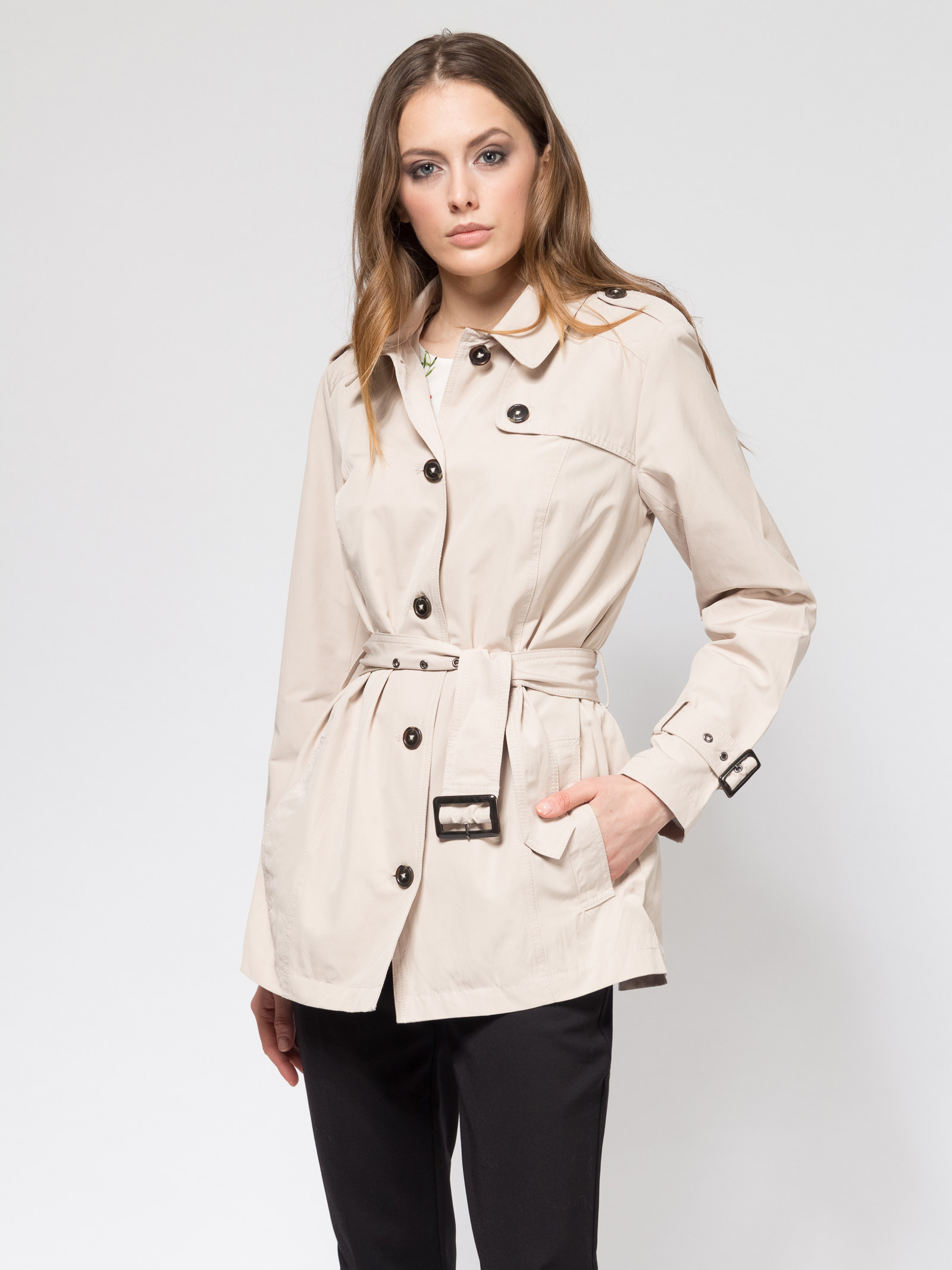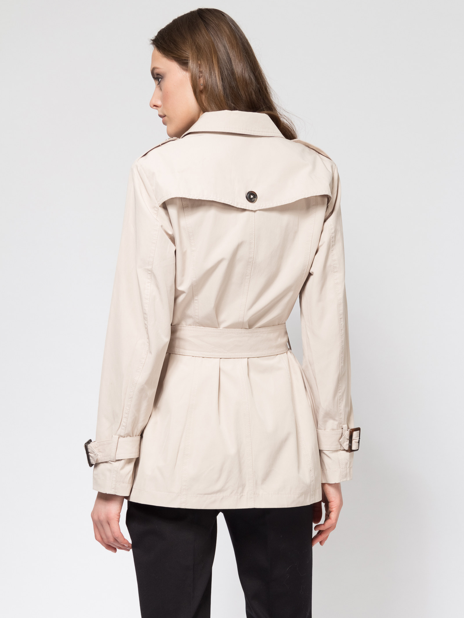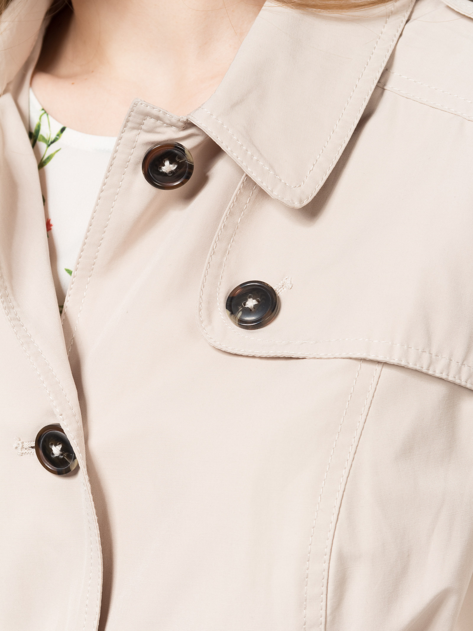 Укороченный, приталенный тренч с отложным воротником. Центральная застежка на пуговицах. Рукава регулируемые с хлястиками. На спинке и полочке есть кокетки на пуговицах. Карманы с листочками. Представлен в базовых тонах.