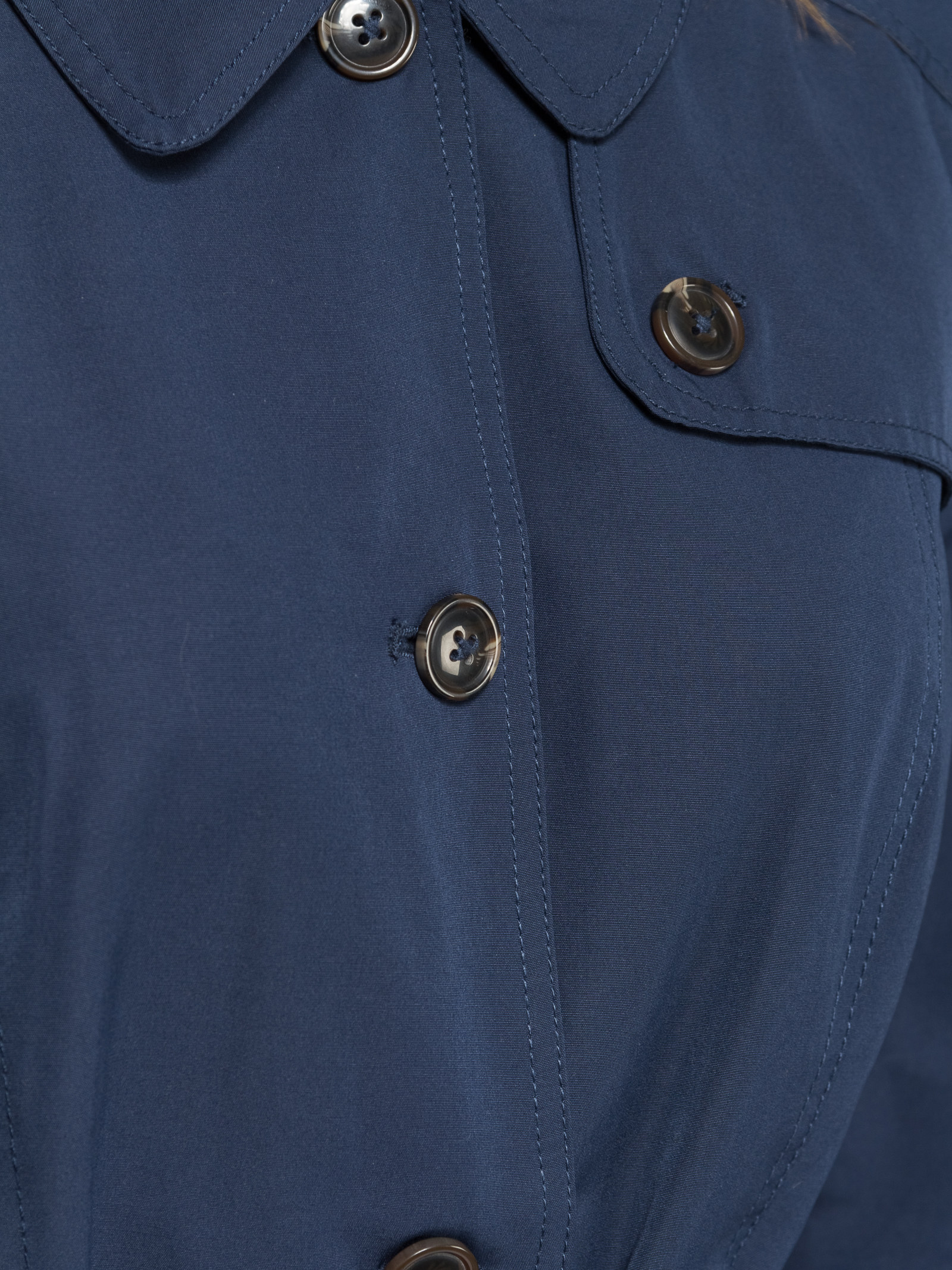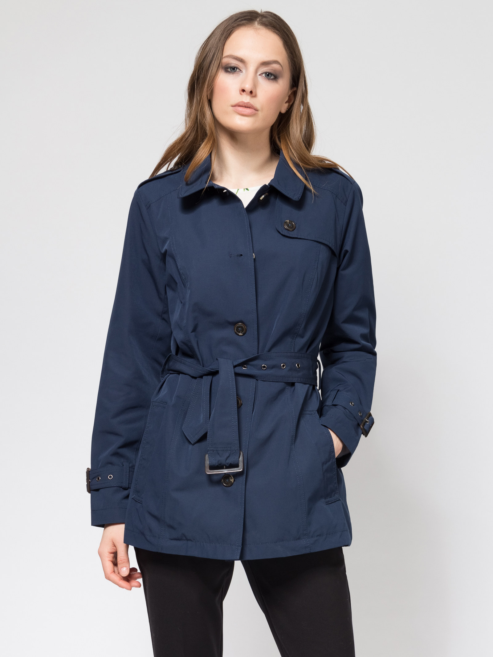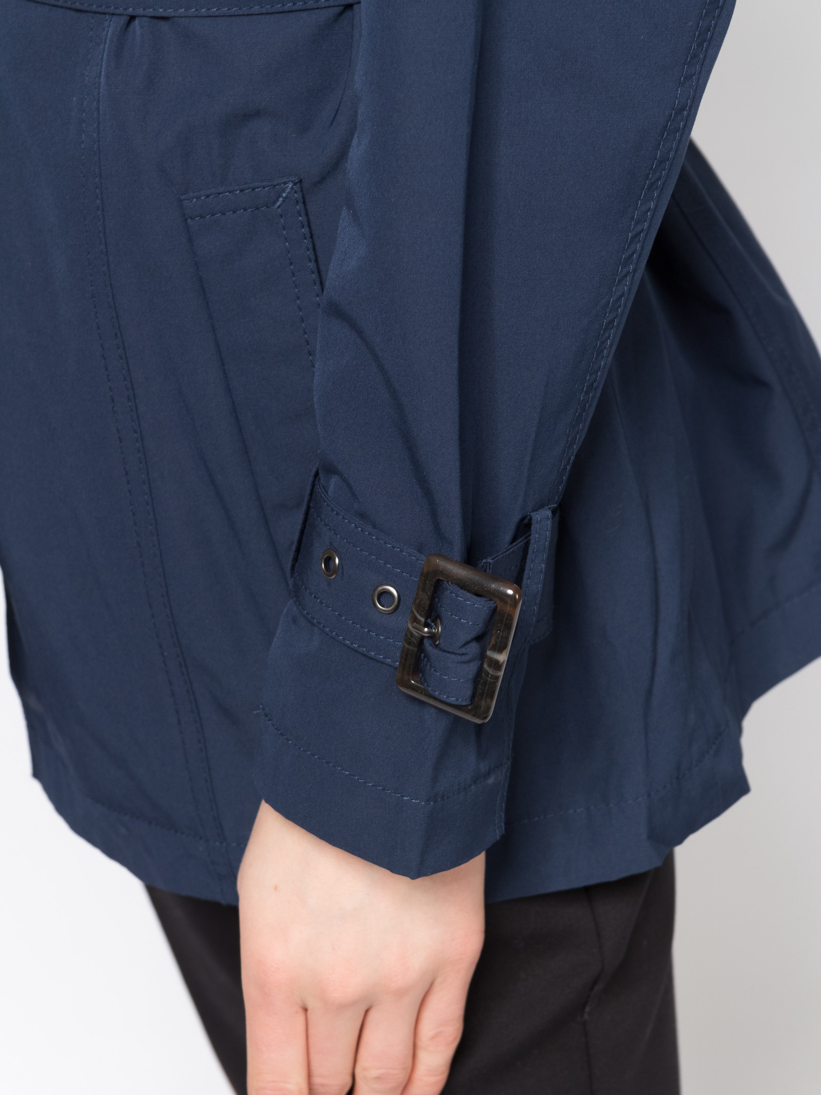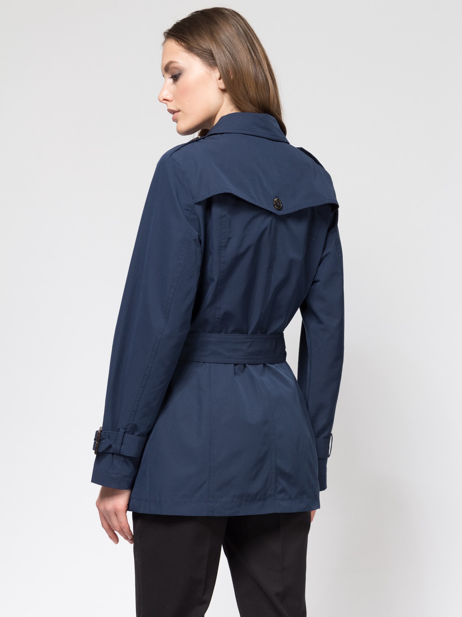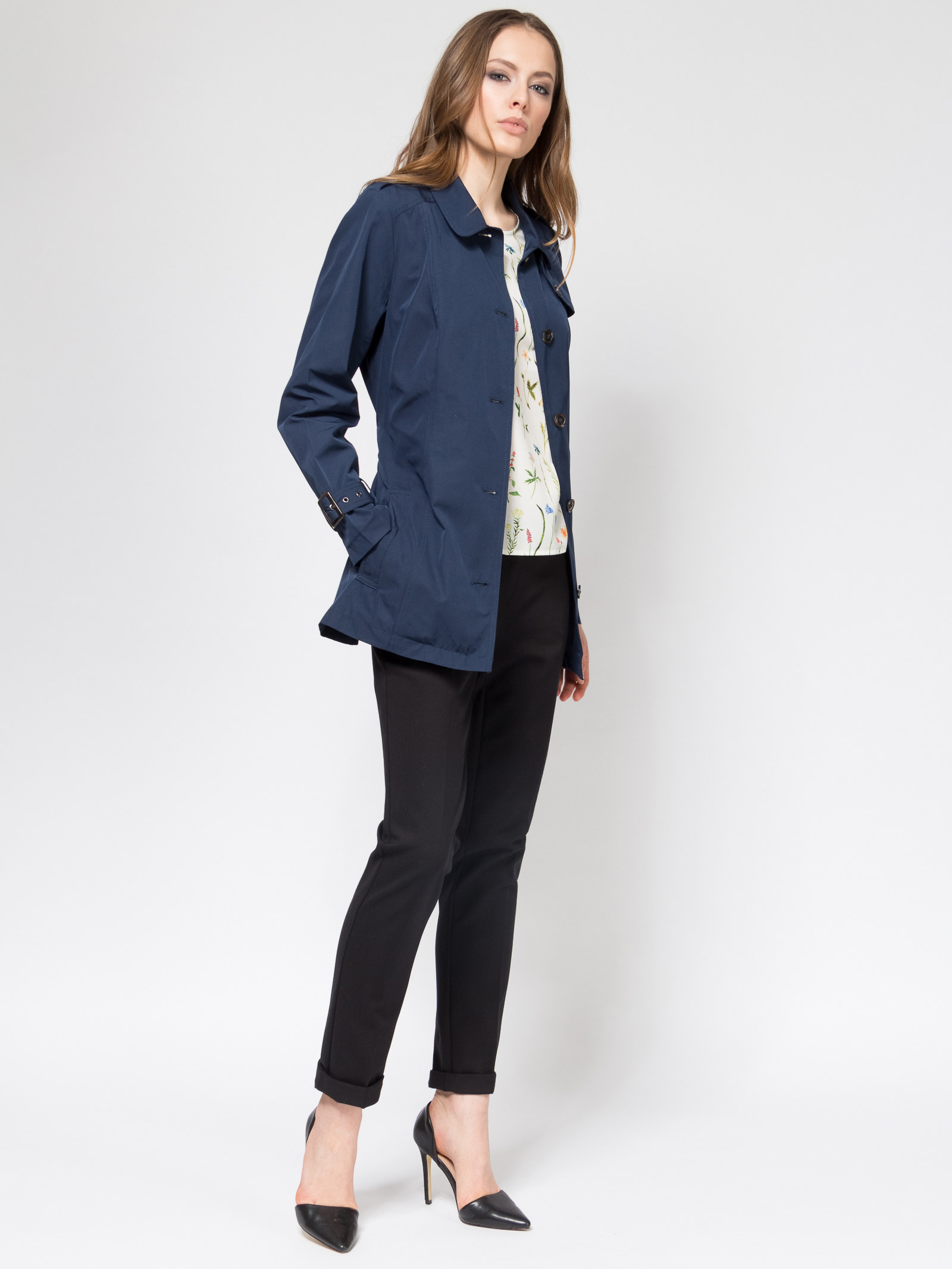Укороченный, приталенный тренч с отложным воротником. Центральная застежка на пуговицах. Рукава регулируемые с хлястиками. На спинке и полочке есть кокетки на пуговицах. Карманы с листочками. Представлен в базовых тонах.