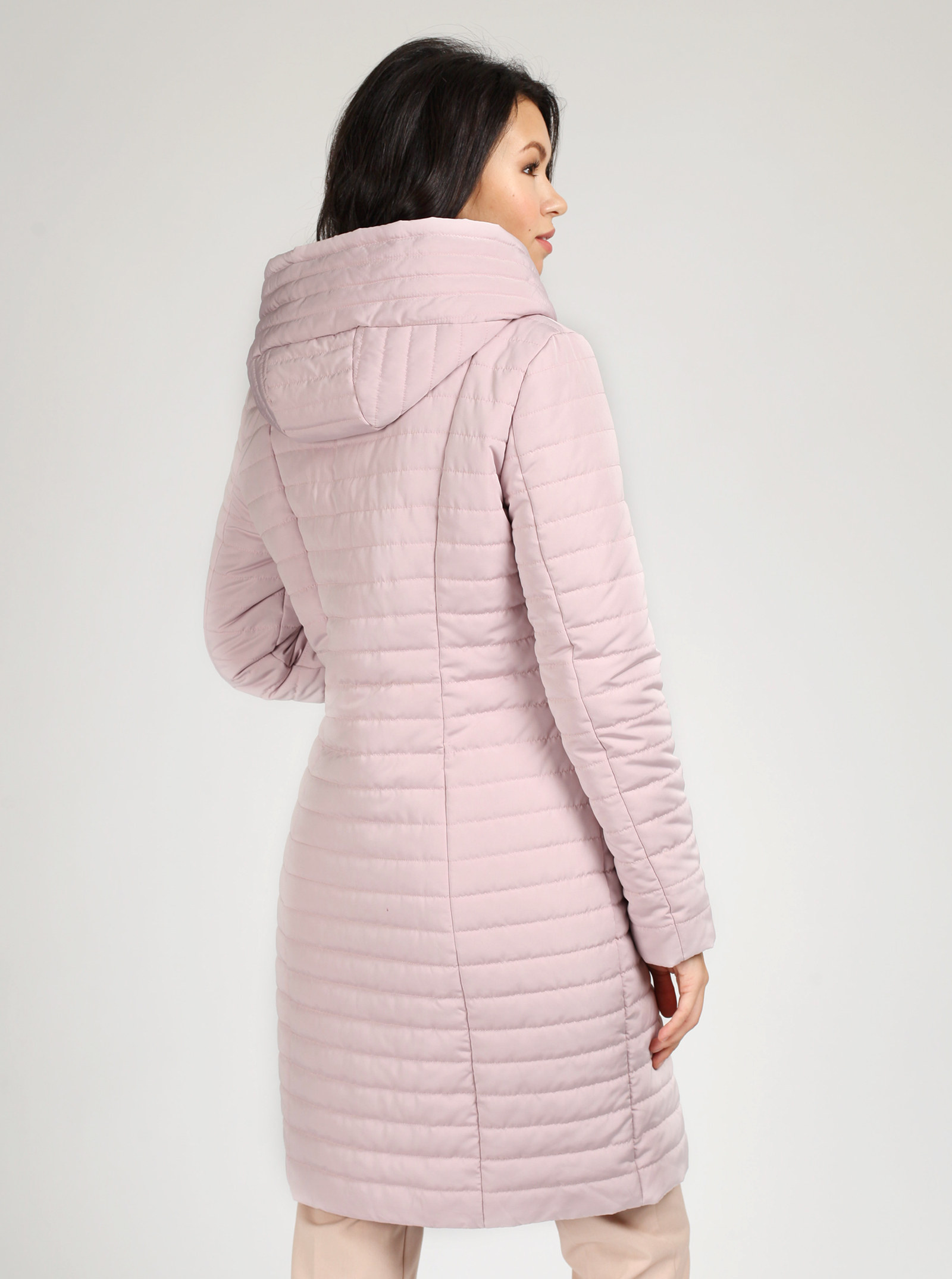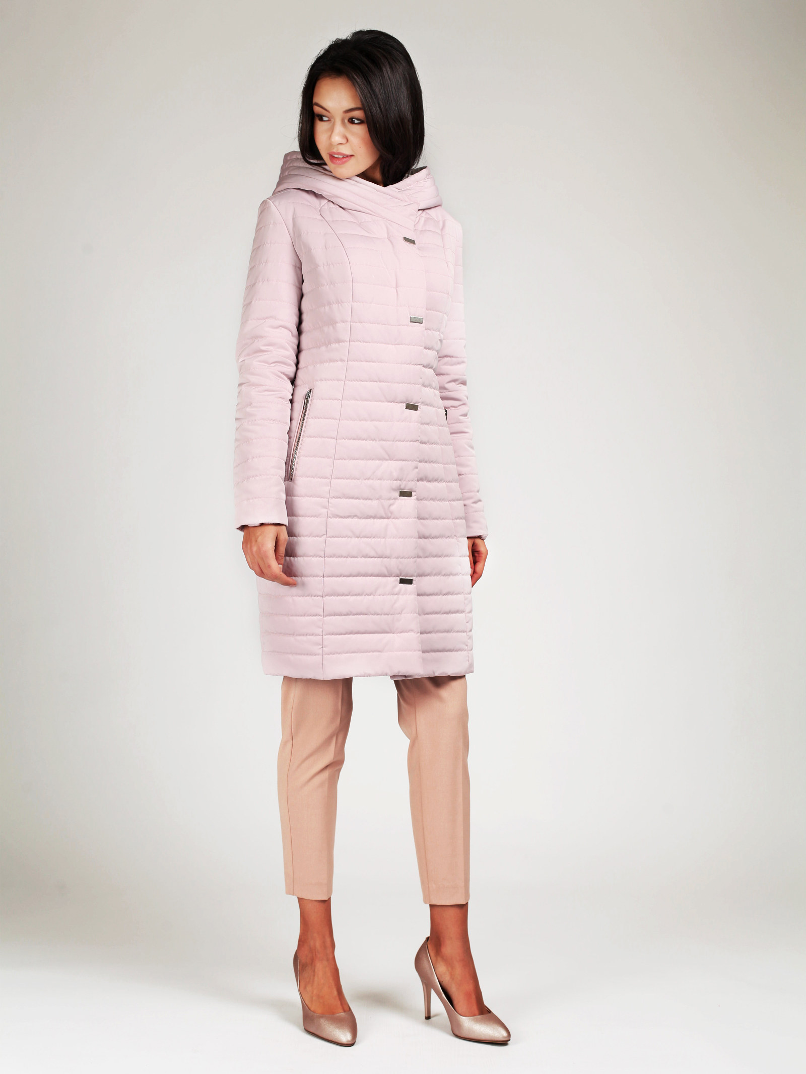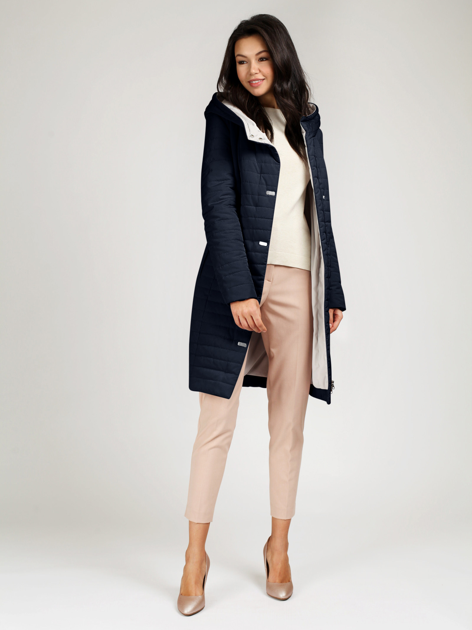 Пальто стеганное на утеплителе низкой плотности, легкое удлиненное. Силуэт полуприлегающий. Приталивание достигается при помощи фигурных рельефов, очень эффектных по своей конструкции. Объемный капюшон не съемный, внутри имеет отделку из другого цвета ткани, как, в прочем, вся внутренняя часть пальто. Застежка осуществляется при помощи кнопок прямоугольной формы, цвет всей фурнитуры блестящее серебро.