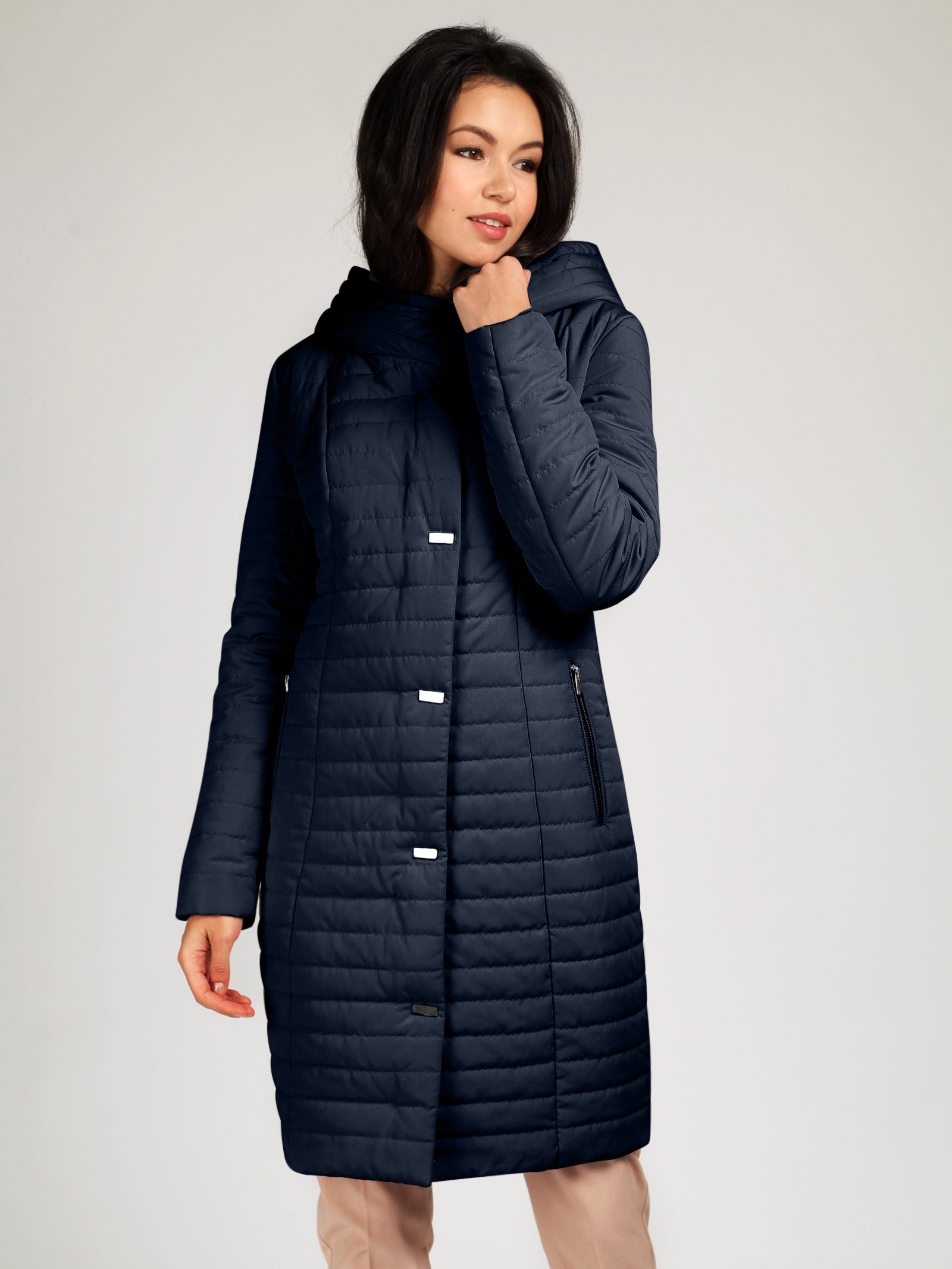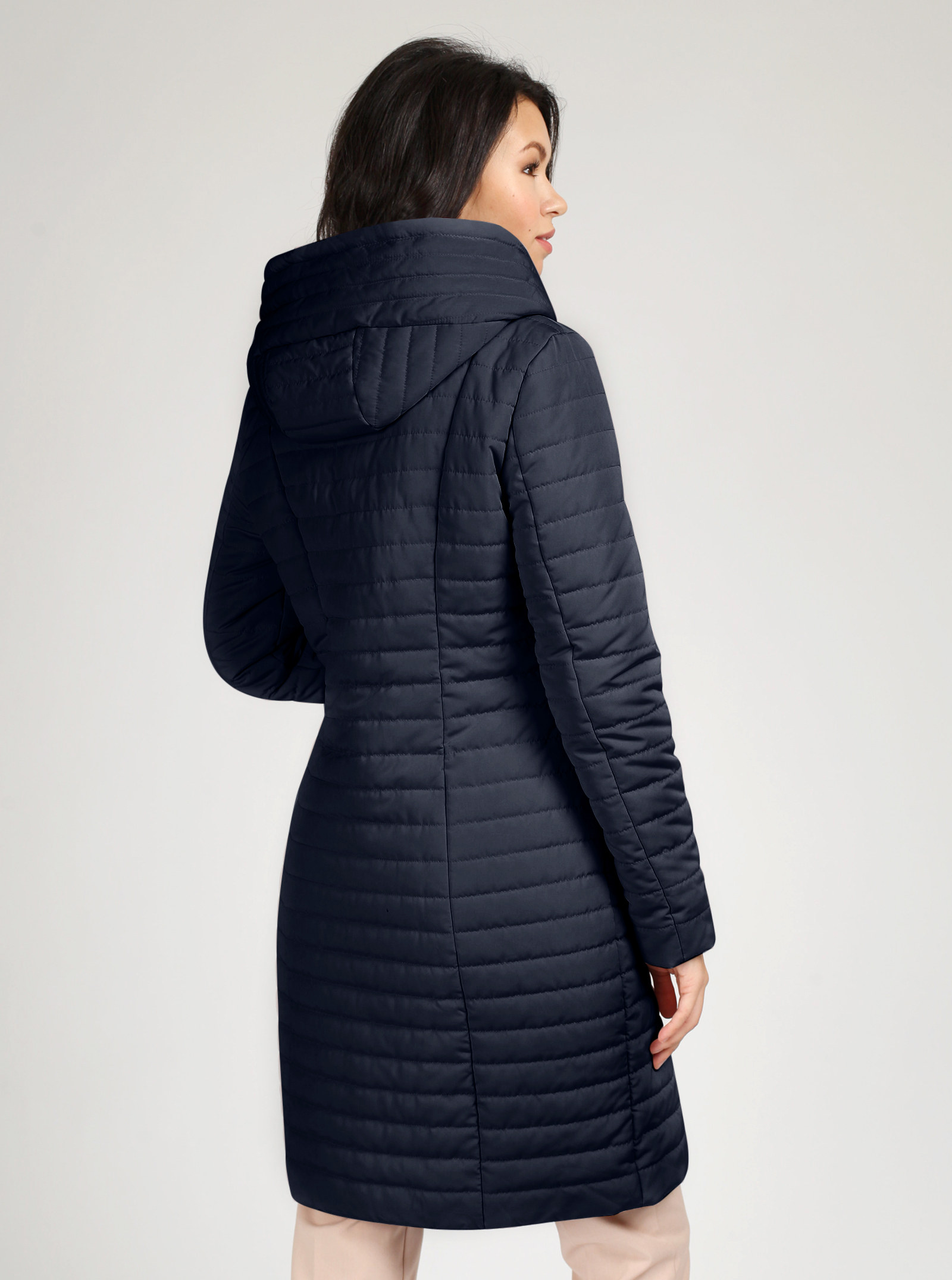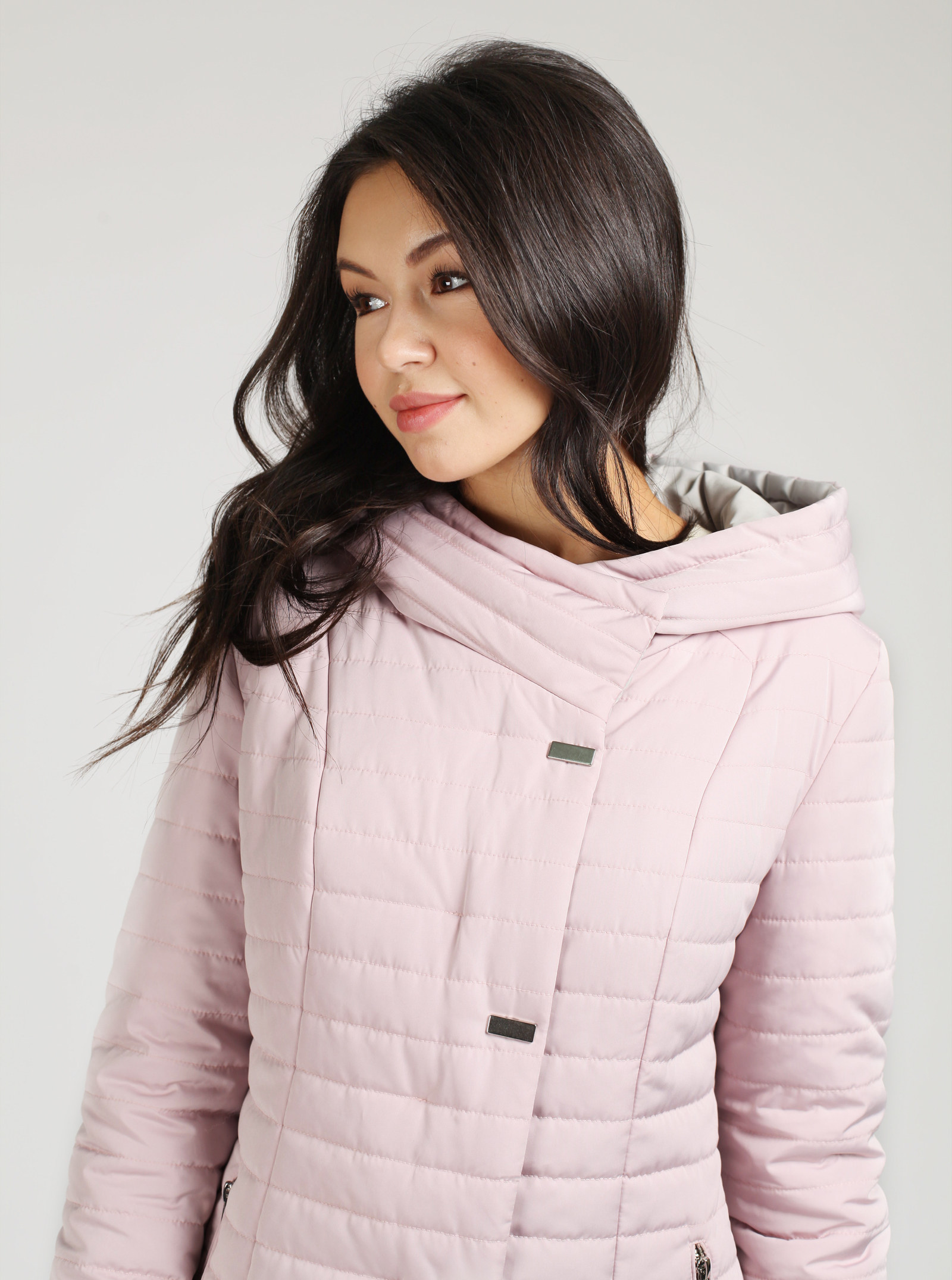 Пальто стеганное на утеплителе низкой плотности, легкое удлиненное. Силуэт полуприлегающий. Приталивание достигается при помощи фигурных рельефов, очень эффектных по своей конструкции. Объемный капюшон не съемный, внутри имеет отделку из другого цвета ткани, как, в прочем, вся внутренняя часть пальто. Застежка осуществляется при помощи кнопок прямоугольной формы, цвет всей фурнитуры блестящее серебро.