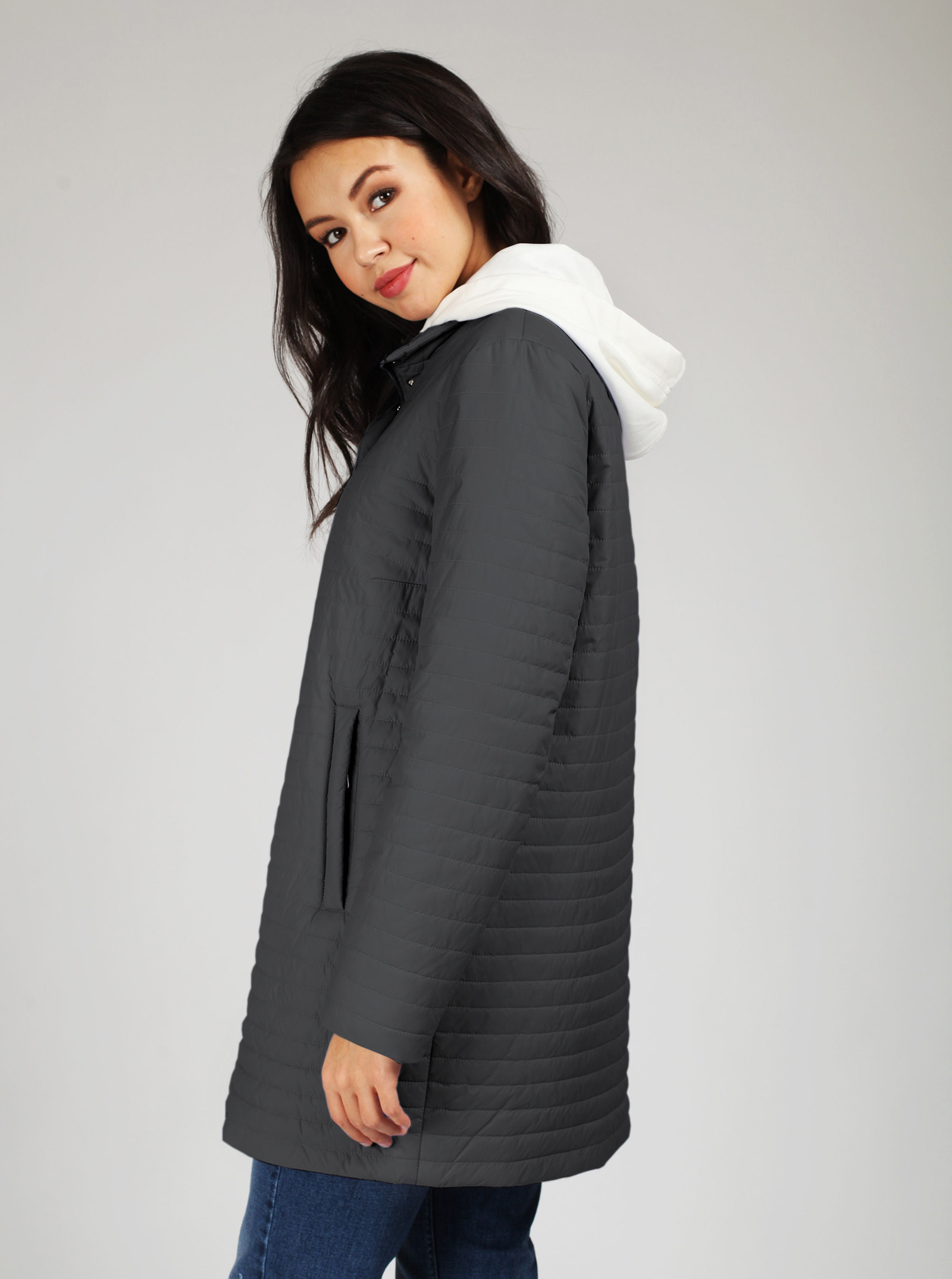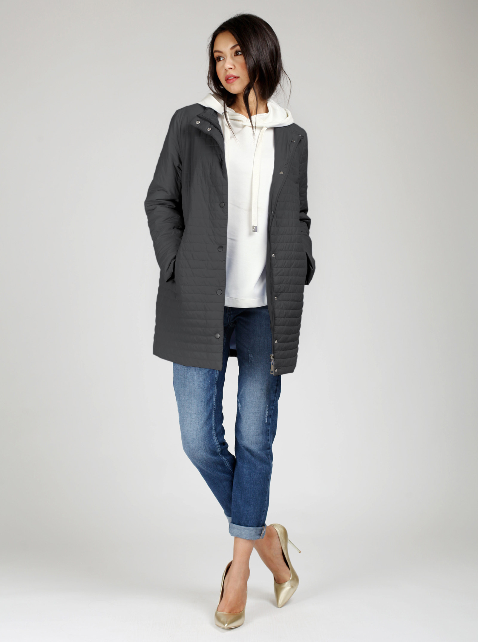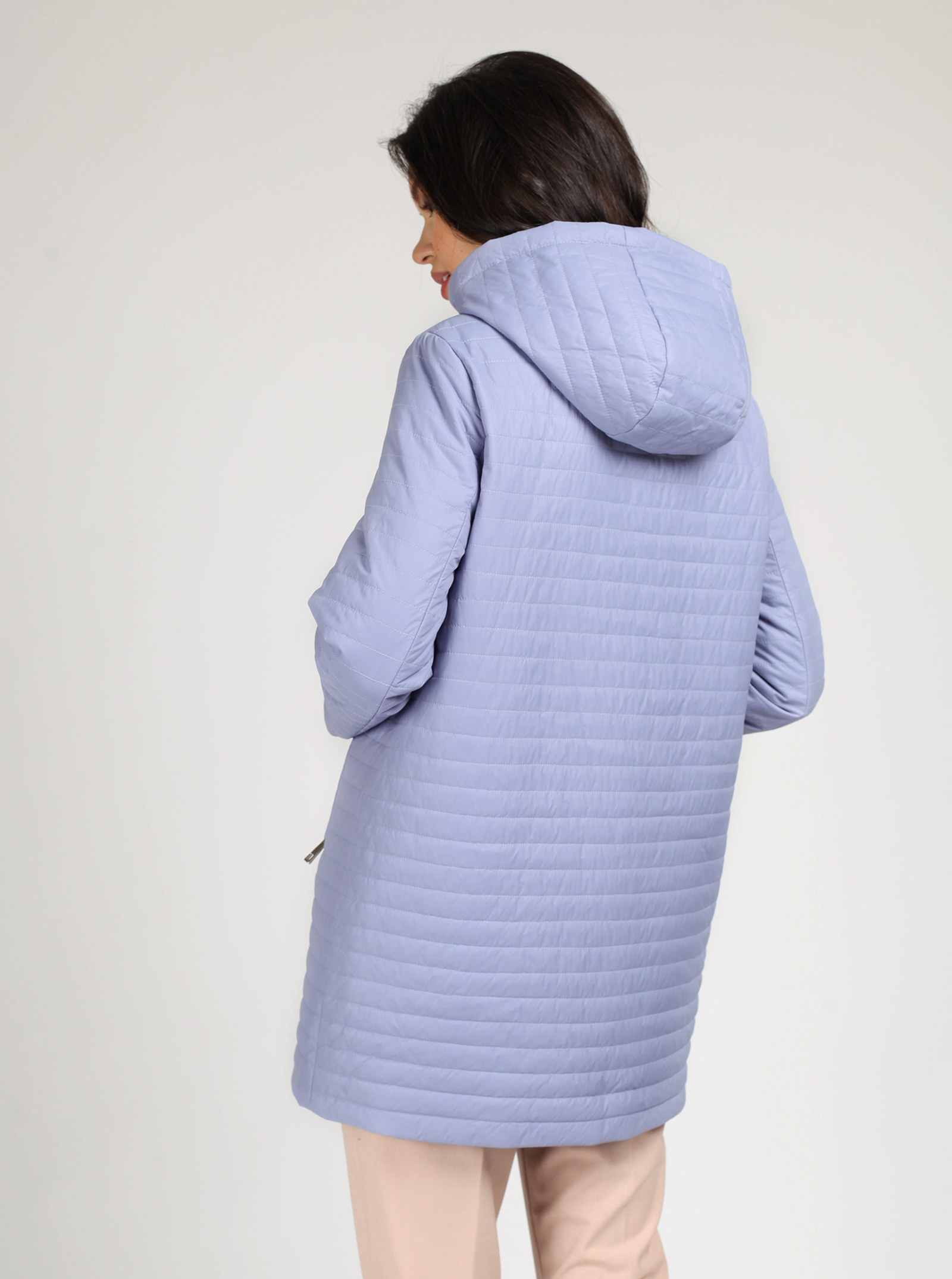 Куртка прямого кроя свободного силуэта - для прохладной погоды. Модель изготовлена из прочной и приятной на ощупь ткани с гипоаллергенным наполнителем из синтепона и декорирована необычной горизонтальной стежкой. Куртка застегивается на потайную молнию и кнопки в тон изделия. Модель дополнена боковыми врезными карманами на молнии и съемным капюшоном. Куртка прекрасно сочетается с джинсами, платьями или юбками.