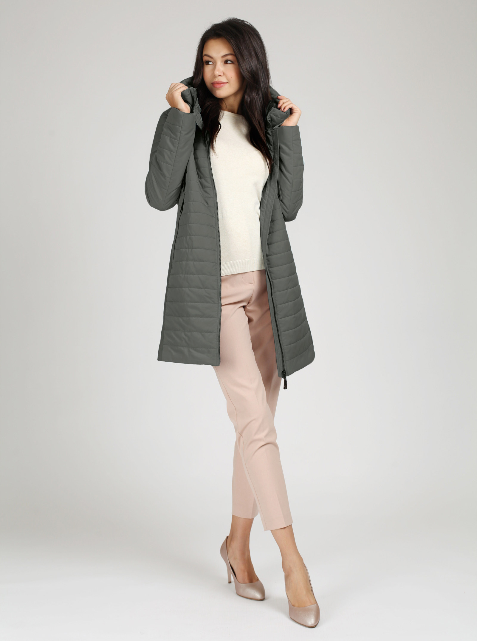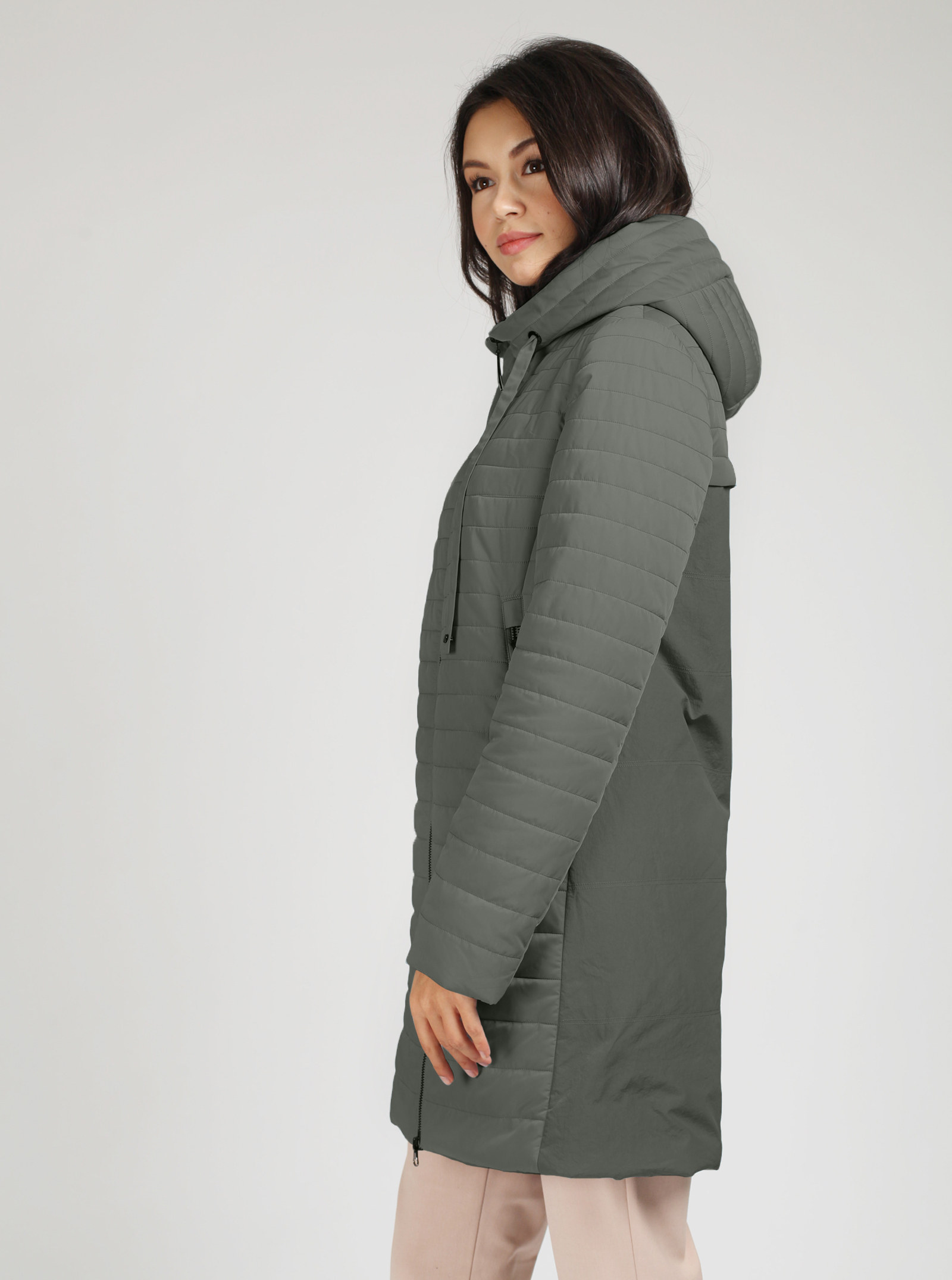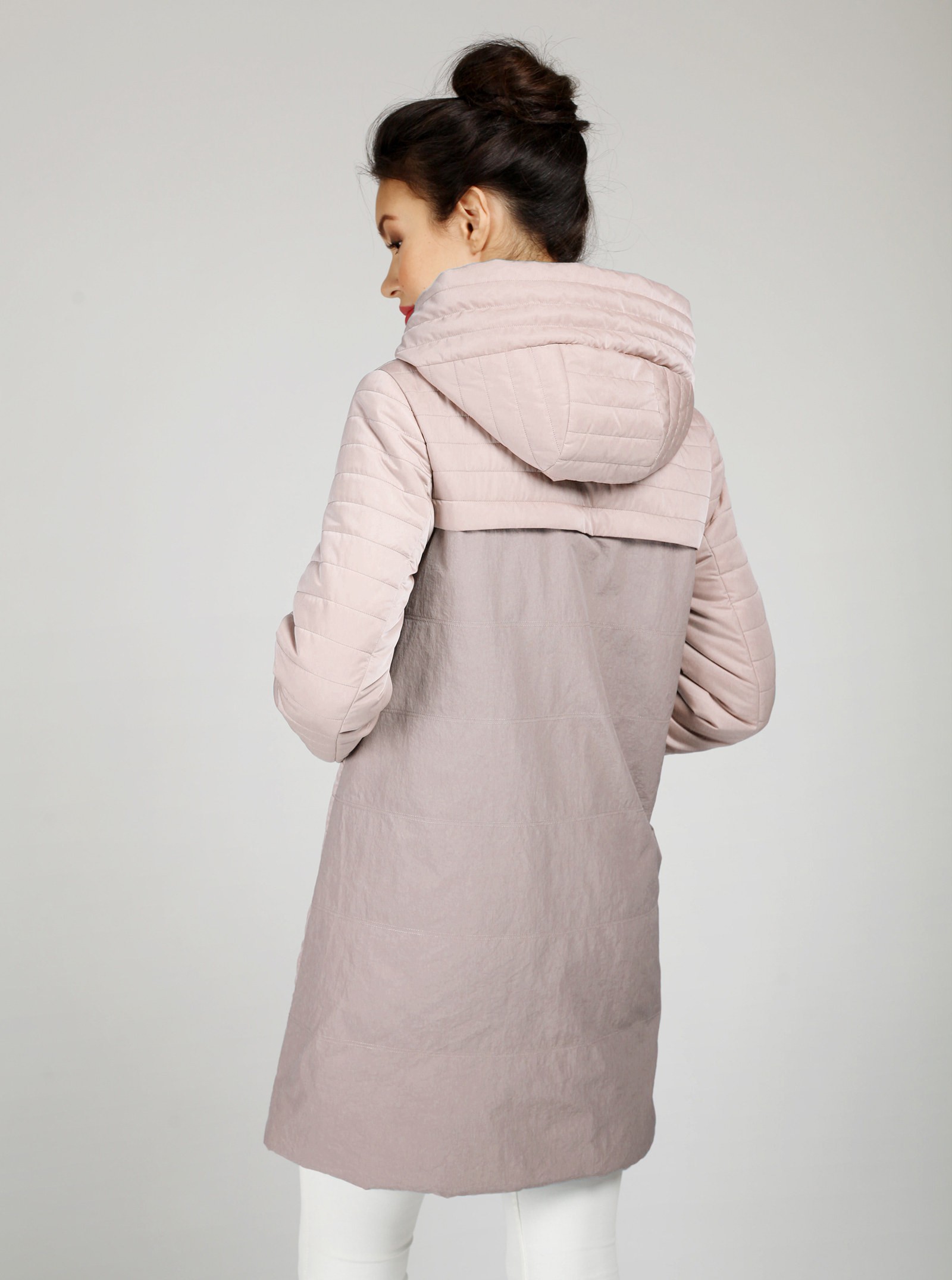 Пальто утепленное прямое до середины бедра, построенное на комбинации двух тканей разных качеств. Боковой шов перенесен на перед. Спинка смотрится очень эффектно: сверху - стеганая кокетка, имитирующая отлетную, внизу используется другая ткань - плотная и фактурная. Капюшон несъемный, по его переднему краю предусмотрена кулиска с лентами, ими можно регулировать степень прилегания. Боковые карманы имеют длинный вход и застегиваются на металлические молнии контрастного цвета с крупными эффектными пуллерами.