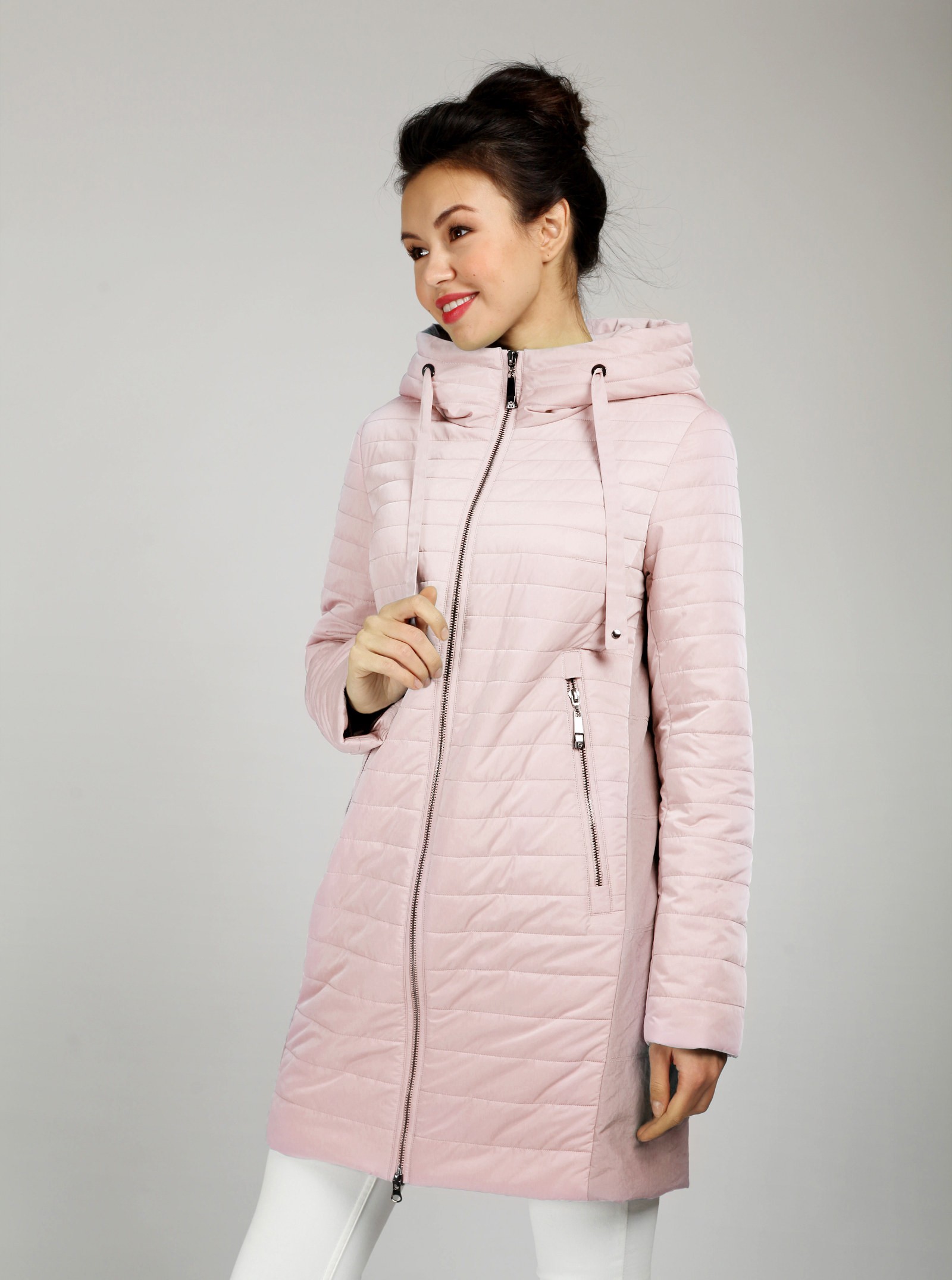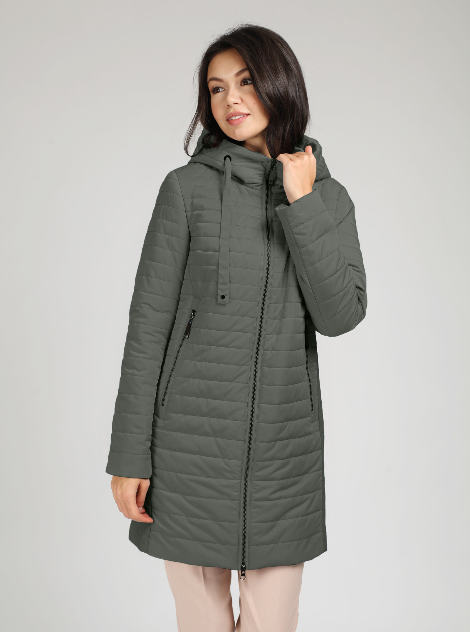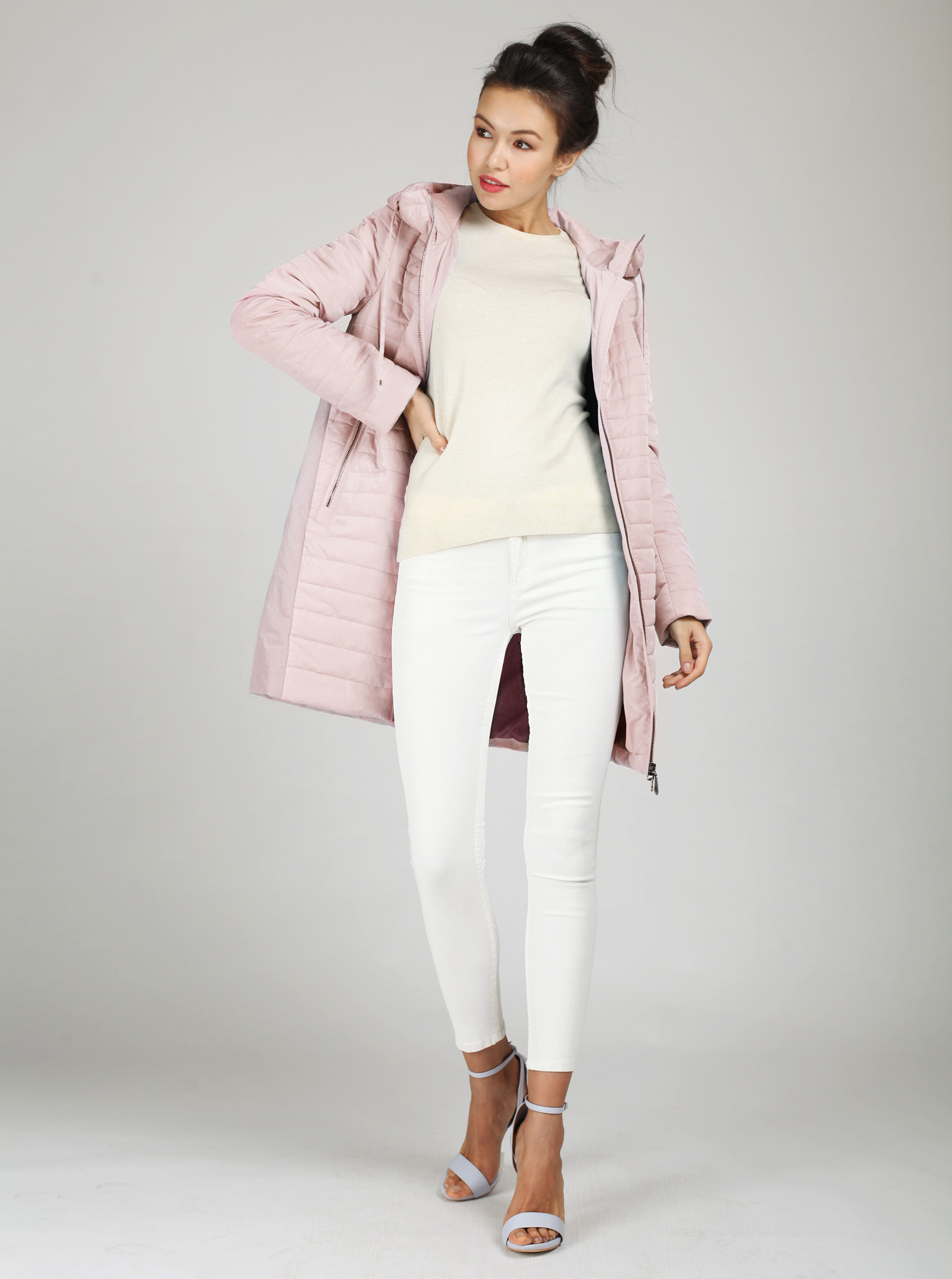 Пальто утепленное прямое до середины бедра, построенное на комбинации двух тканей разных качеств. Боковой шов перенесен на перед. Спинка смотрится очень эффектно: сверху - стеганая кокетка, имитирующая отлетную, внизу используется другая ткань - плотная и фактурная. Капюшон несъемный, по его переднему краю предусмотрена кулиска с лентами, ими можно регулировать степень прилегания. Боковые карманы имеют длинный вход и застегиваются на металлические молнии контрастного цвета с крупными эффектными пуллерами.
