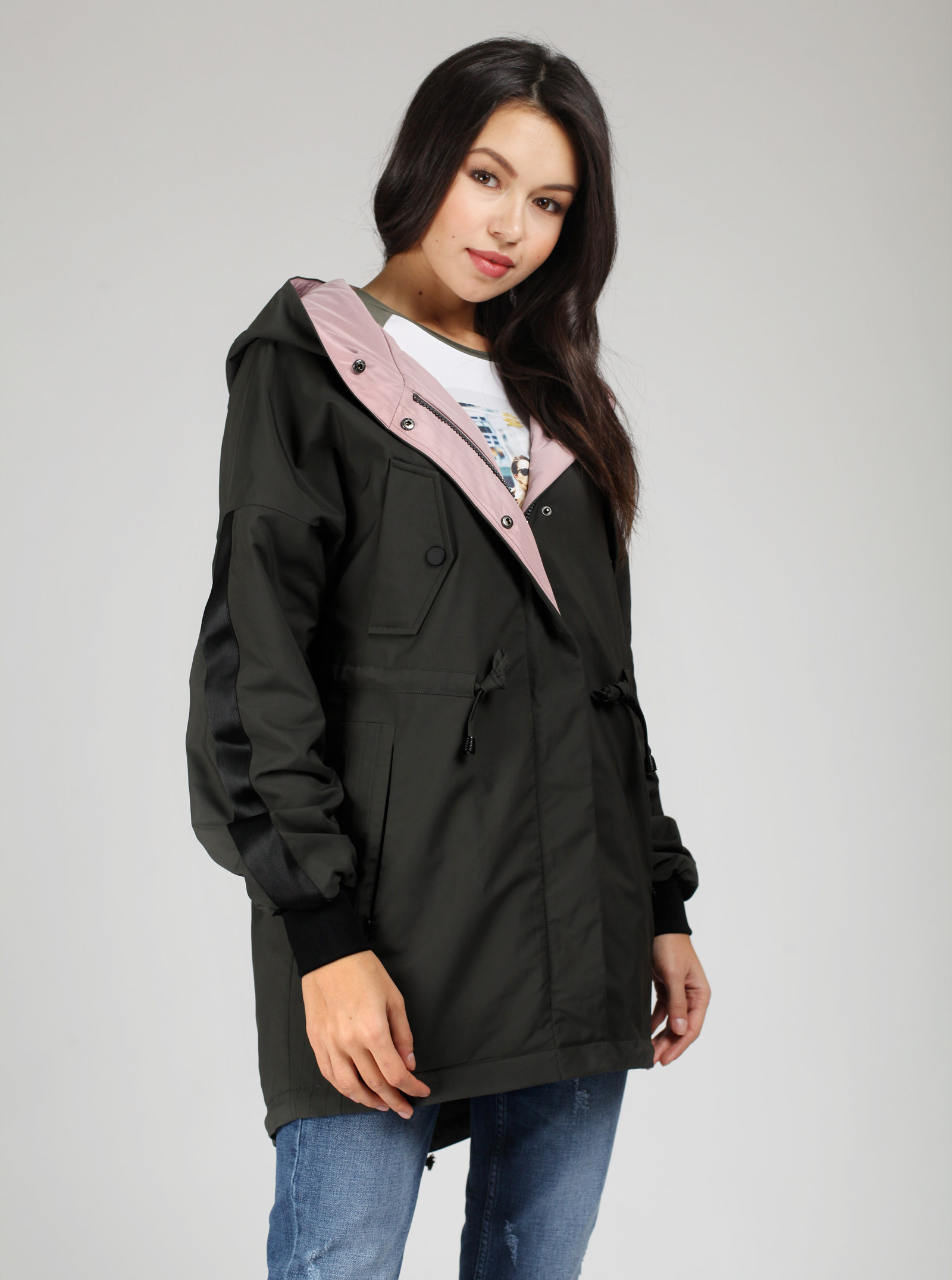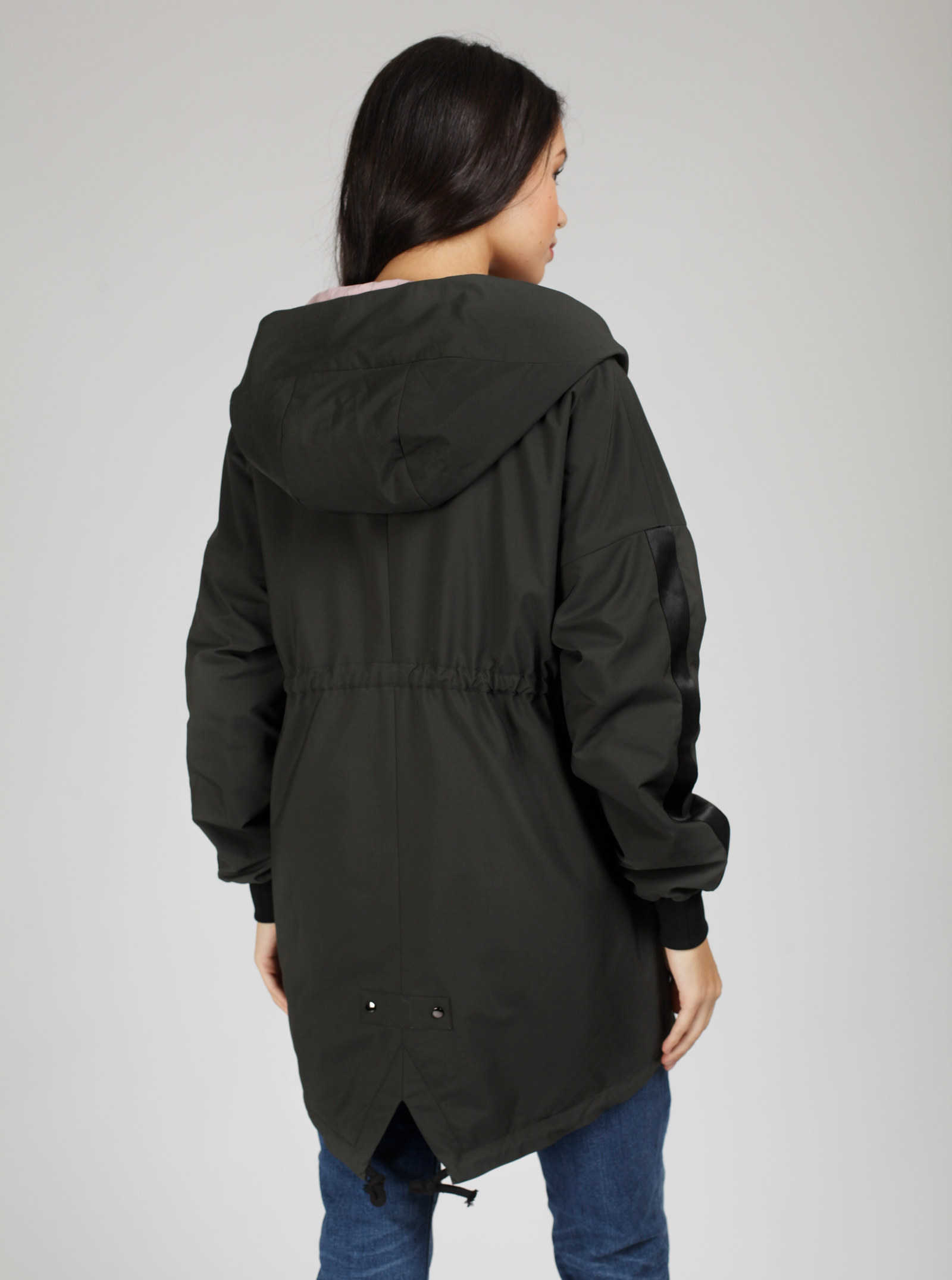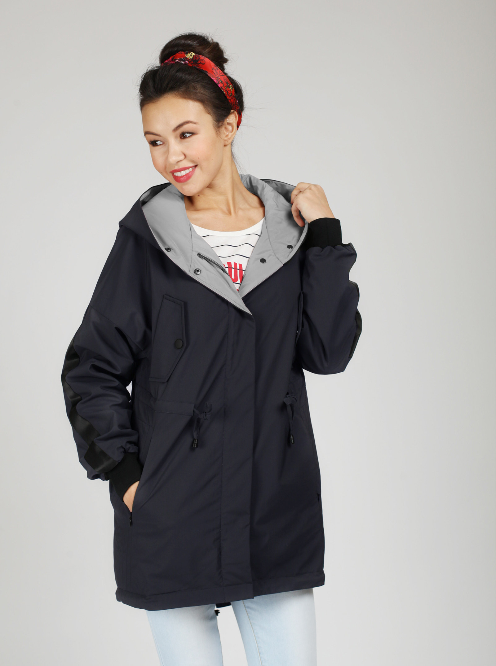 Удлиненная куртка-парка на тонком простеганном утеплителе, очень креативная, с нестандартной комбинацией цветов снаружи и внутри. Капюшон не съемный, объемный, с застежкой на кнопку в области горловины. По линии талии и по низу предусмотрены кулиски со шнурами, ими можно регулировать степень прилегания изделия. Вдоль рукава настрочена широкая черная лента, заканчивается он трикотажным манжетом такого же цвета. На изделии огромное количество карманов, четыре из них снаружи, один внутри. Все они имеют застежку.