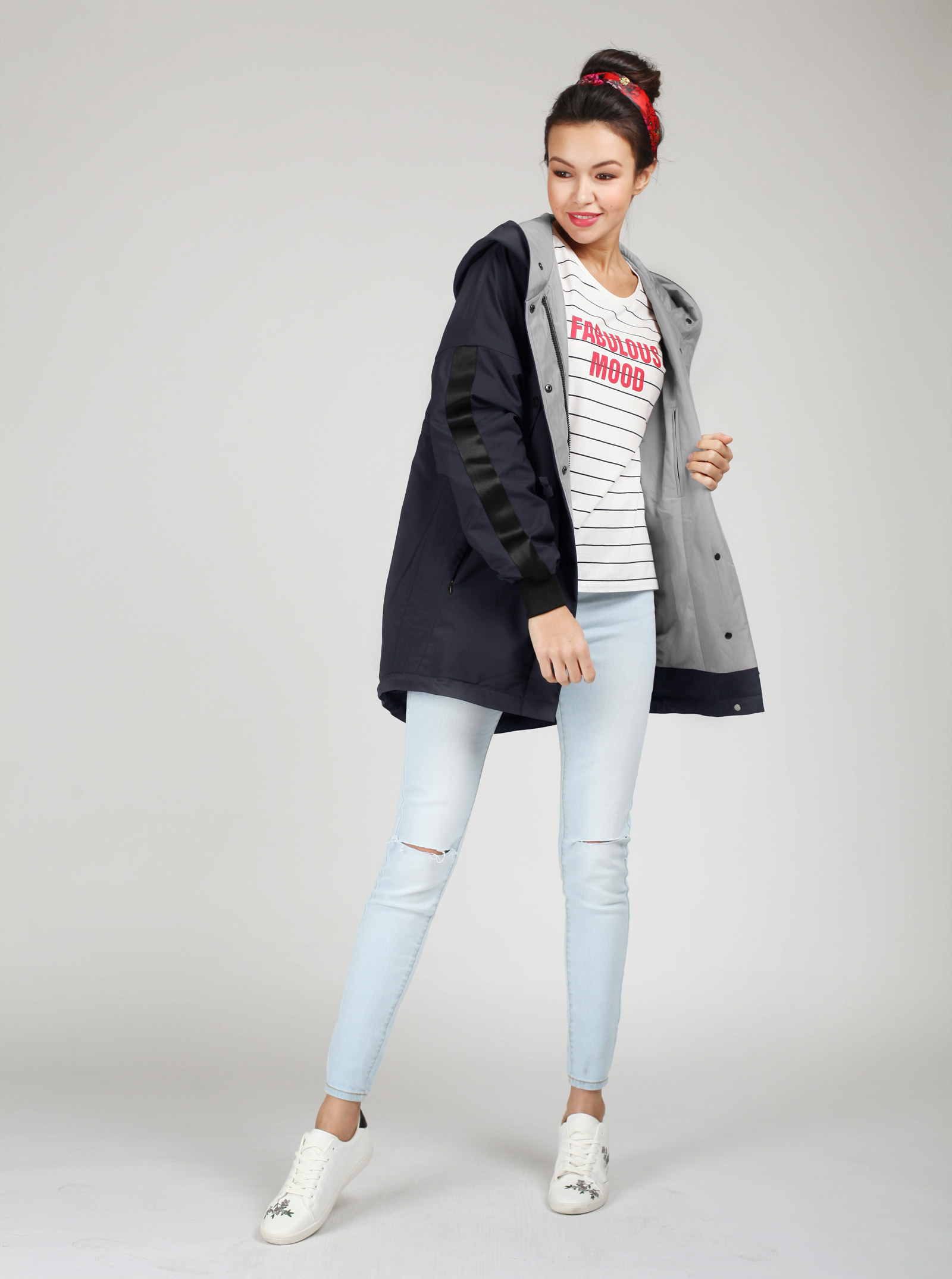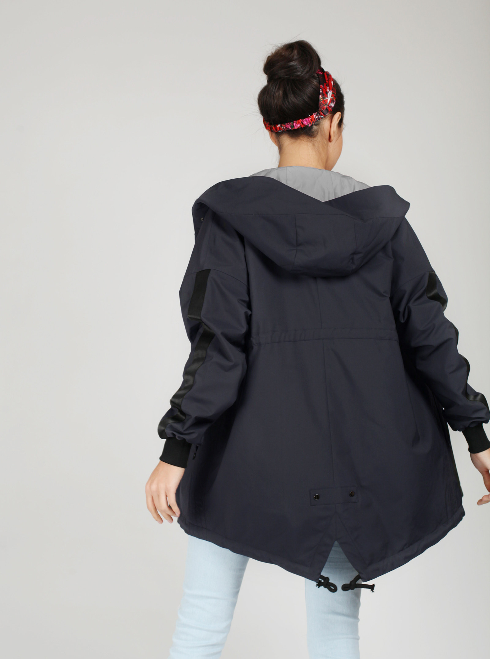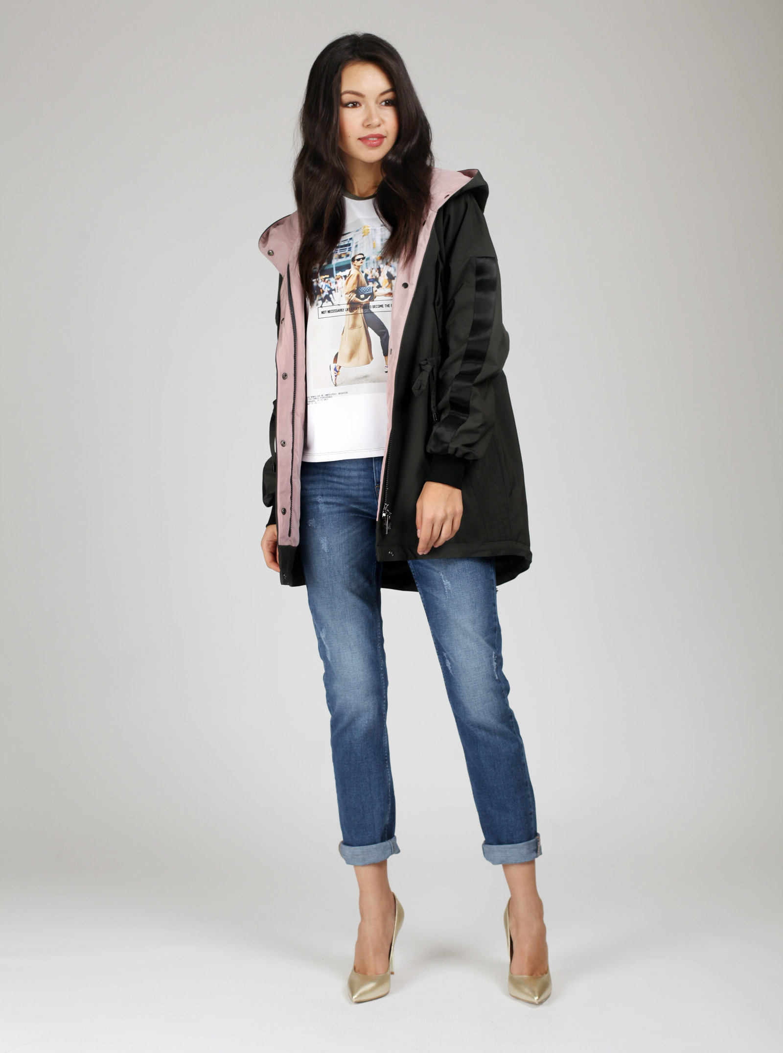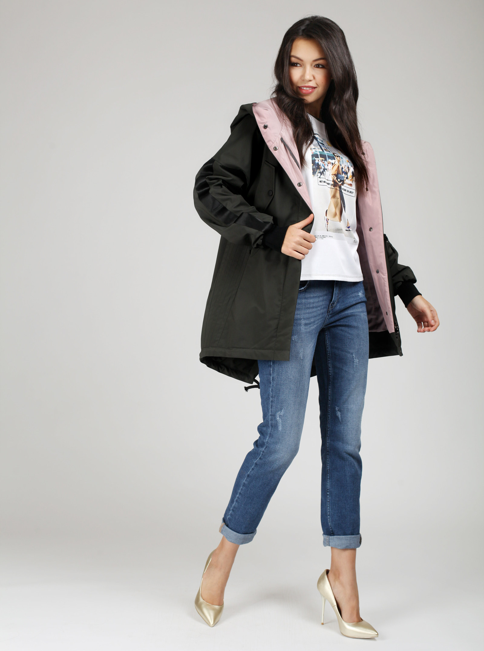 Удлиненная куртка-парка на тонком простеганном утеплителе, очень креативная, с нестандартной комбинацией цветов снаружи и внутри. Капюшон не съемный, объемный, с застежкой на кнопку в области горловины. По линии талии и по низу предусмотрены кулиски со шнурами, ими можно регулировать степень прилегания изделия. Вдоль рукава настрочена широкая черная лента, заканчивается он трикотажным манжетом такого же цвета. На изделии огромное количество карманов, четыре из них снаружи, один внутри. Все они имеют застежку.